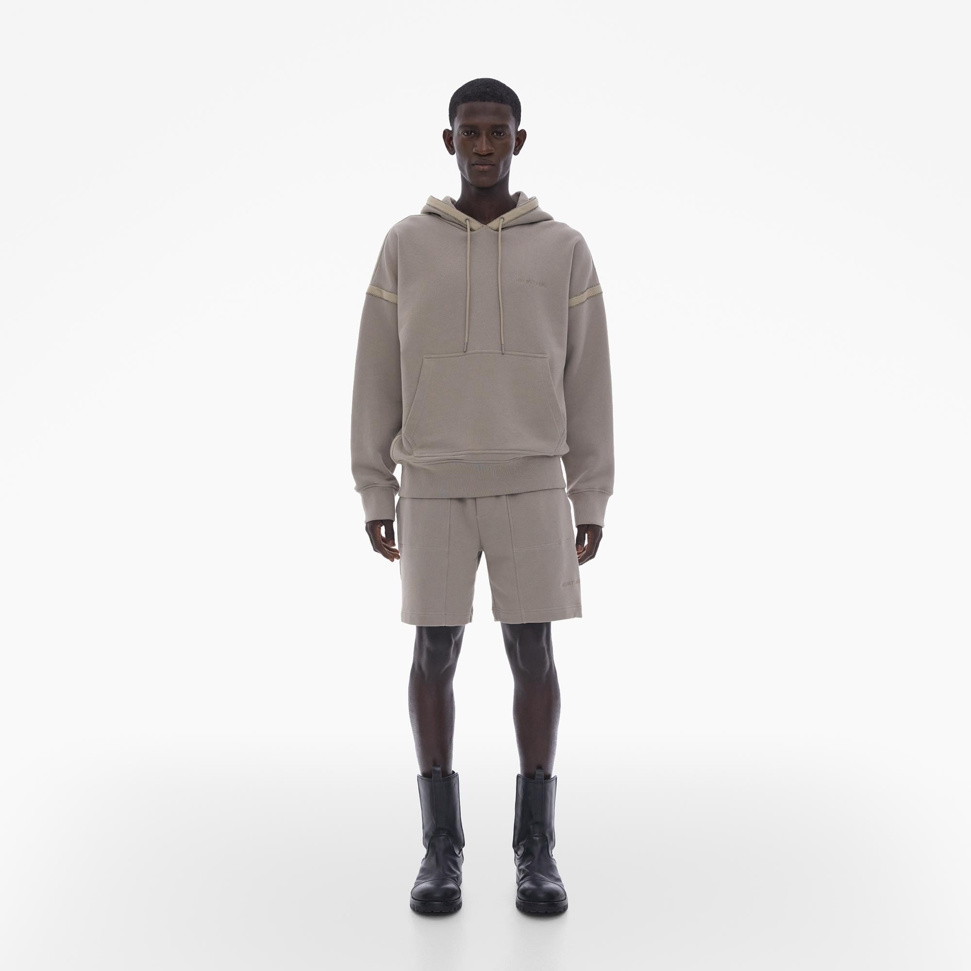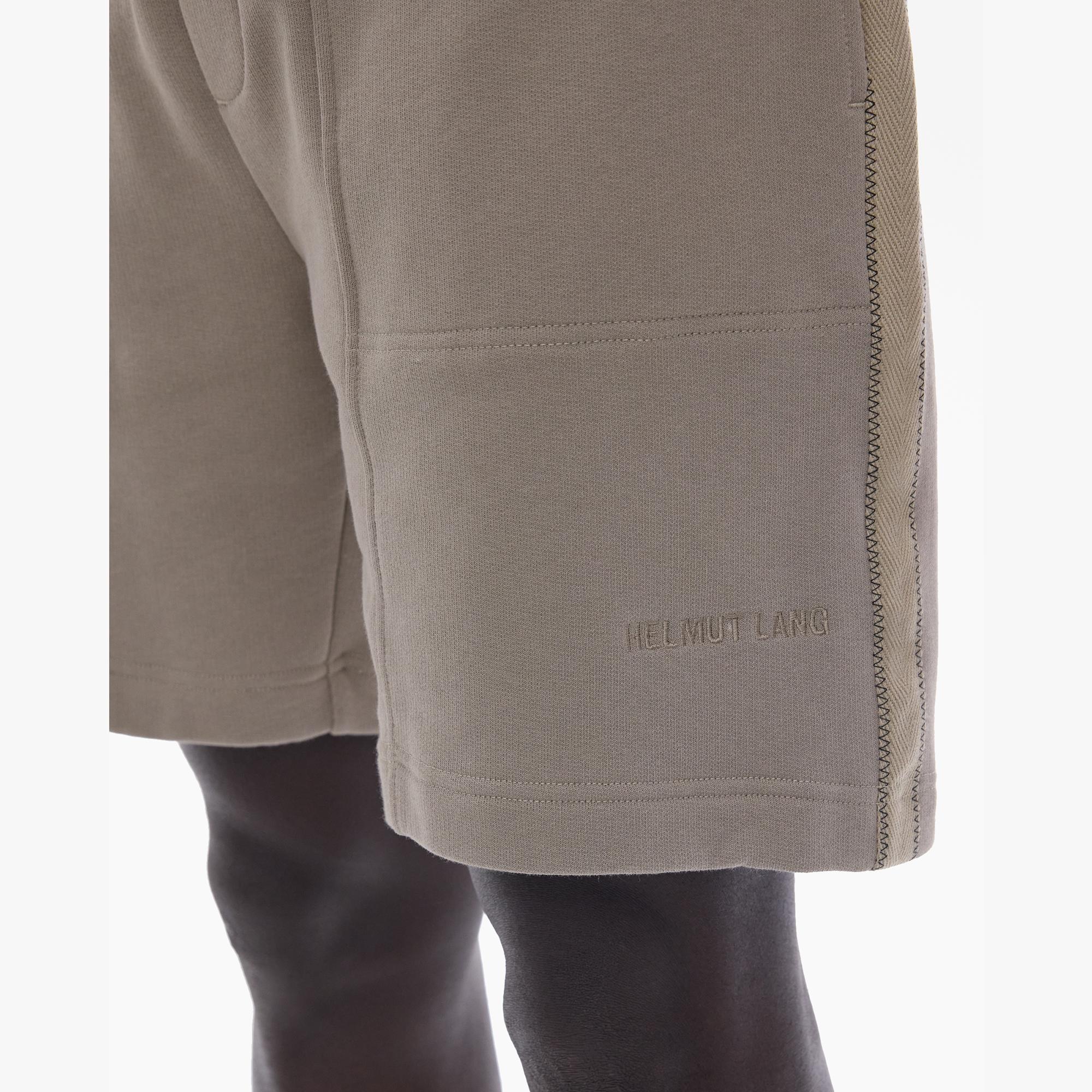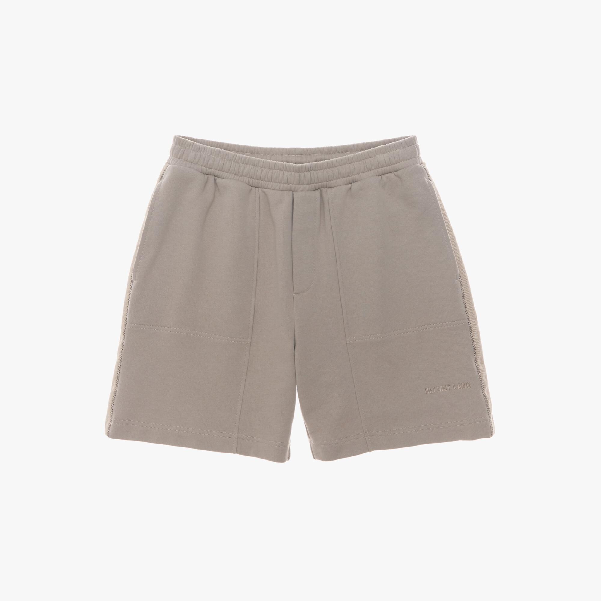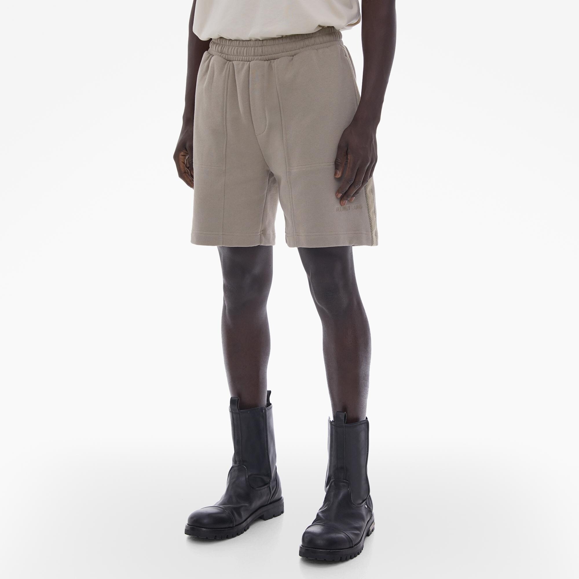 The Helmut Lang Short is a terry cotton pull-on style with a drawstring waistband, slash pockets, back patch pocket, topstitched tape trim, and a tonal embroidered HL logo at the wearer’s left leg.