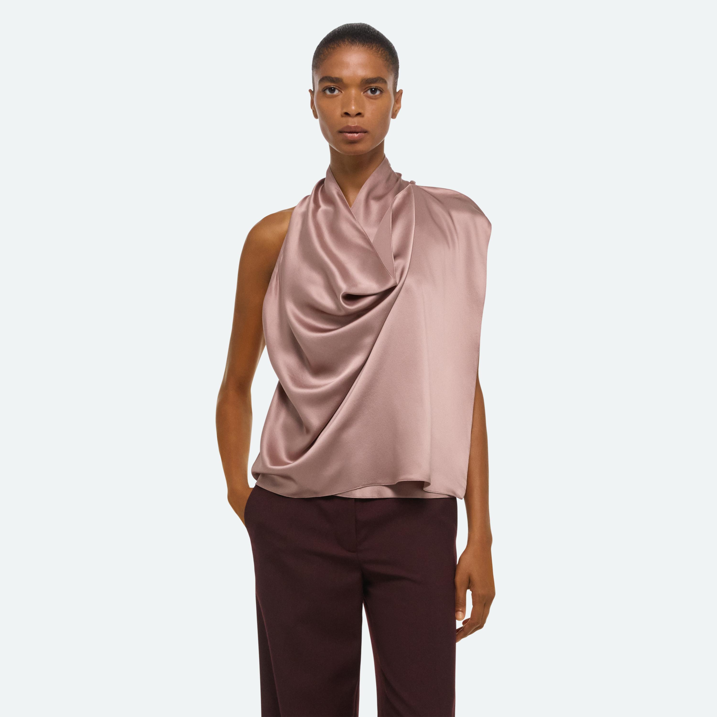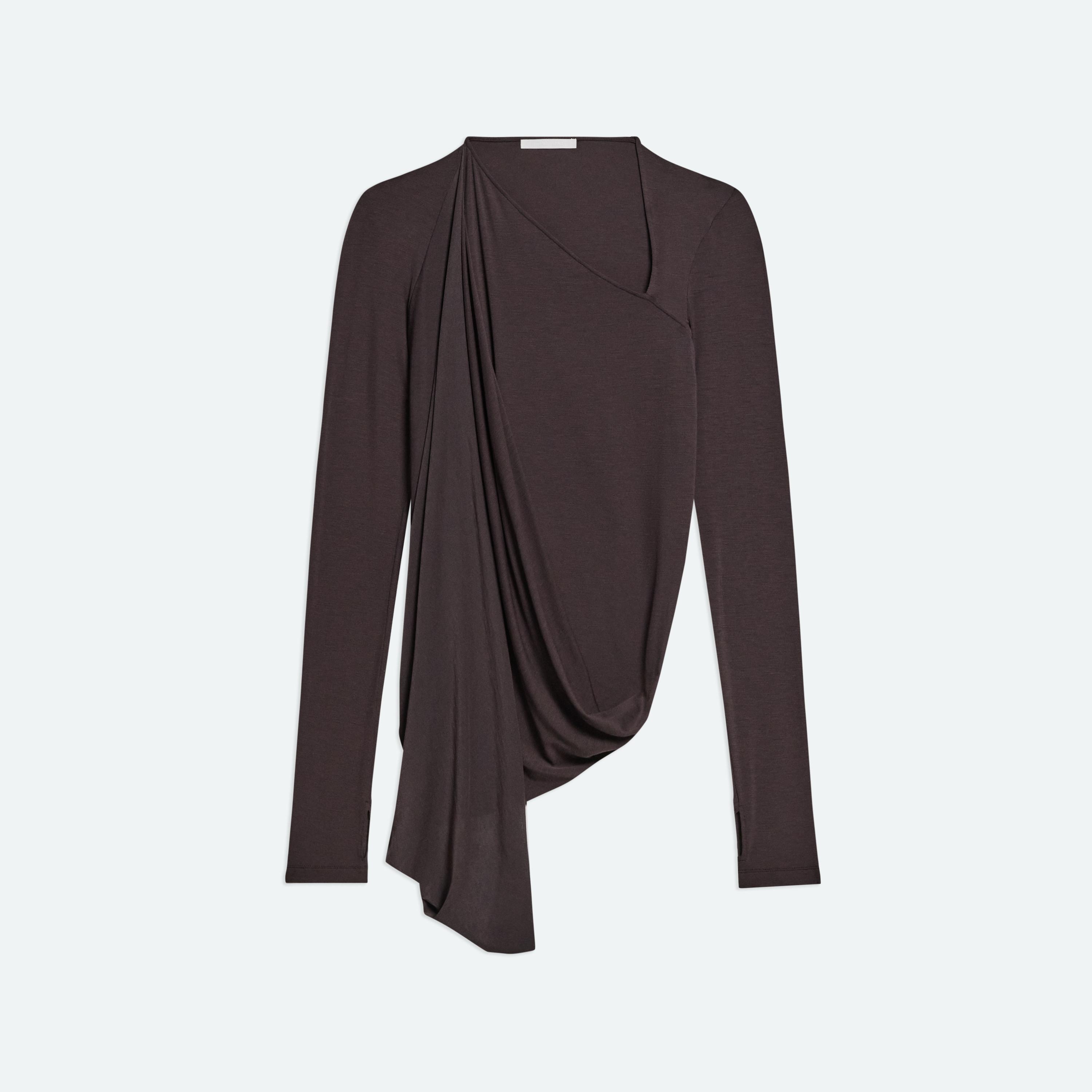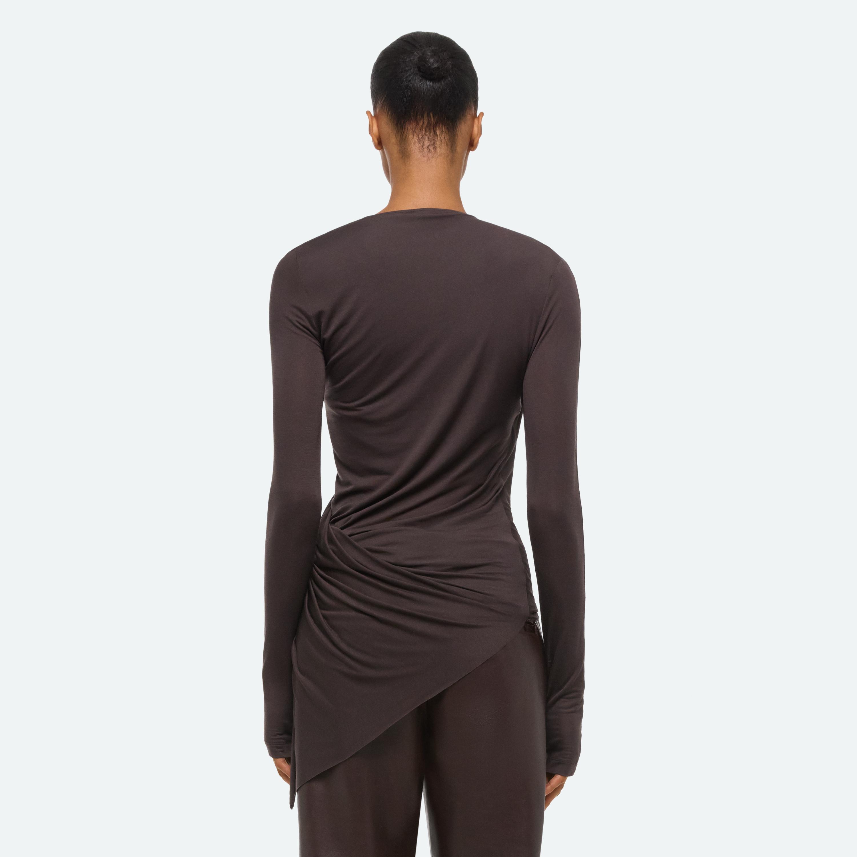 Jersey styles gather and twist fluidly, sculpting through drape and seam. Mahogany lamb leather bonded for comfort and structure are finished with adjustable tailoring at the waist.