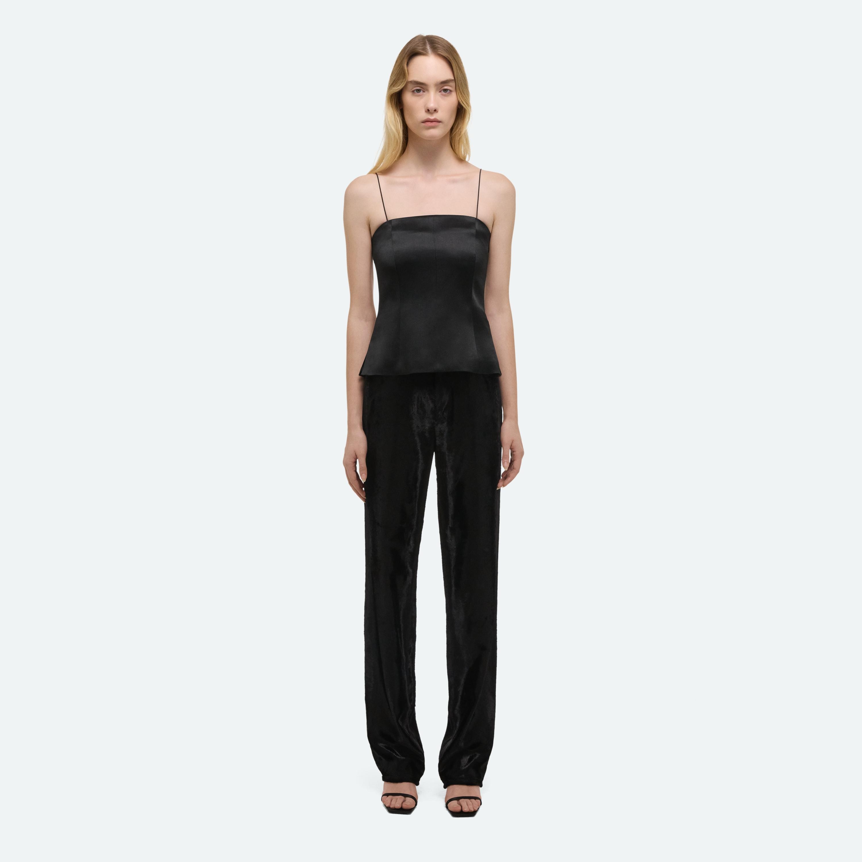MIDNIGHT BLACK BIAS-CUT SILK AND SHEER CHIFFON INLAYS PLAY WITH DEPTH AND TRANSPARENCY, WHILE SCULPTED SATIN TAILORING SHARPENS. SOFTNESS MEETS PRECISION IN FORM.