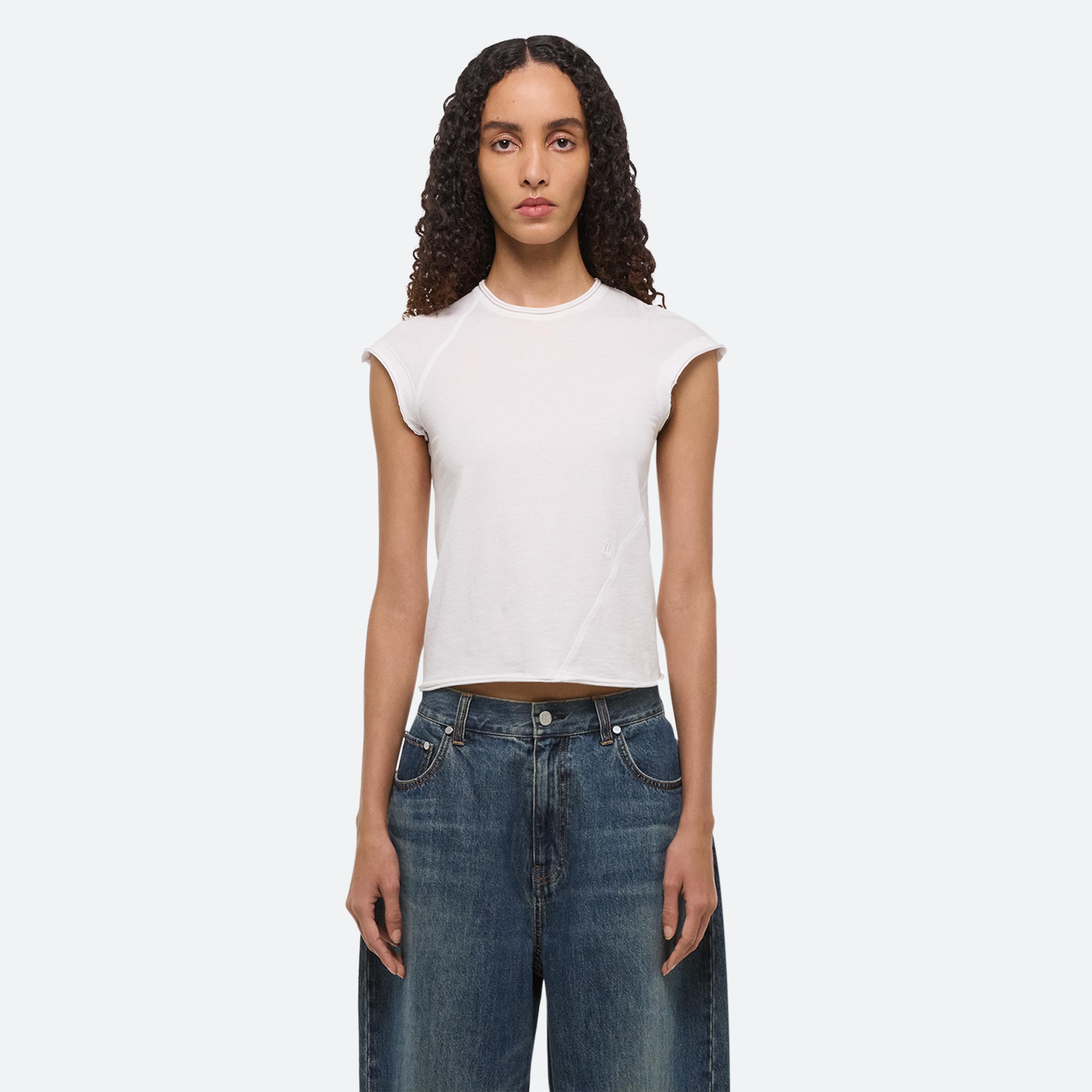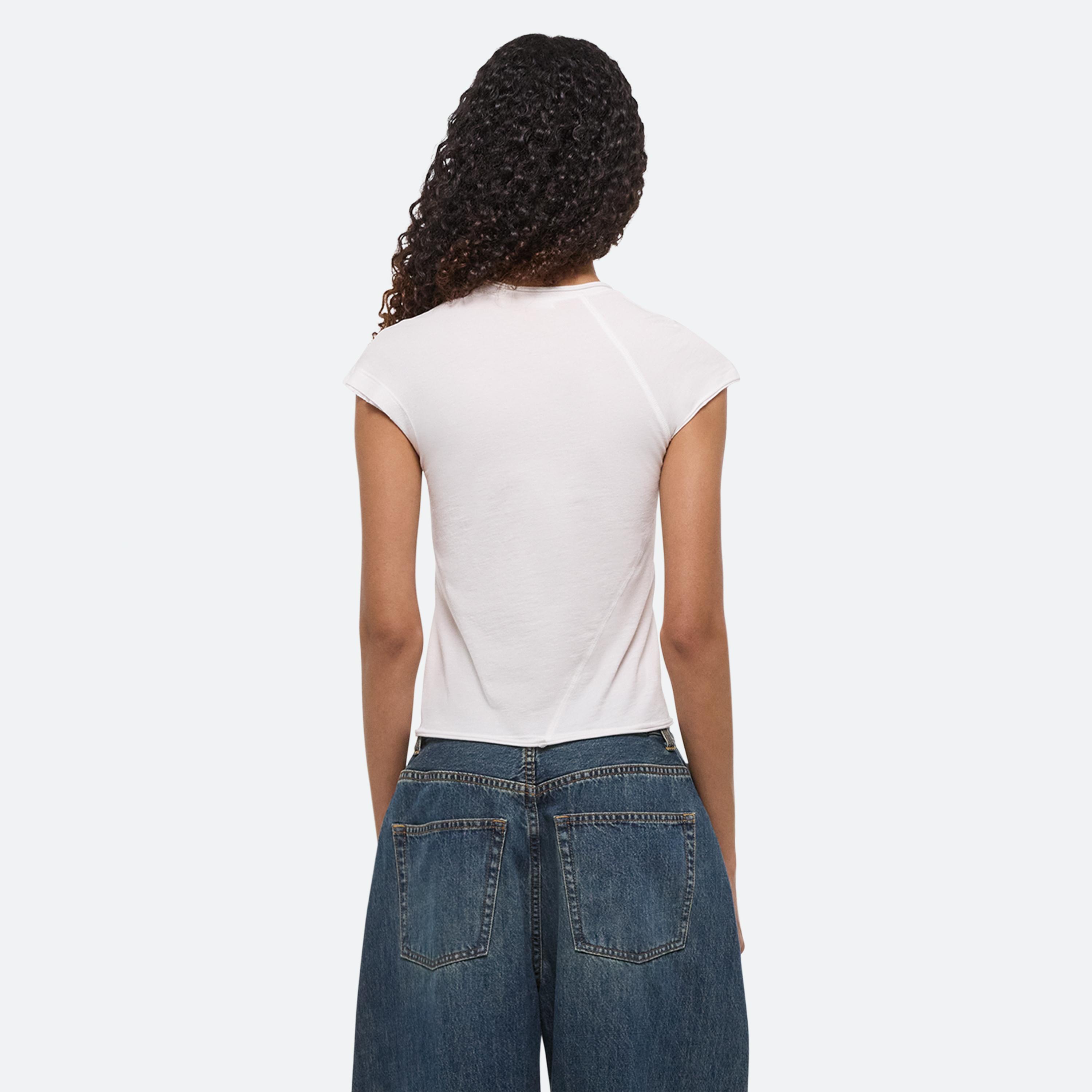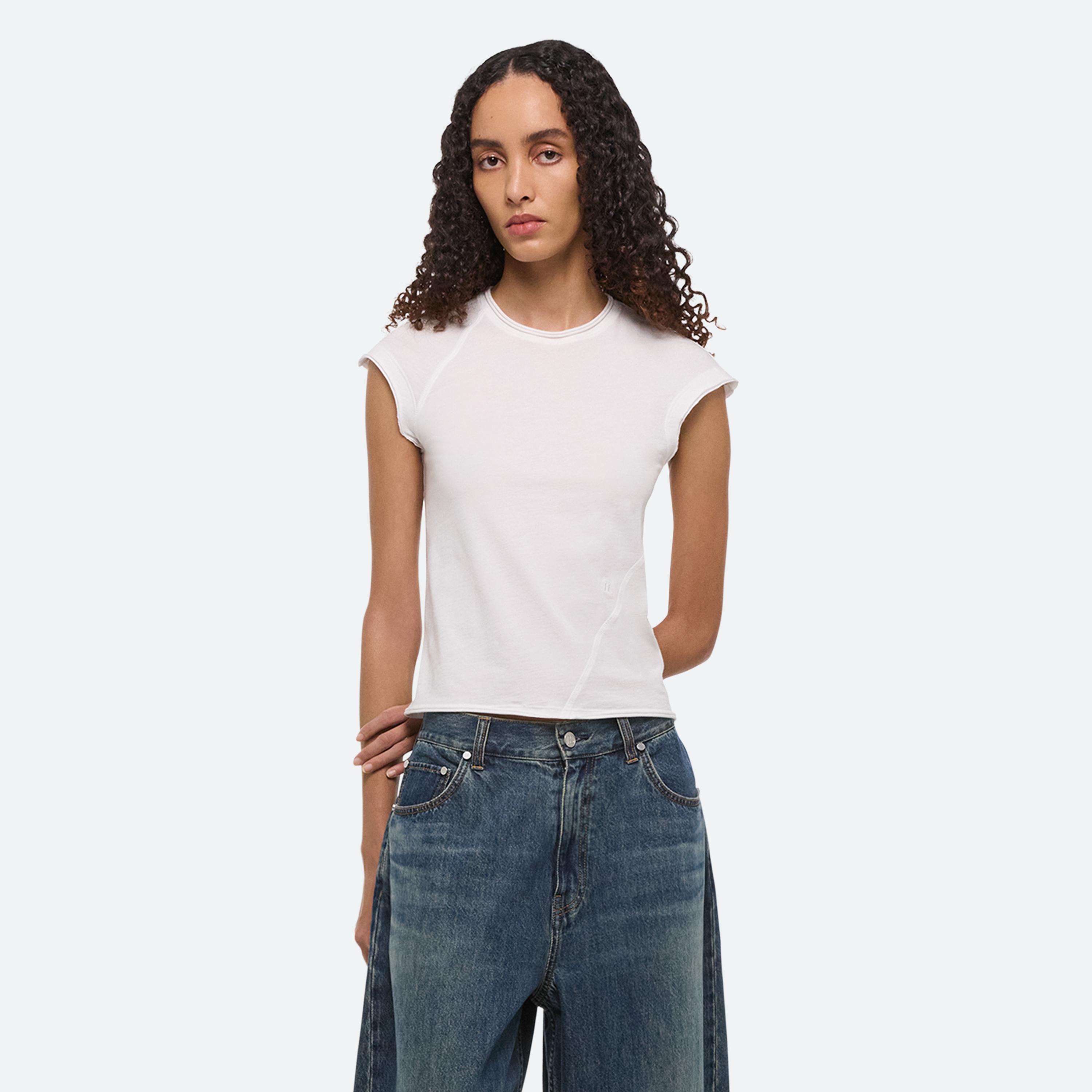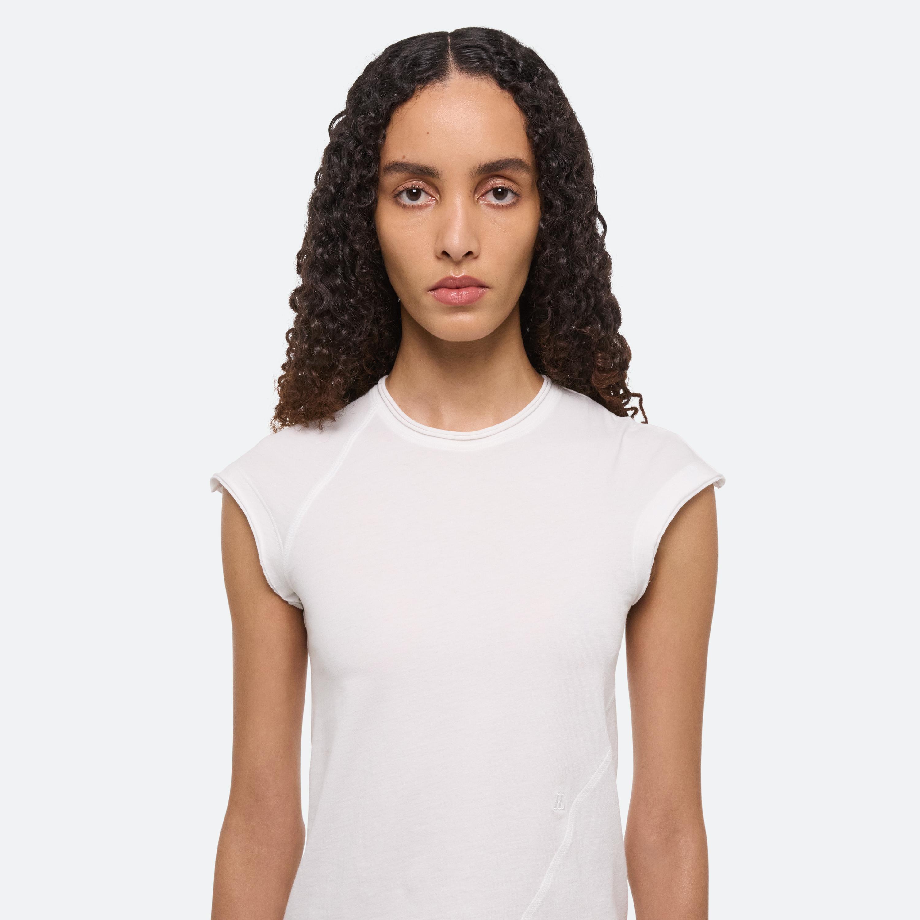 A classic cotton t-shirt is the anchor of every wardrobe. Recast in simplicity, two new silhouettes arrive with intention–long- and cap-sleeve–cut close in featherweight jersey with seams that wrap around the body. Pair it with a transformable skirt: a pleated overlay that can be removed to reveal logo waist shorts beneath.