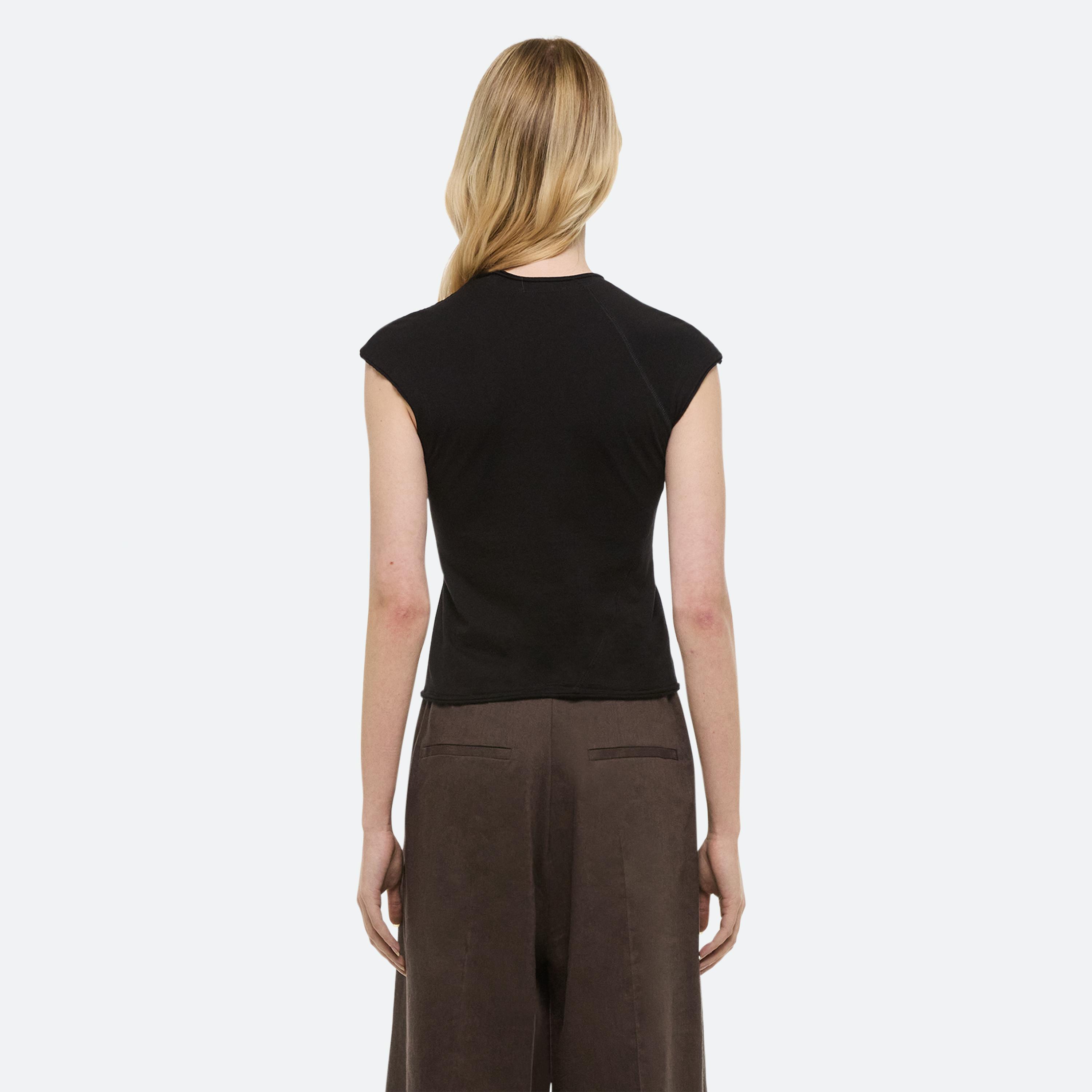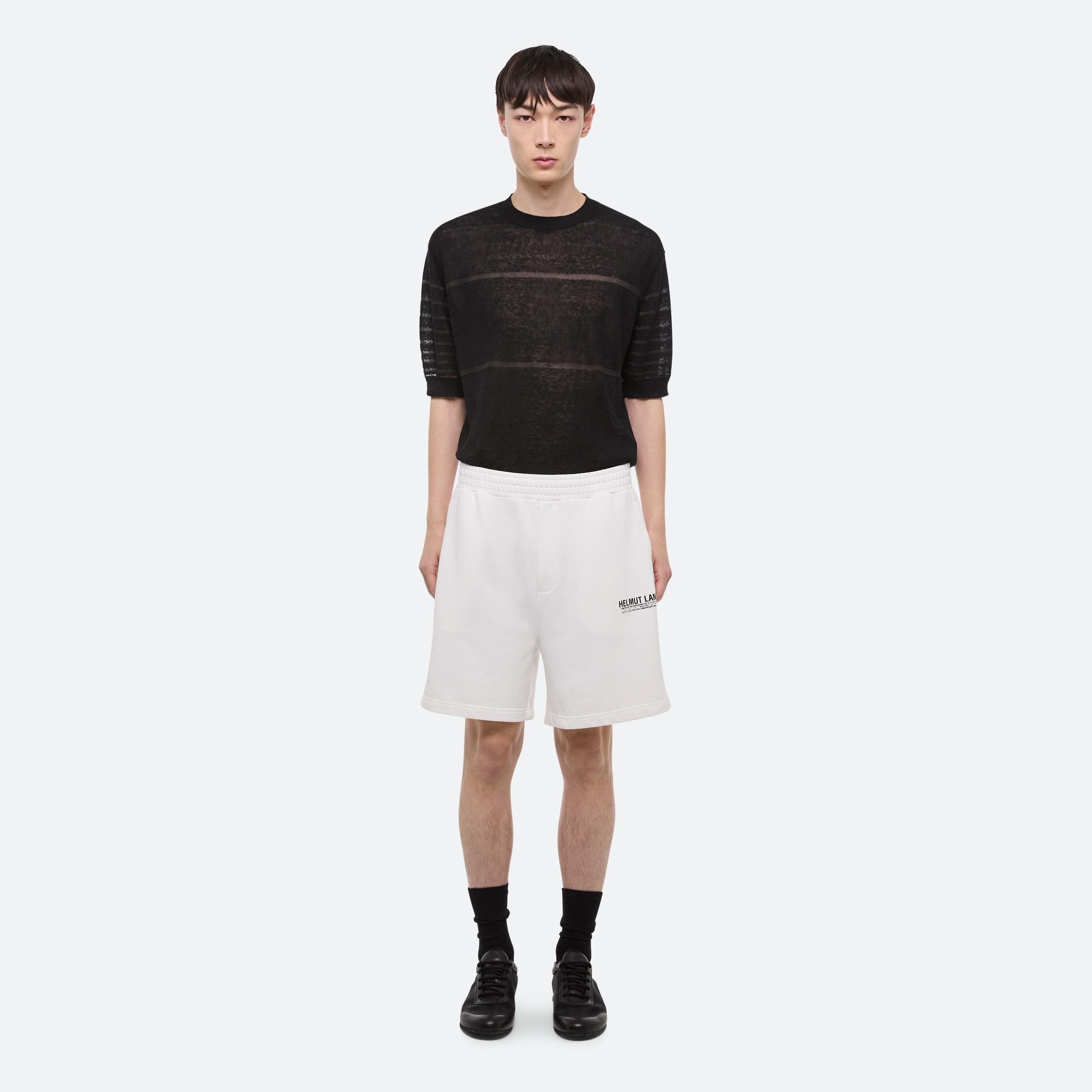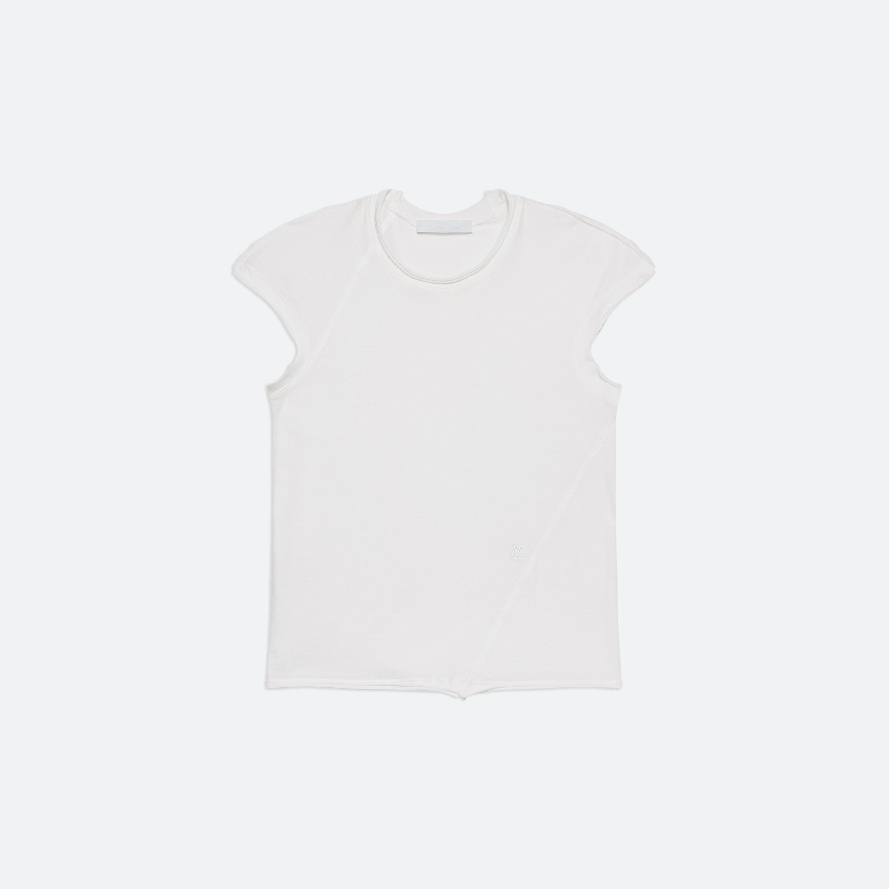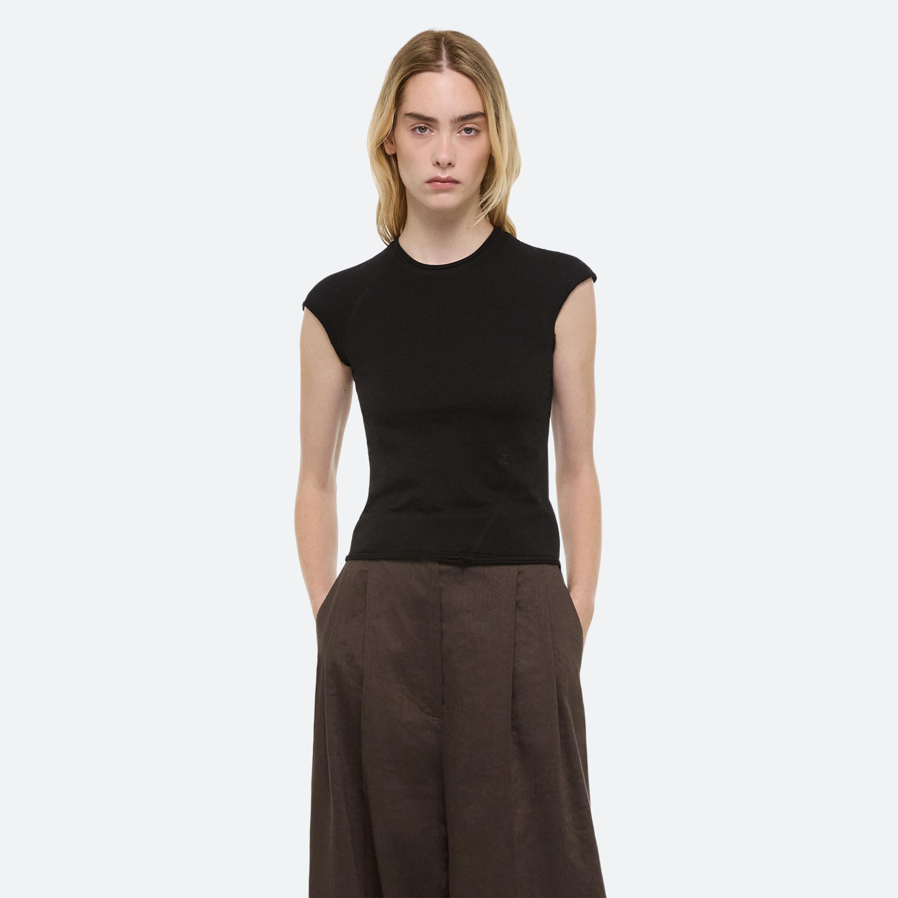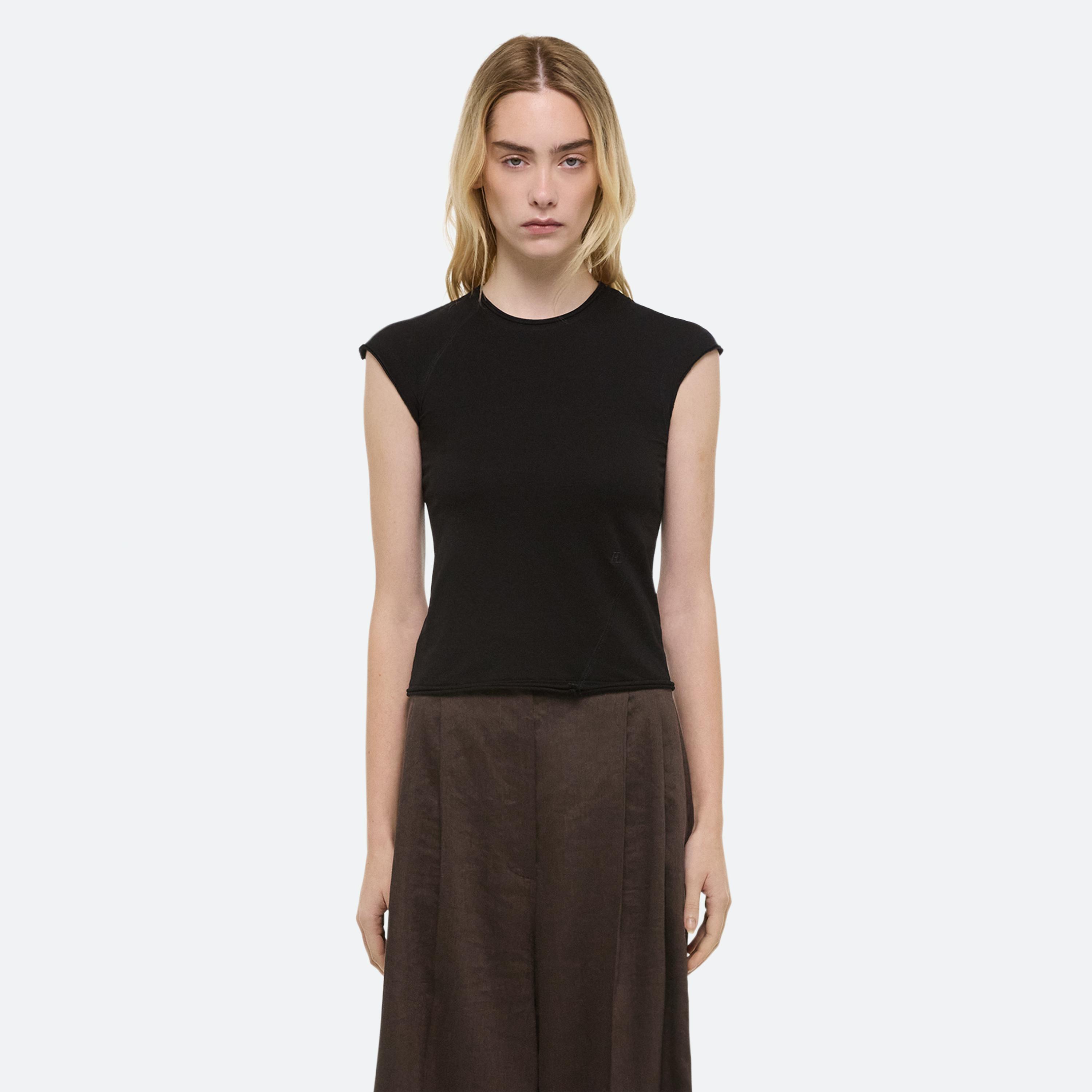 A classic cotton t-shirt is the anchor of every wardrobe. Recast in simplicity, two new silhouettes arrive with intention–long- and cap-sleeve–cut close in featherweight jersey with seams that wrap around the body. Pair it with a transformable skirt: a pleated overlay that can be removed to reveal logo waist shorts beneath.