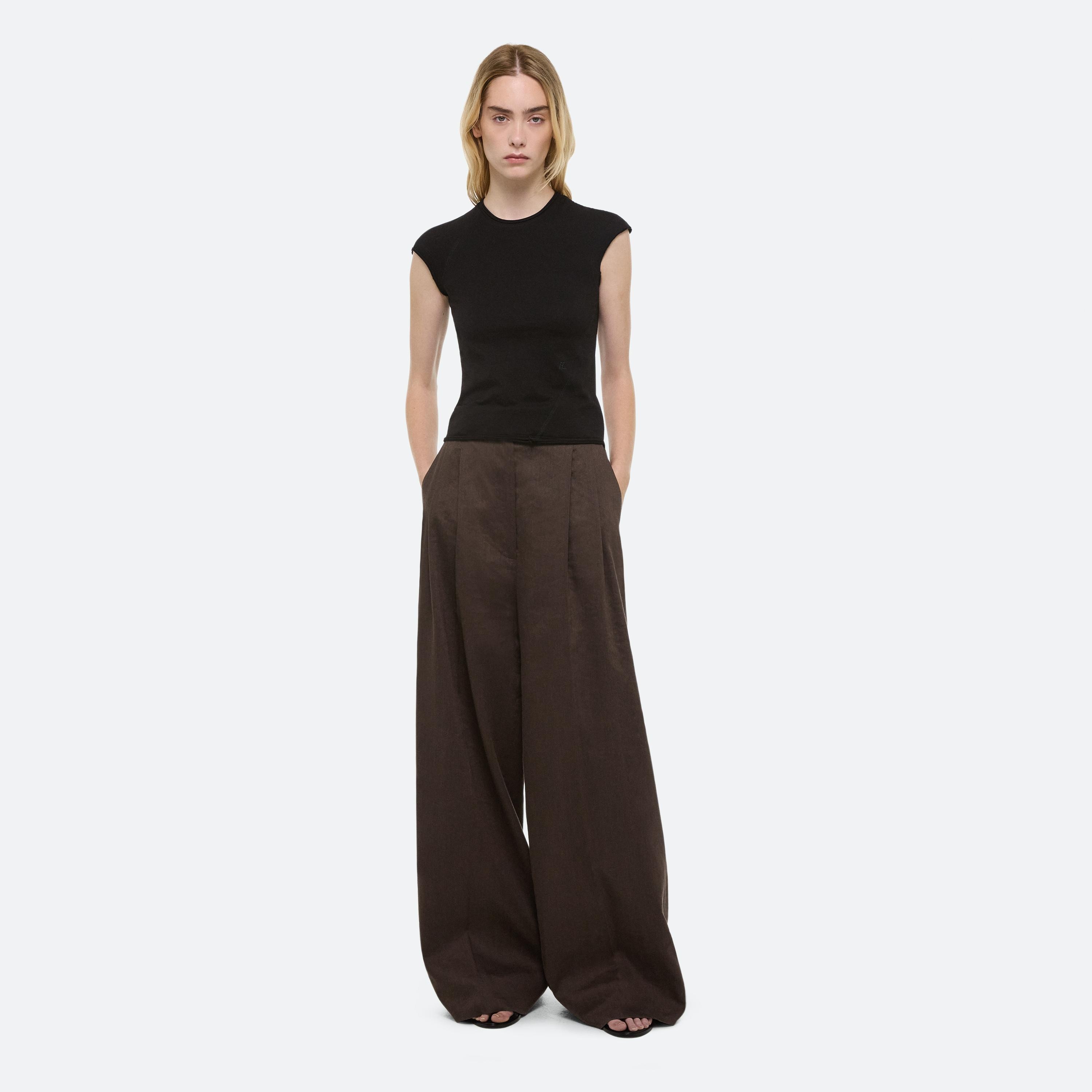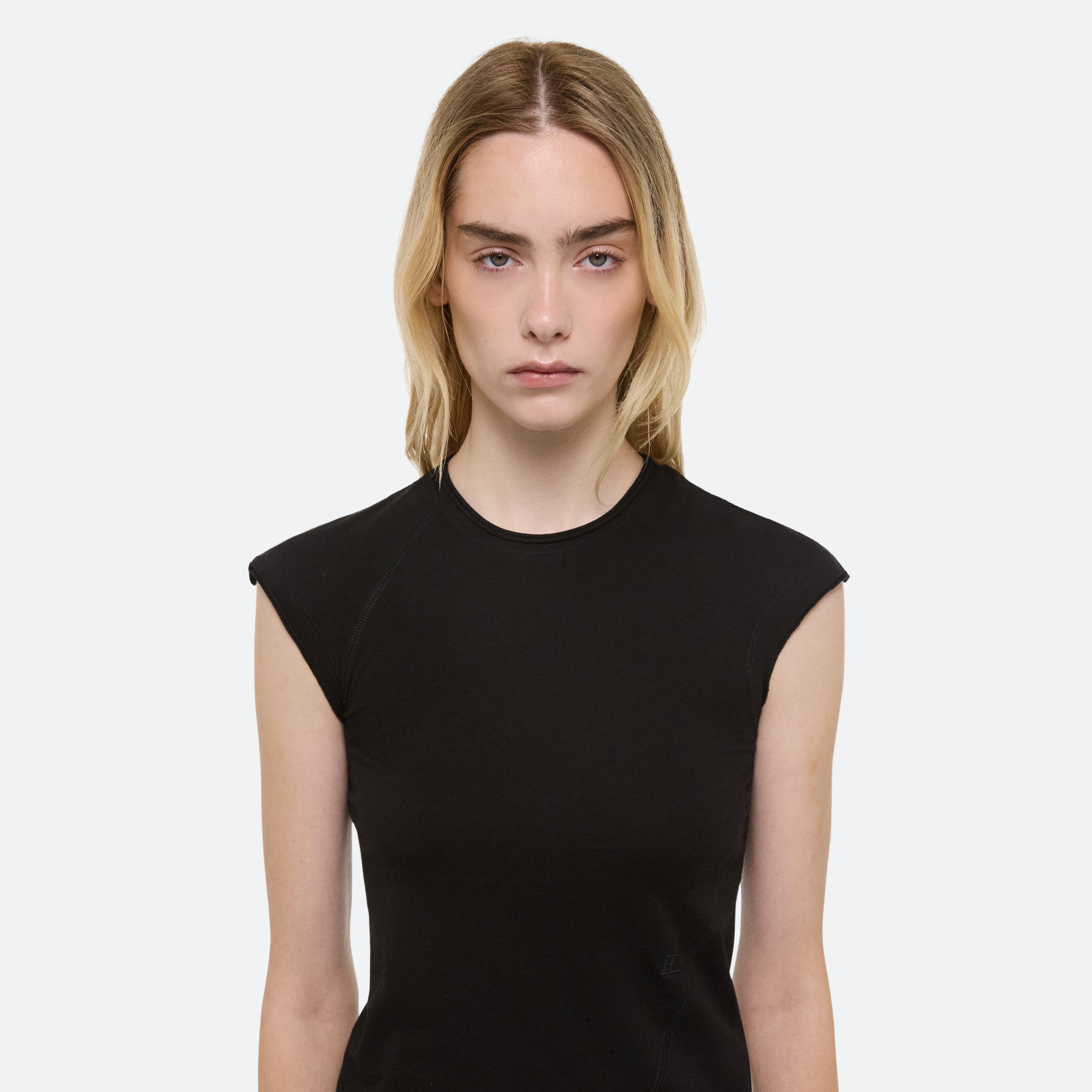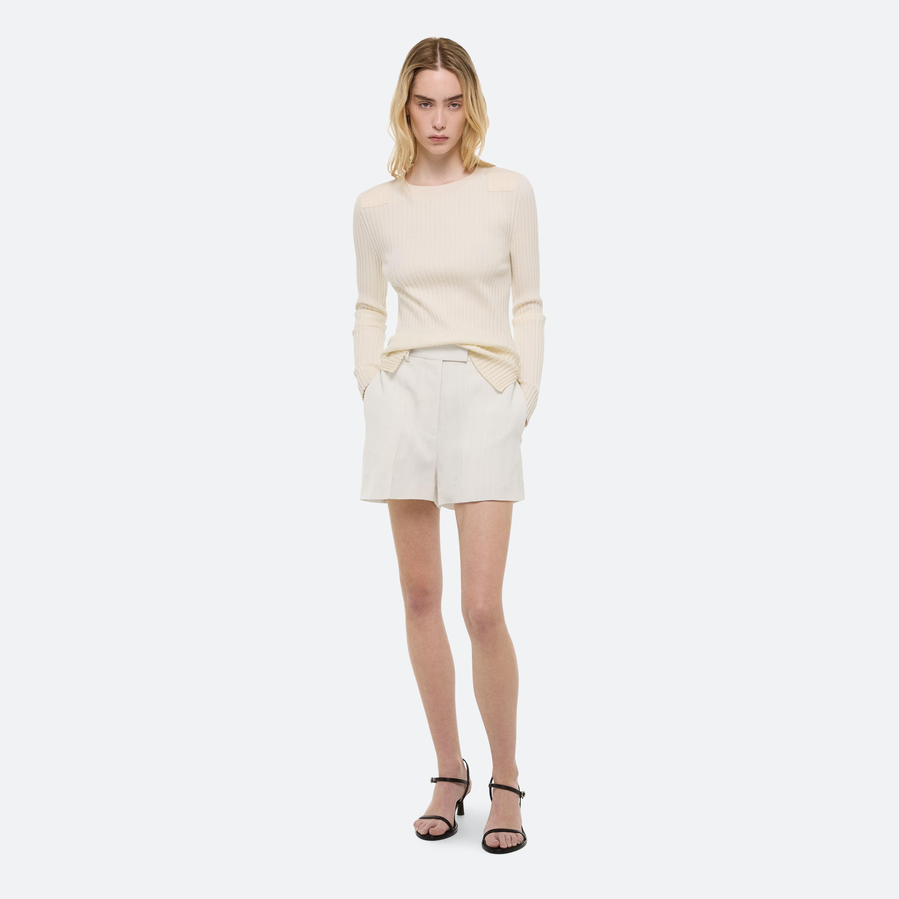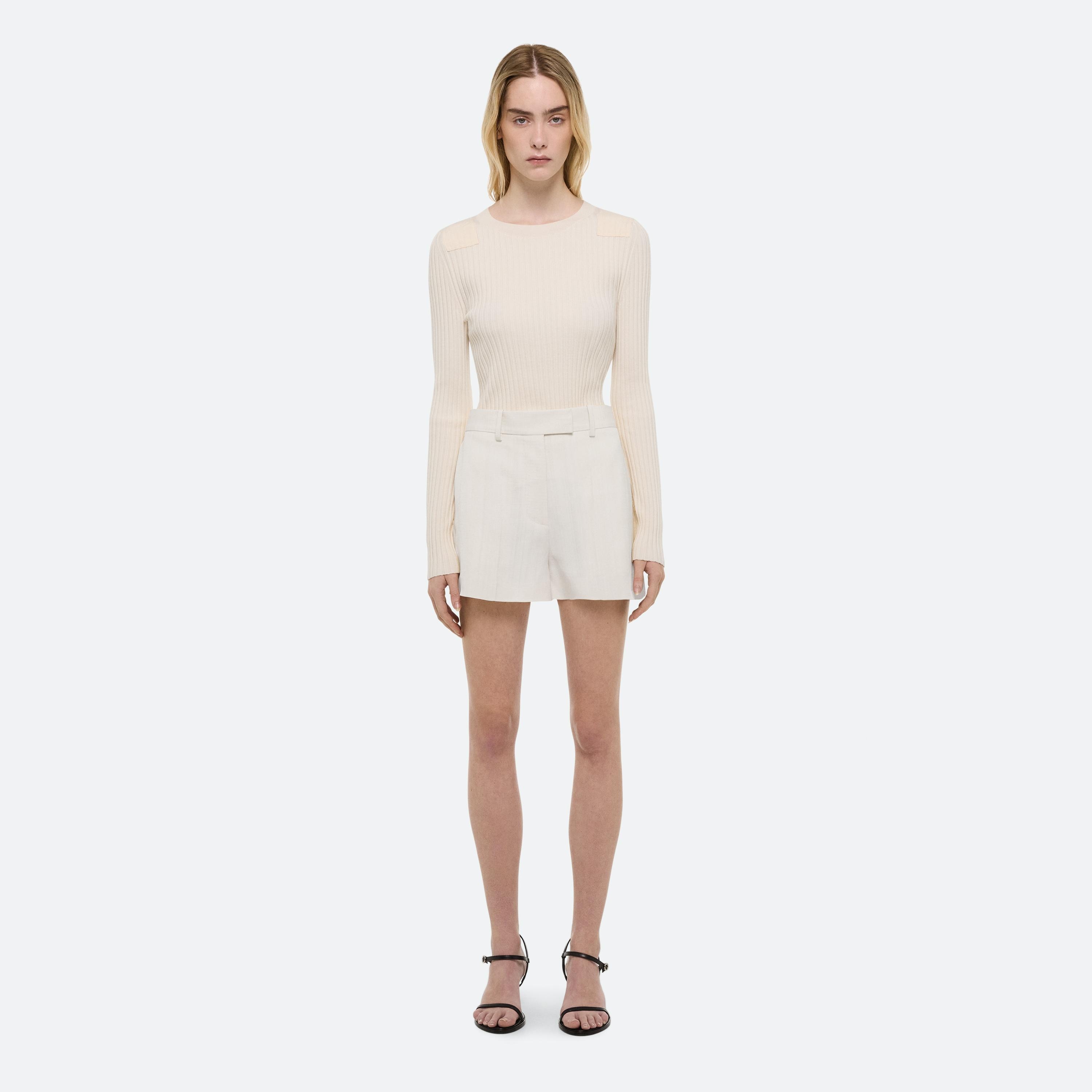 FINE KNIT: Slinky, ribbed knits recall Helmut Lang’s archival sport codes—woven from a silky stretch yarn into twisted racerback silhouettes with traveling rib details that contour the body. The dress, with a heavier hem, falls with a beautiful drape. The effect: a subtle interplay of polish and performance.