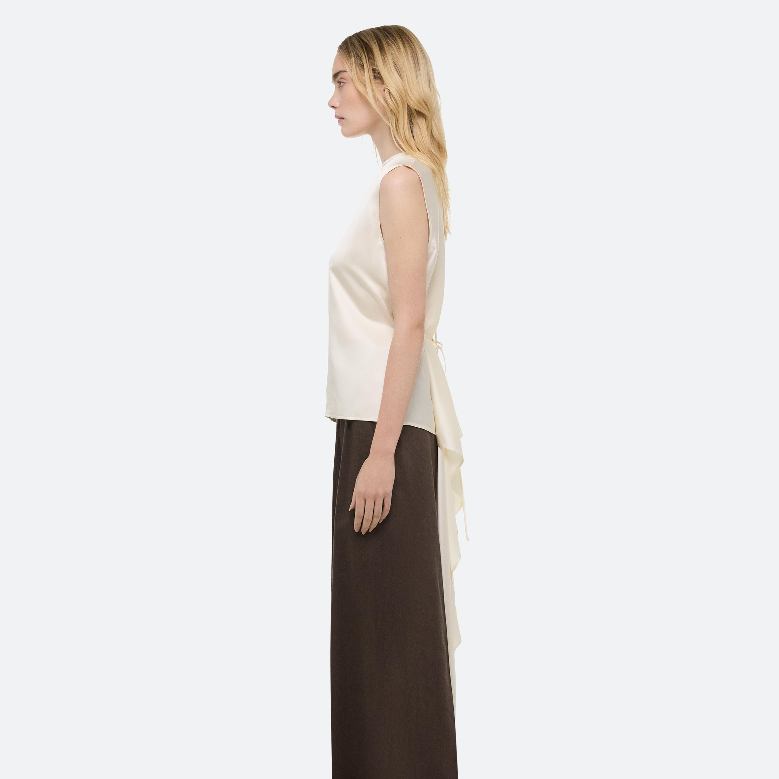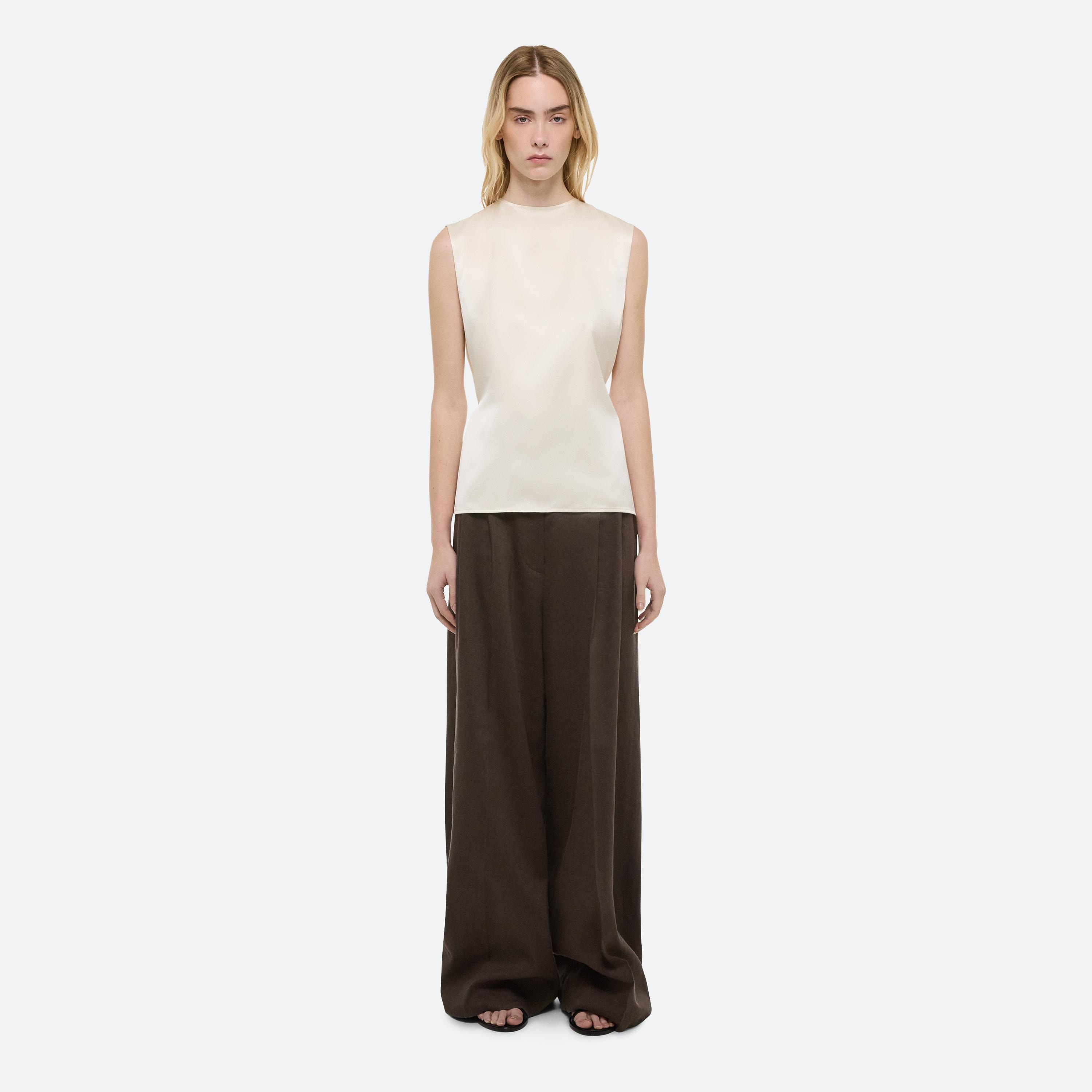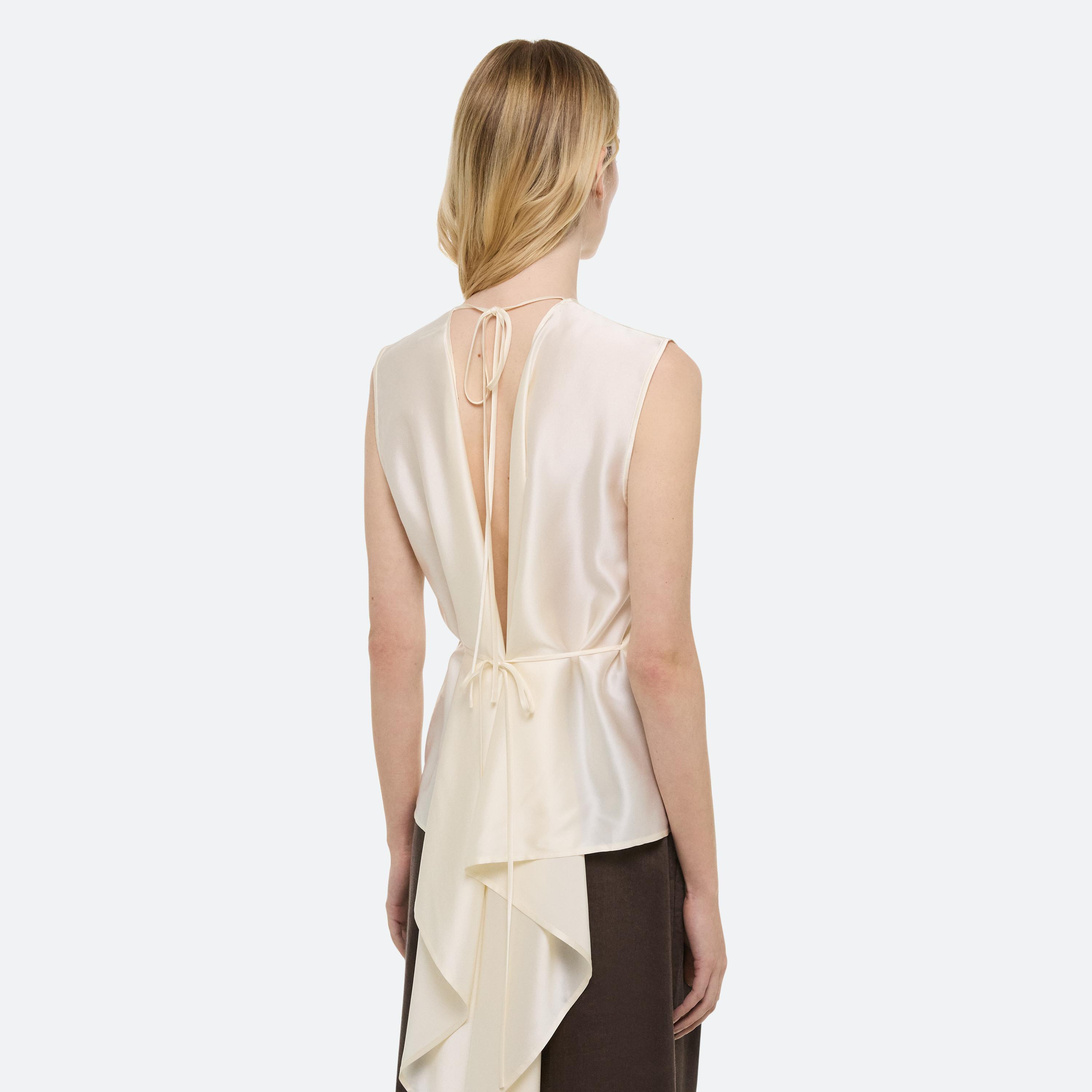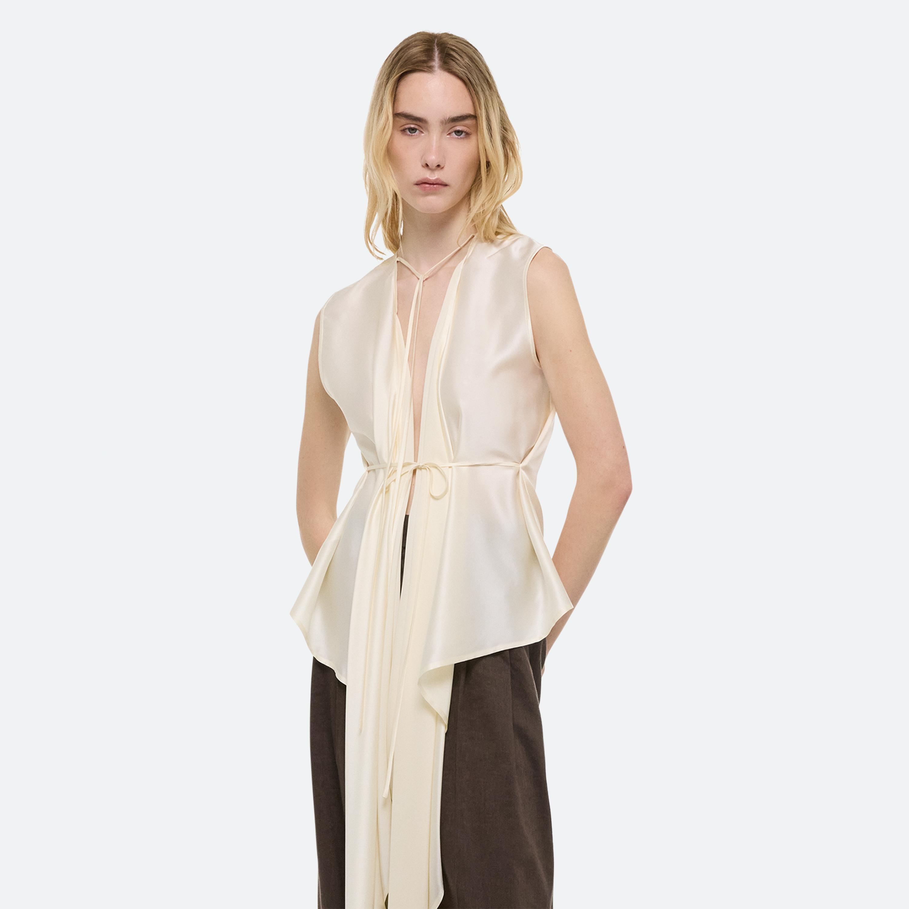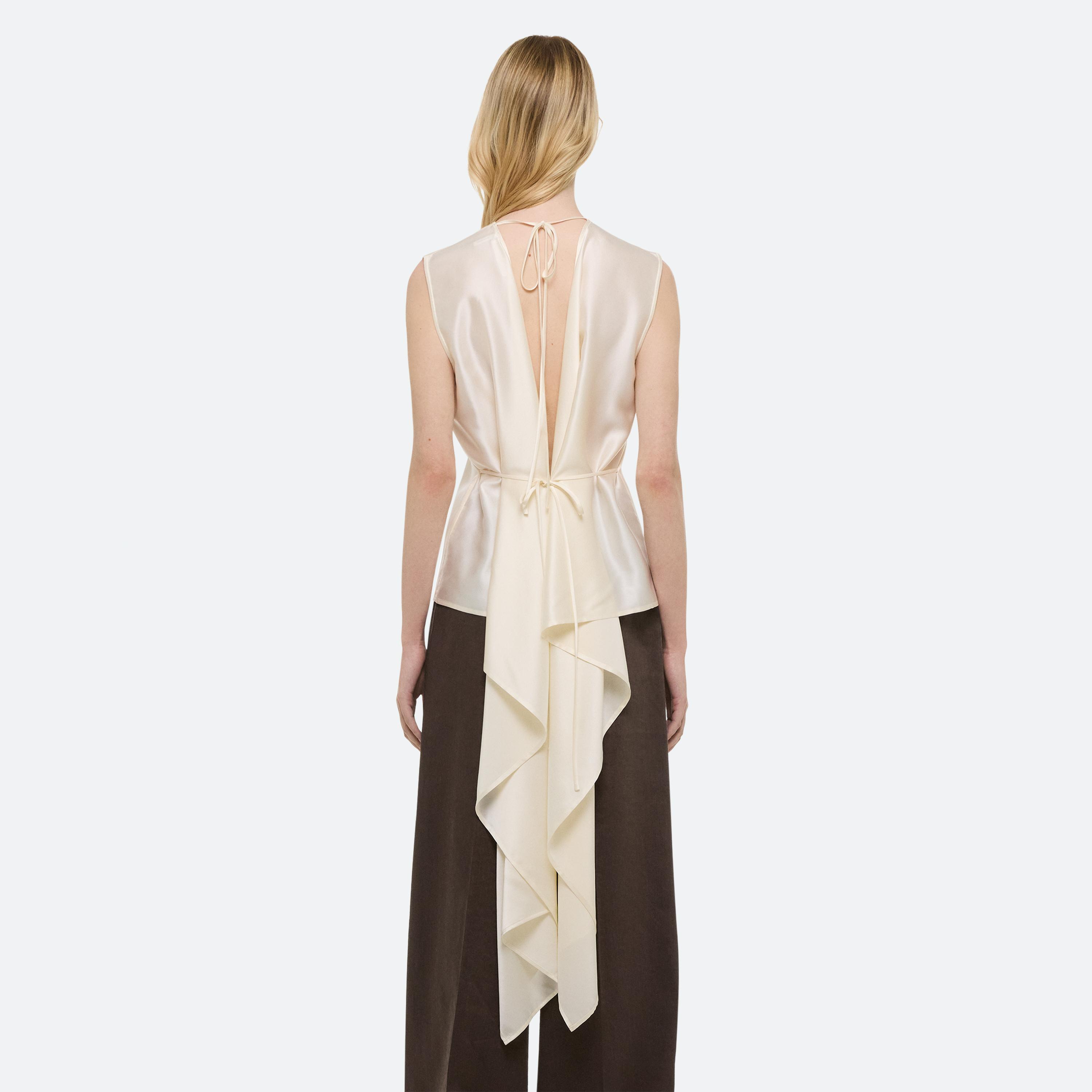 Summer dressing thrives on contrast—casual on the bottom, elevated up top. For women, a relaxed pleated jean anchors a draped scarf top, designed to be worn front or back. For men, a fluid silk button-up meets crisp cotton trousers—a refined take on ease, from day to night.
