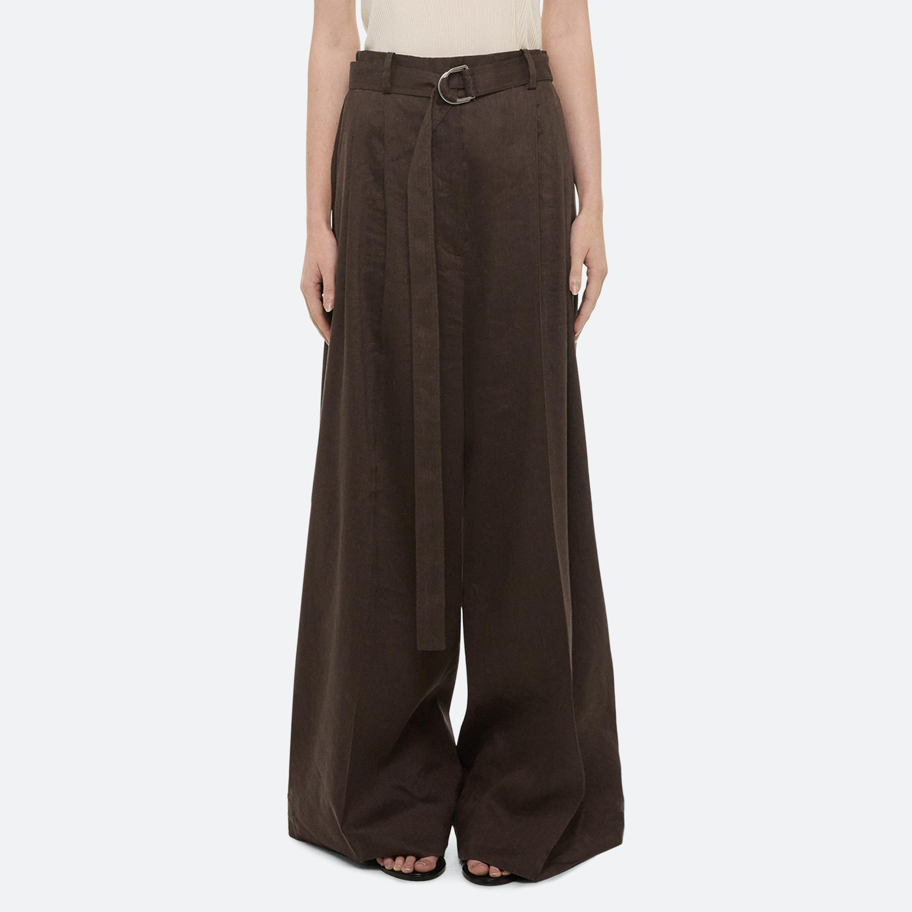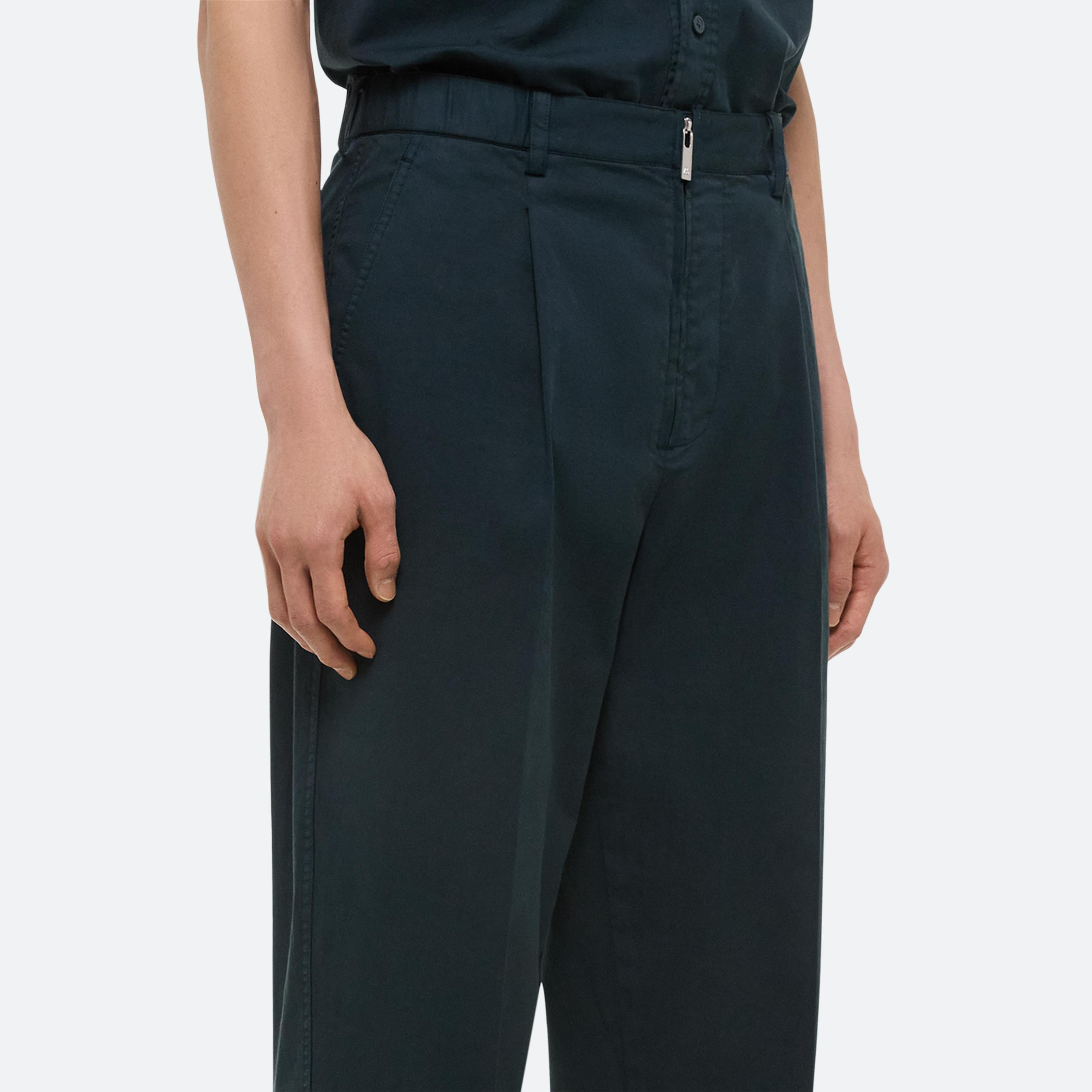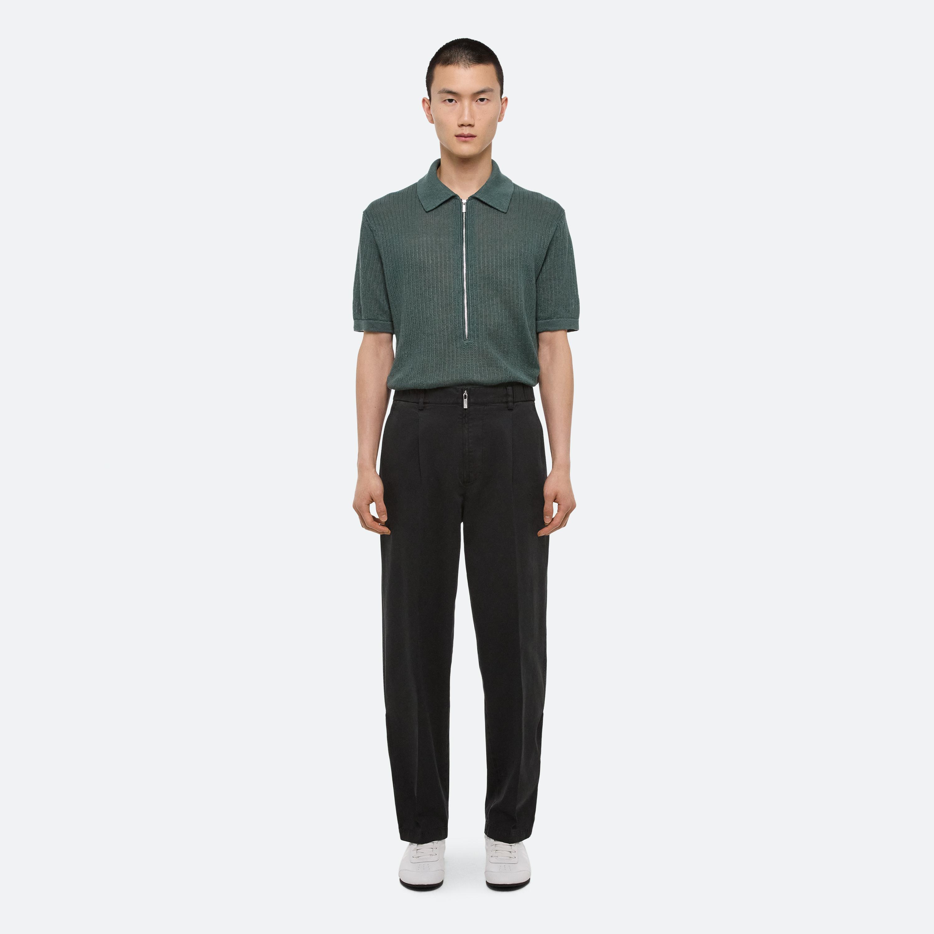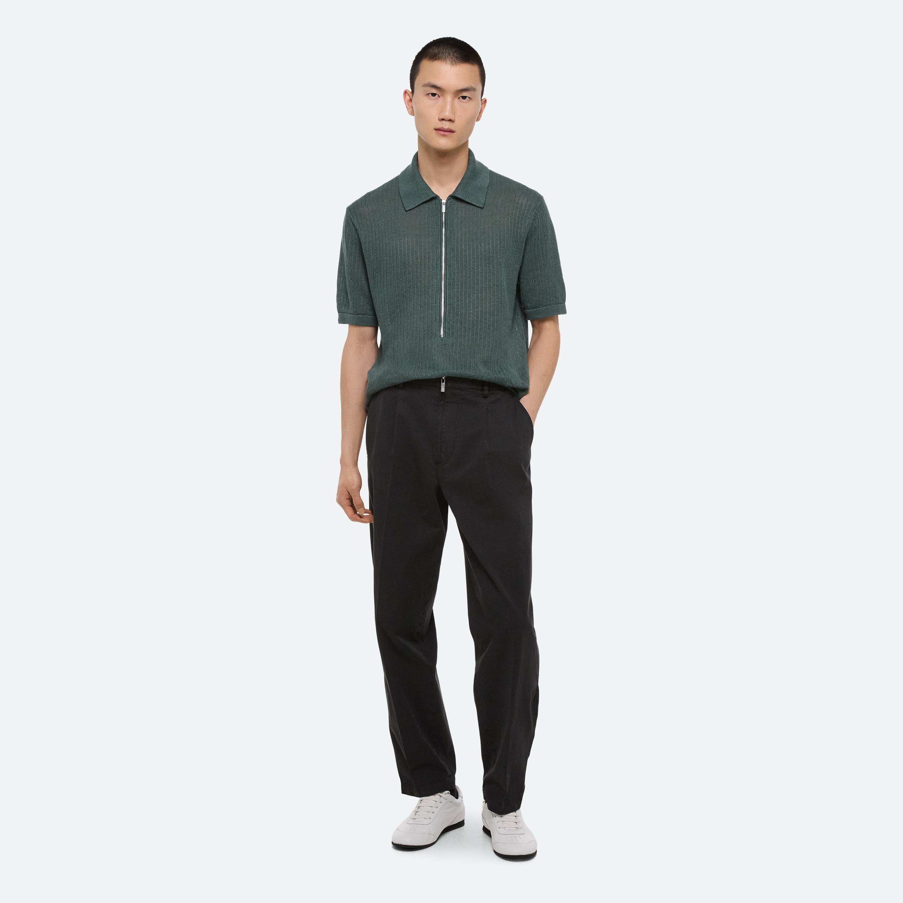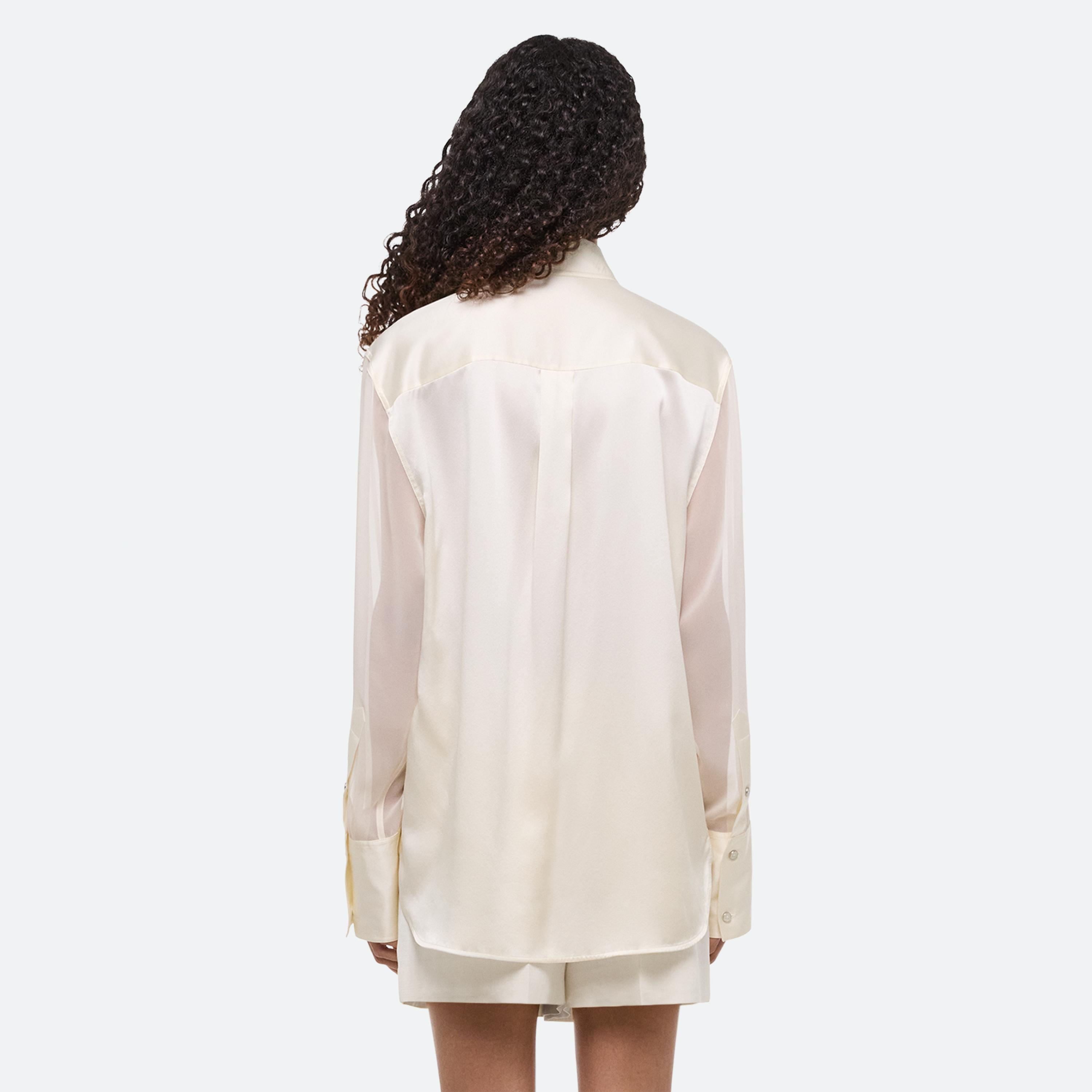 Summer dressing thrives on contrast—casual on the bottom, elevated up top. For women, a relaxed pleated jean anchors a draped scarf top, designed to be worn front or back. For men, a fluid silk button-up meets crisp cotton trousers—a refined take on ease, from day to night.