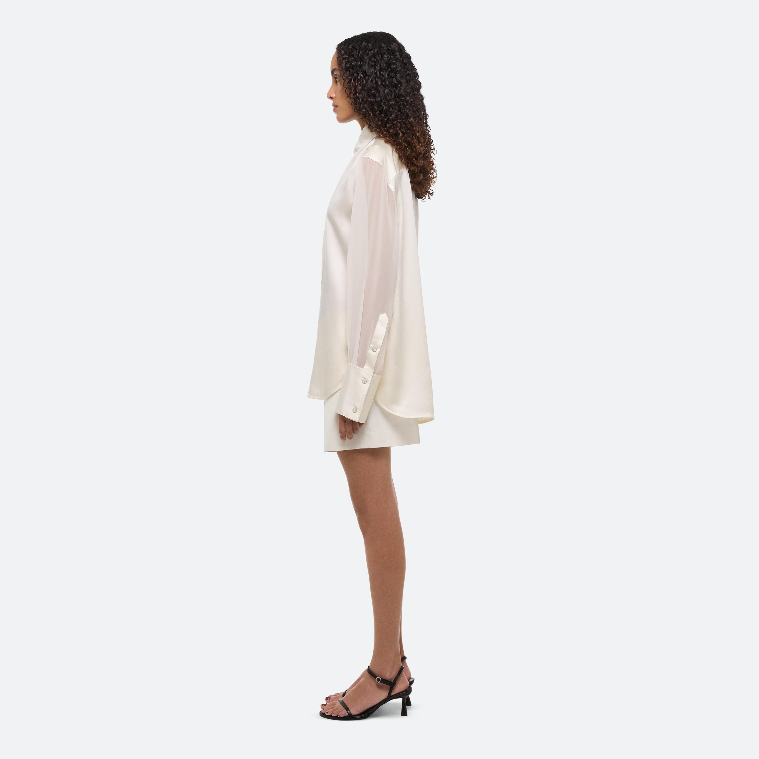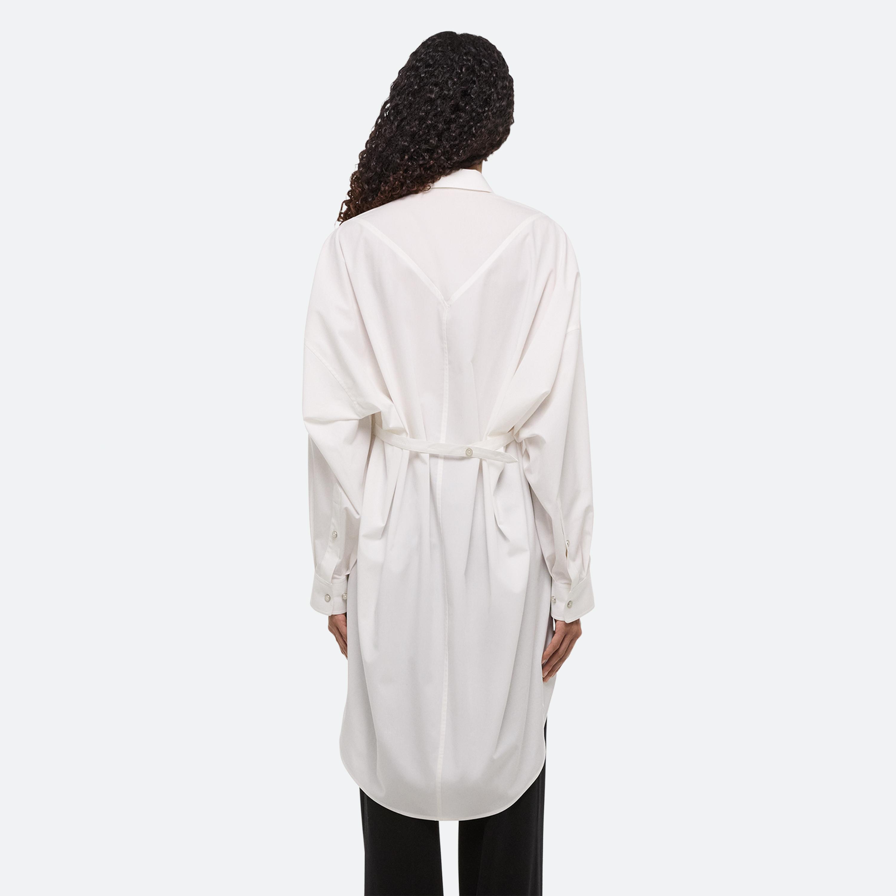 SUMMER WHITES: Precision meets softness in a curated set of all white looks for men and women. Laser-cut poplin is embroidered with quiet intention— branded initials stitched in the same shade for a sculptural effect—while malfilé fabric adds subtle shine, fluidity, and texture to tailored separates. The long women’s button up doubles as a dress for versatility.