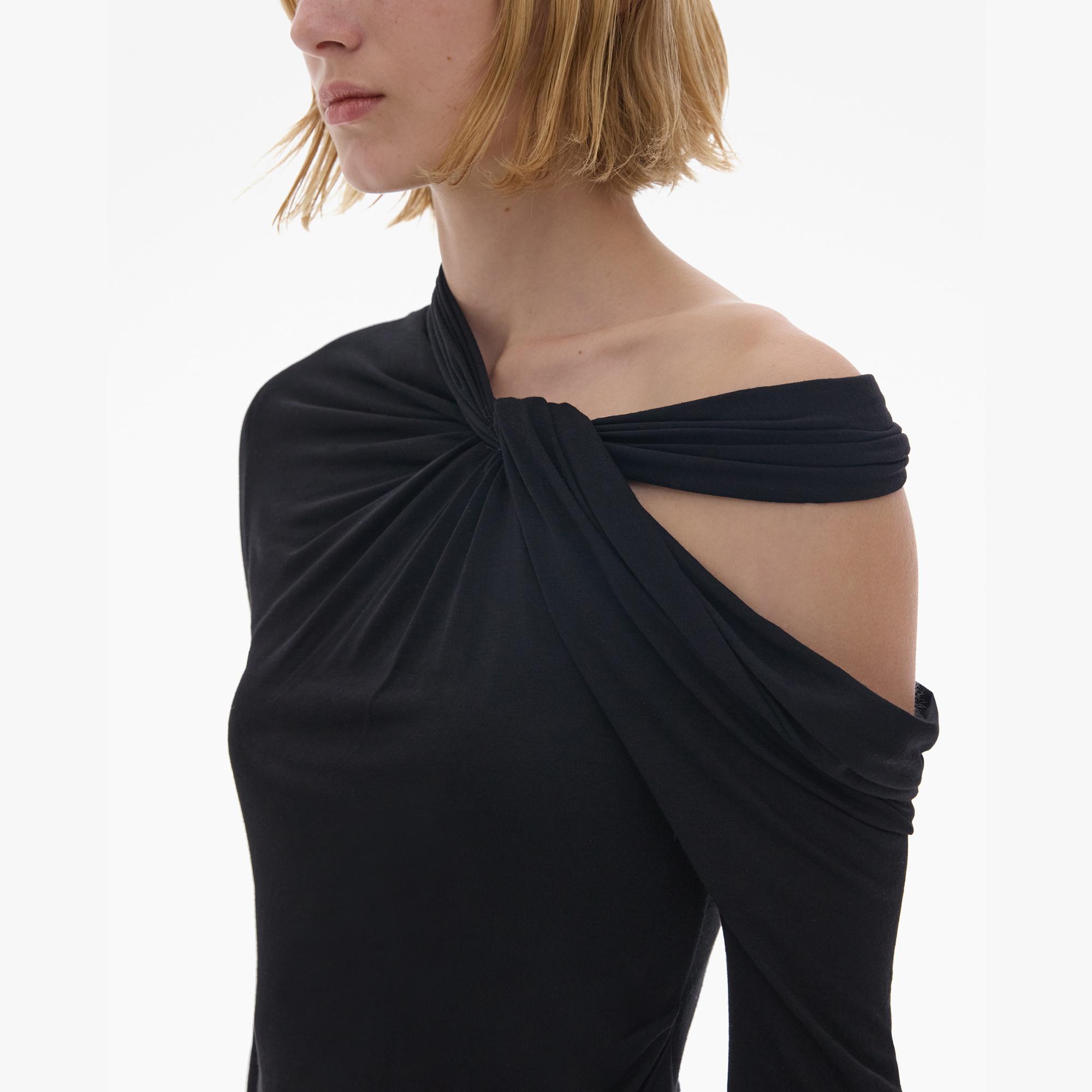 The Helmut Lang Mini Dress is a pull-over style in a light viscose jersey with an asymmetrical neckline, shoulder cut-out, long sleeves, and draped waist accents.