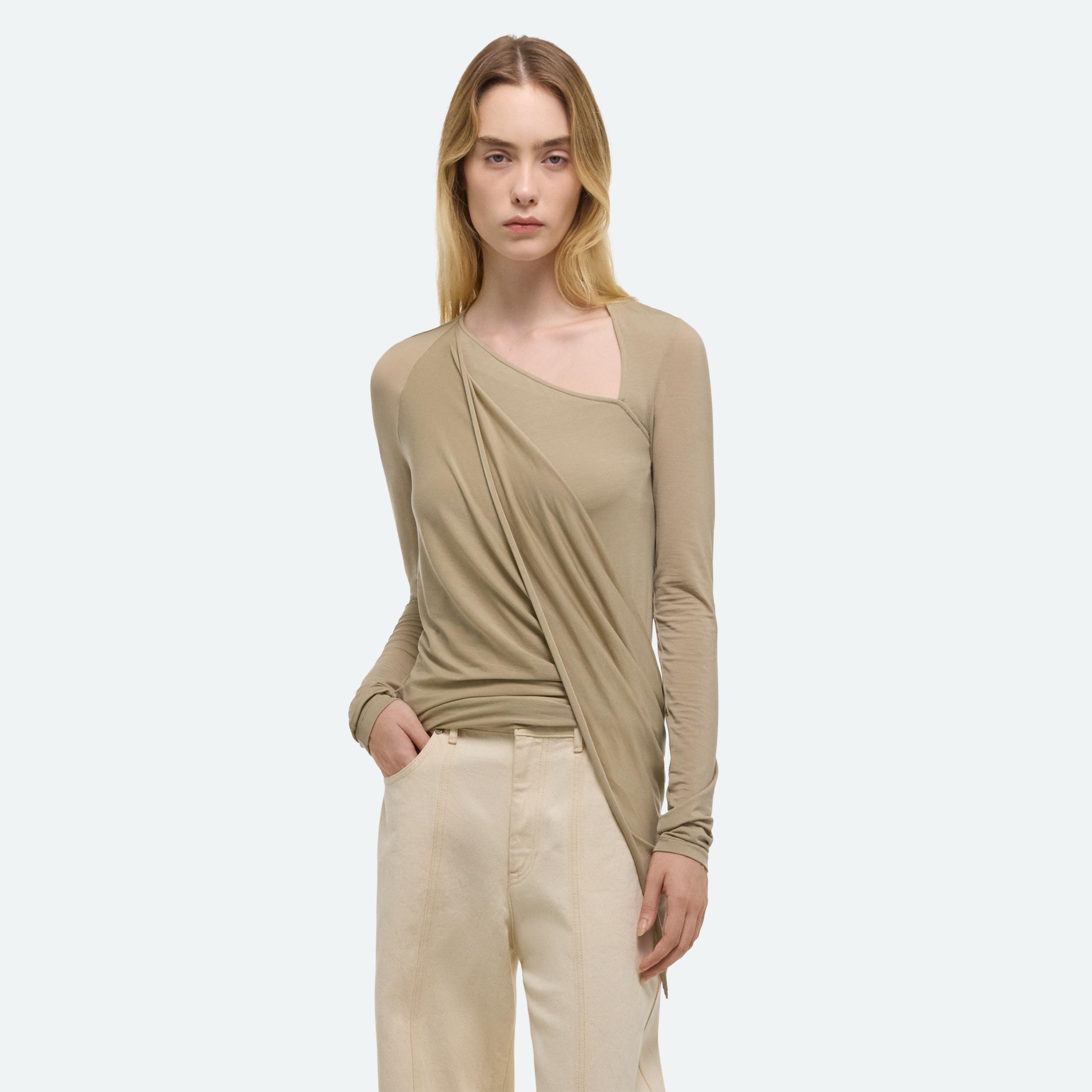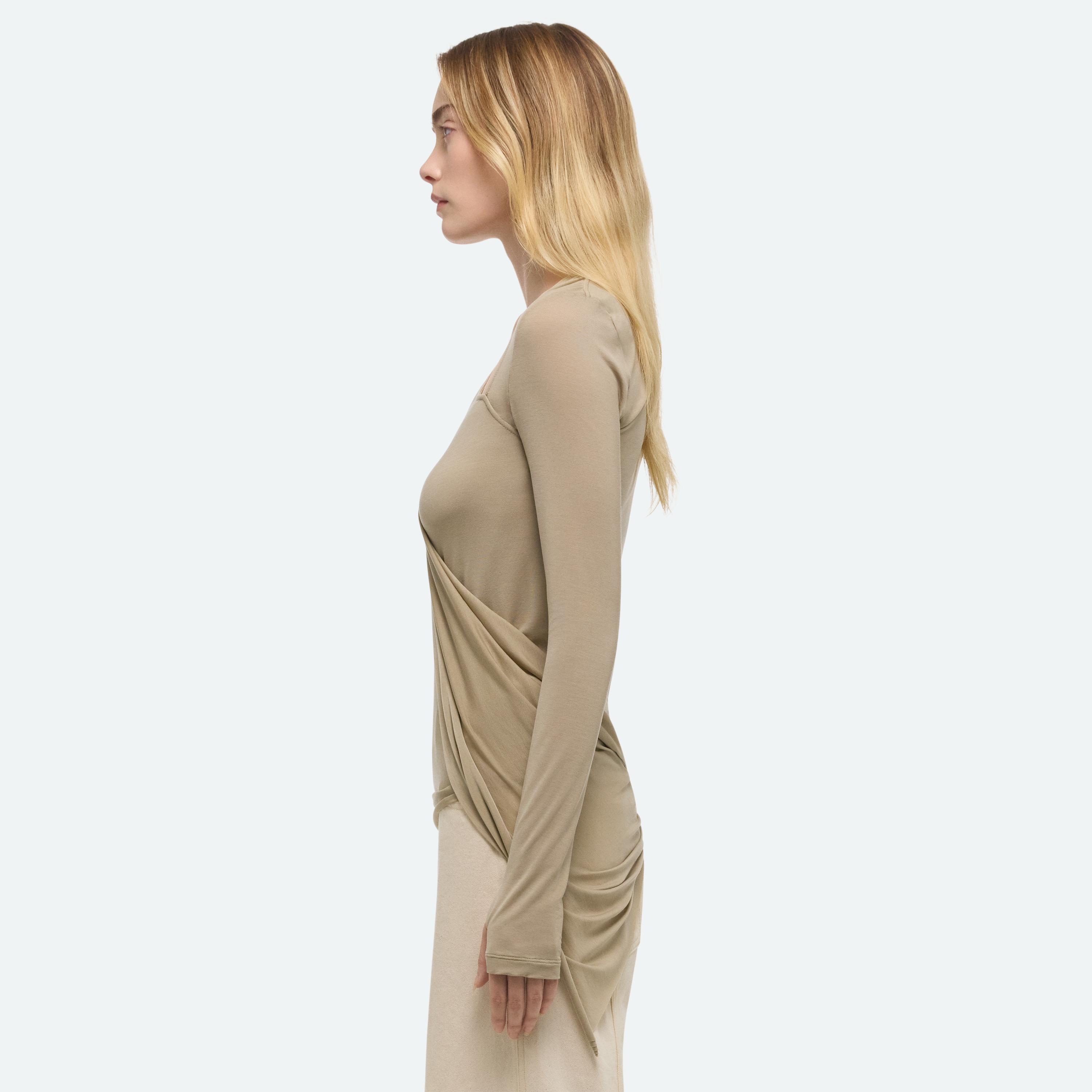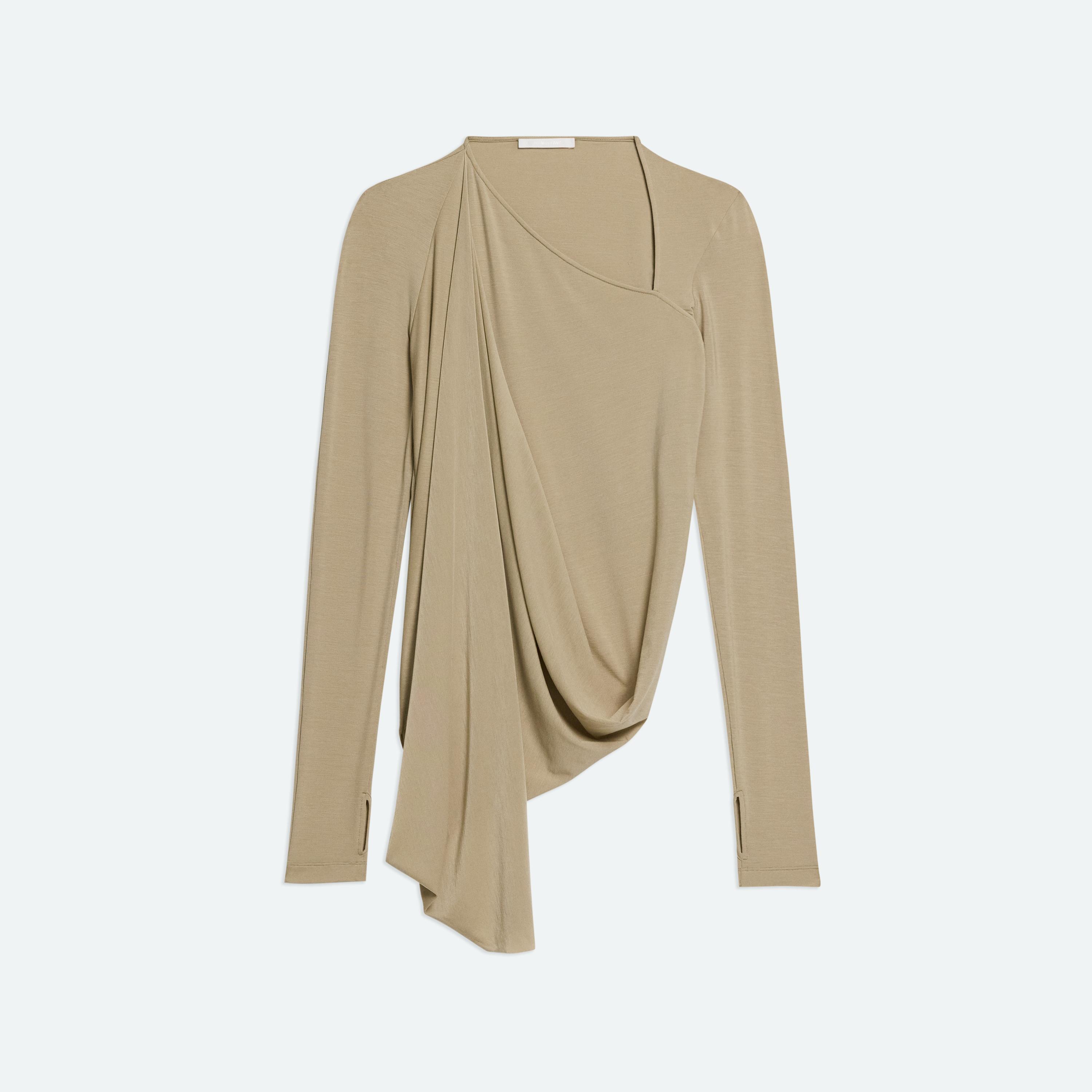 Long-sleeve top in soft lyocell jersey with asymmetrical draped detail that wraps around the body.