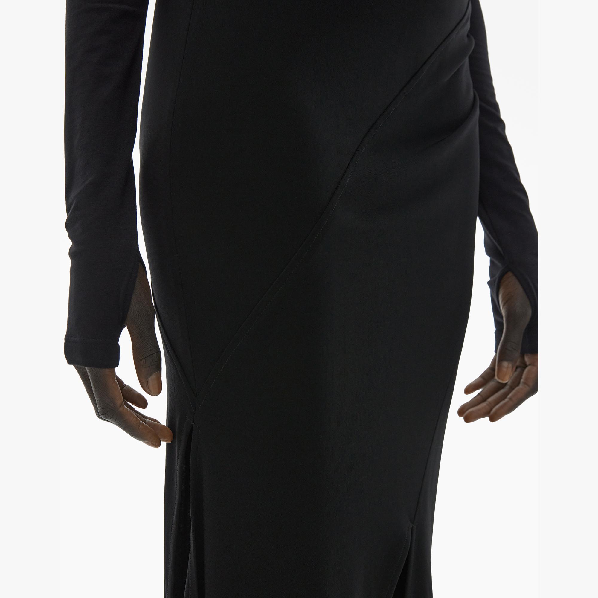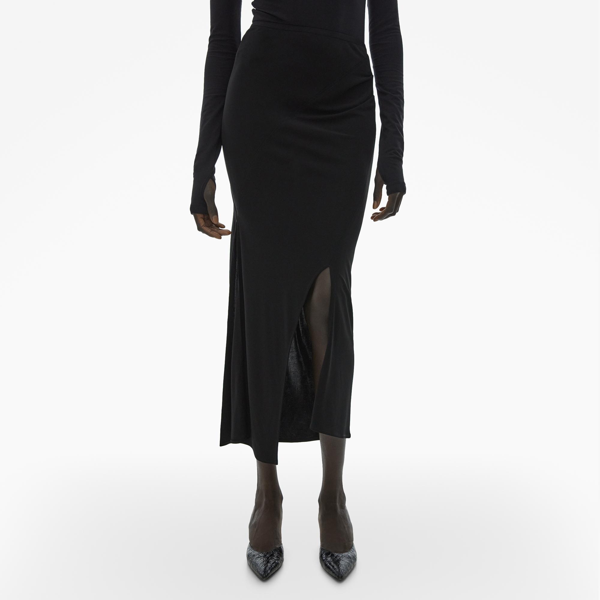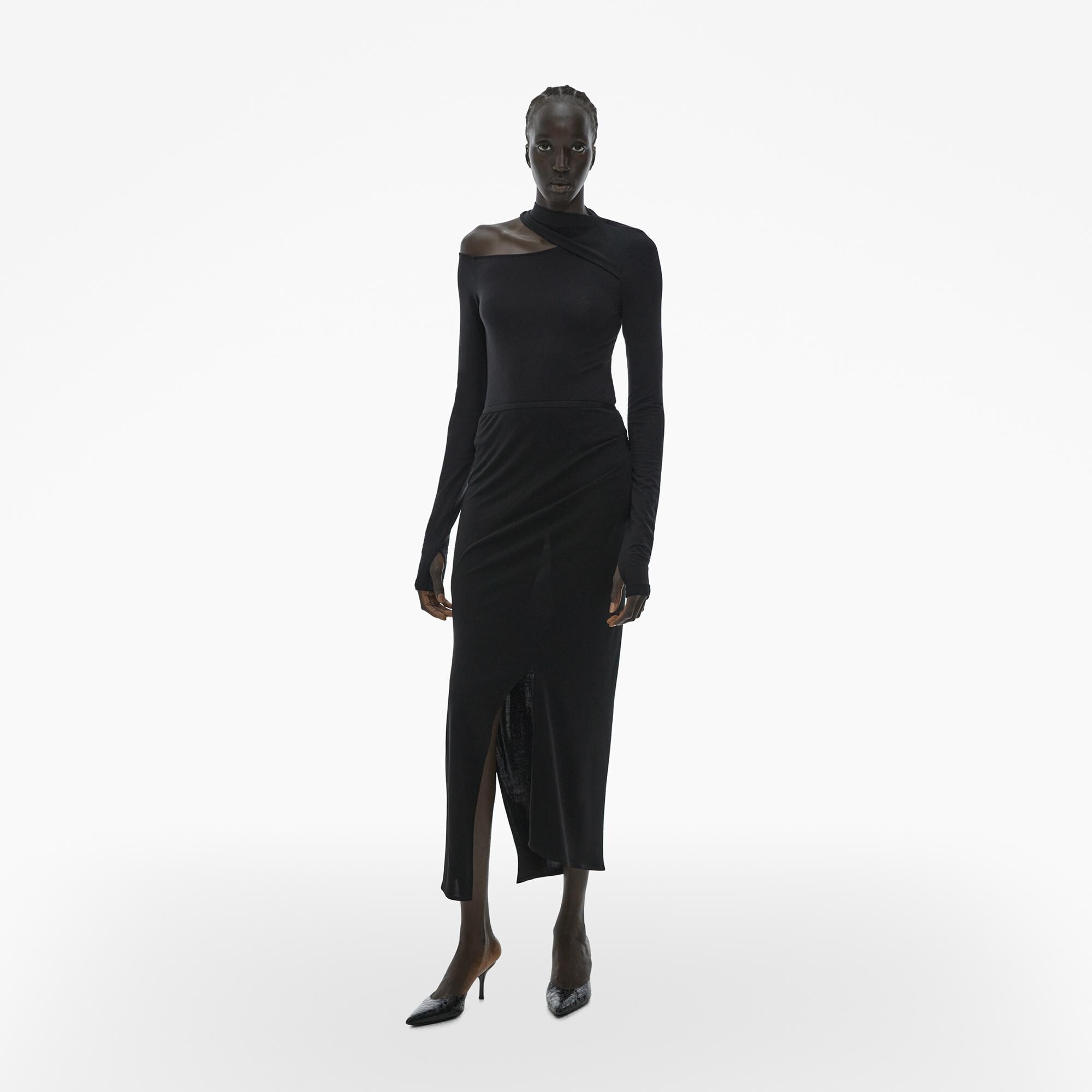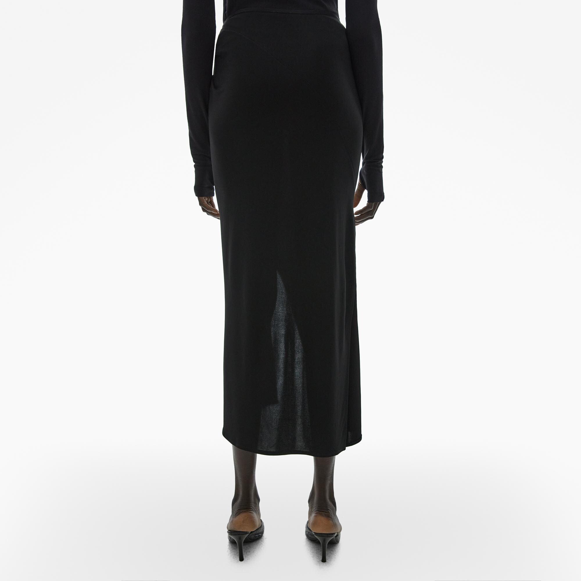 The Helmut Lang Twist Skirt is a pull-on midi style in lightweight viscose jersey with ruched and slit details at the side.
