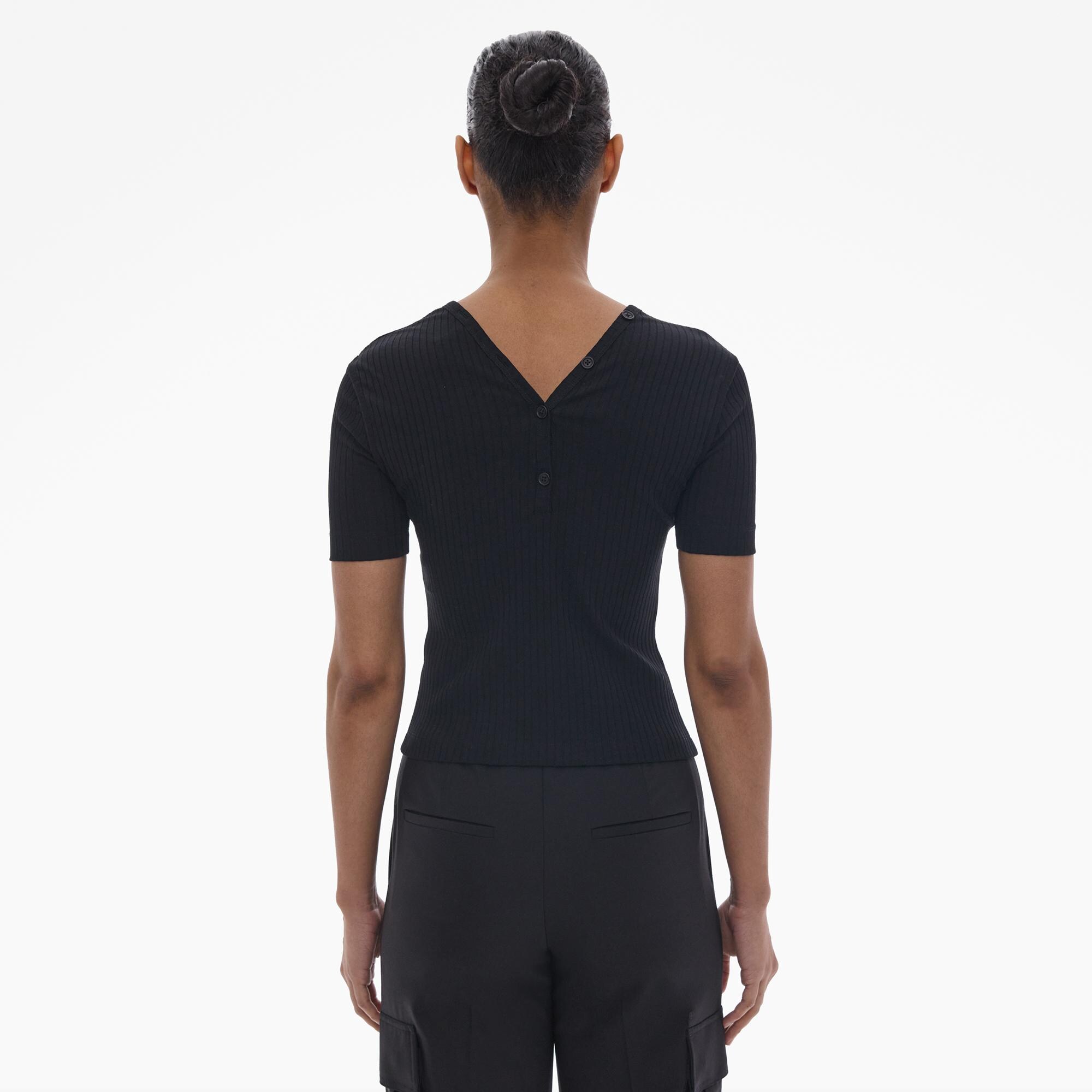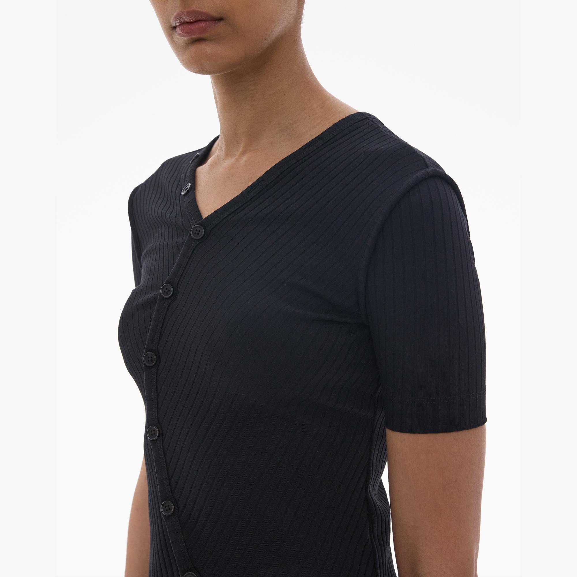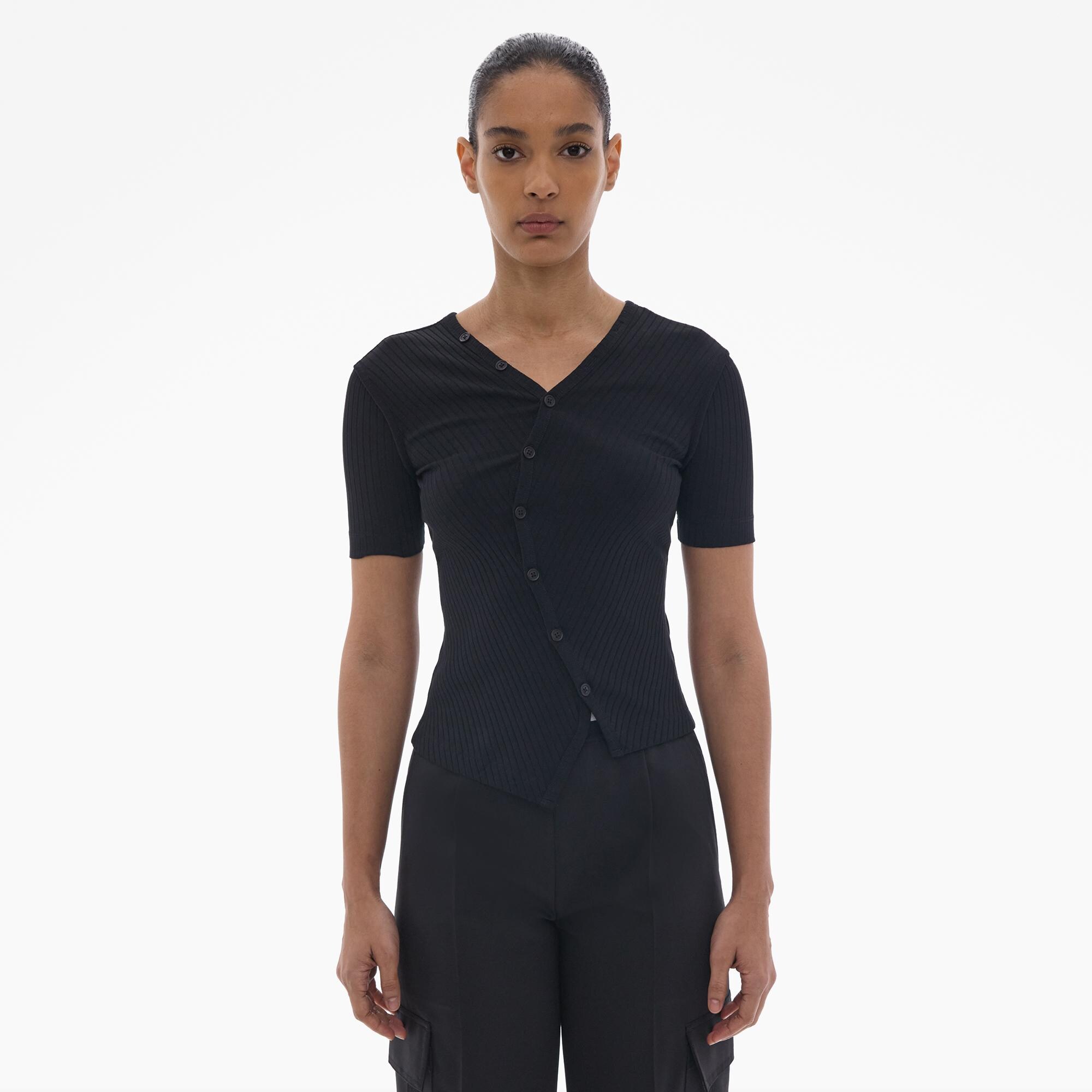 The Helmut Lang Tee is a slim-fitting style in a stretch cotton rib with a V-cut neckline, short sleeves, asymmetrical button closures along the front and nape.