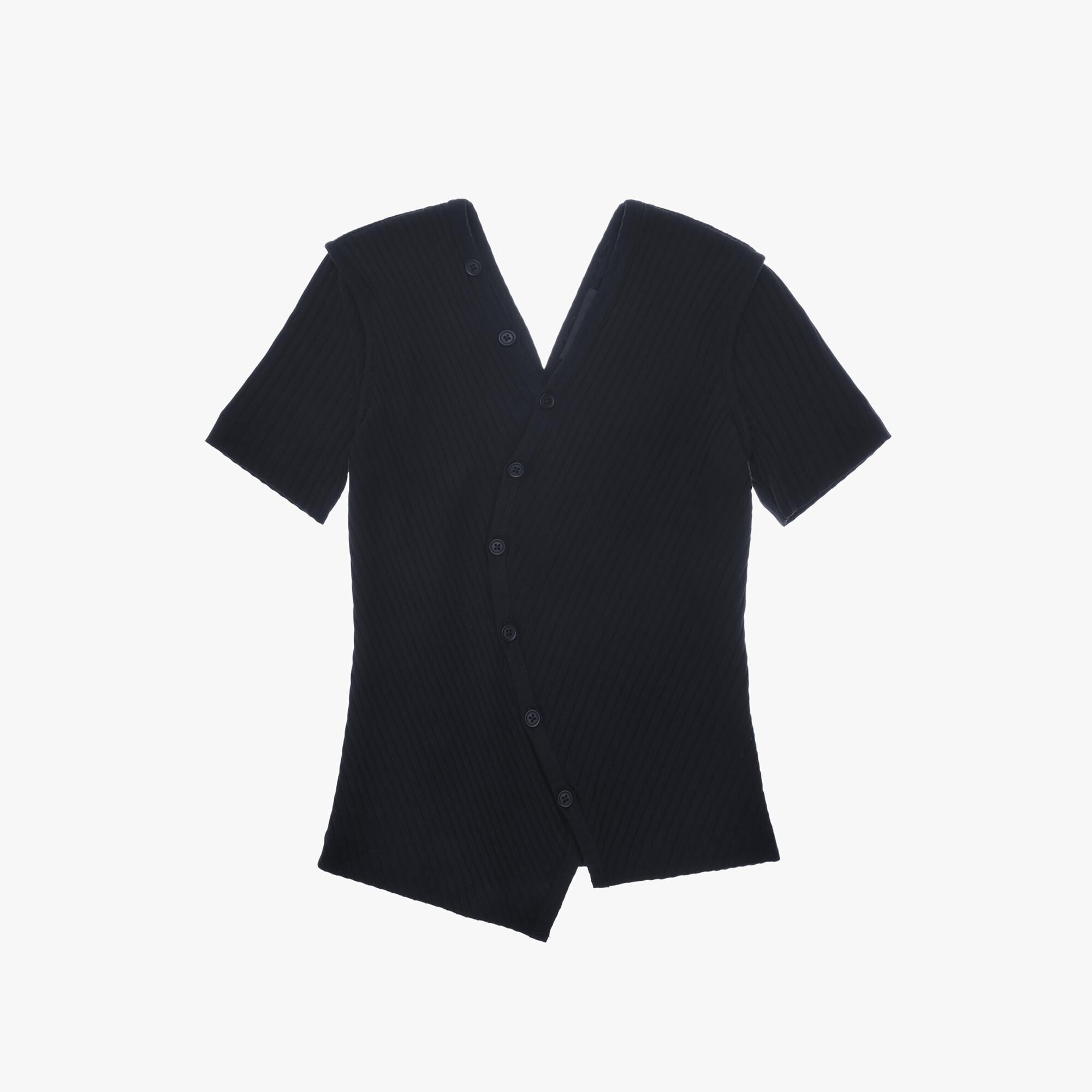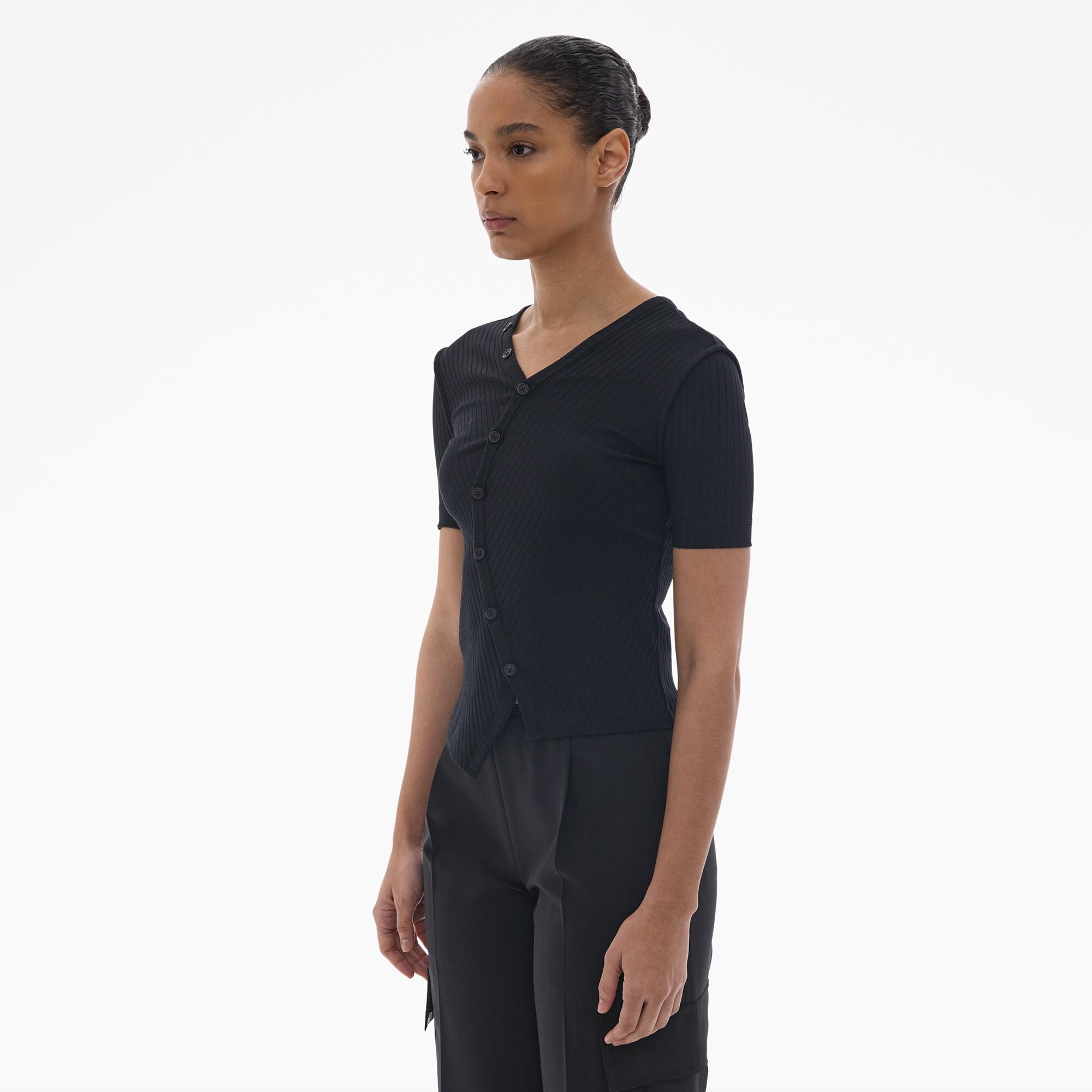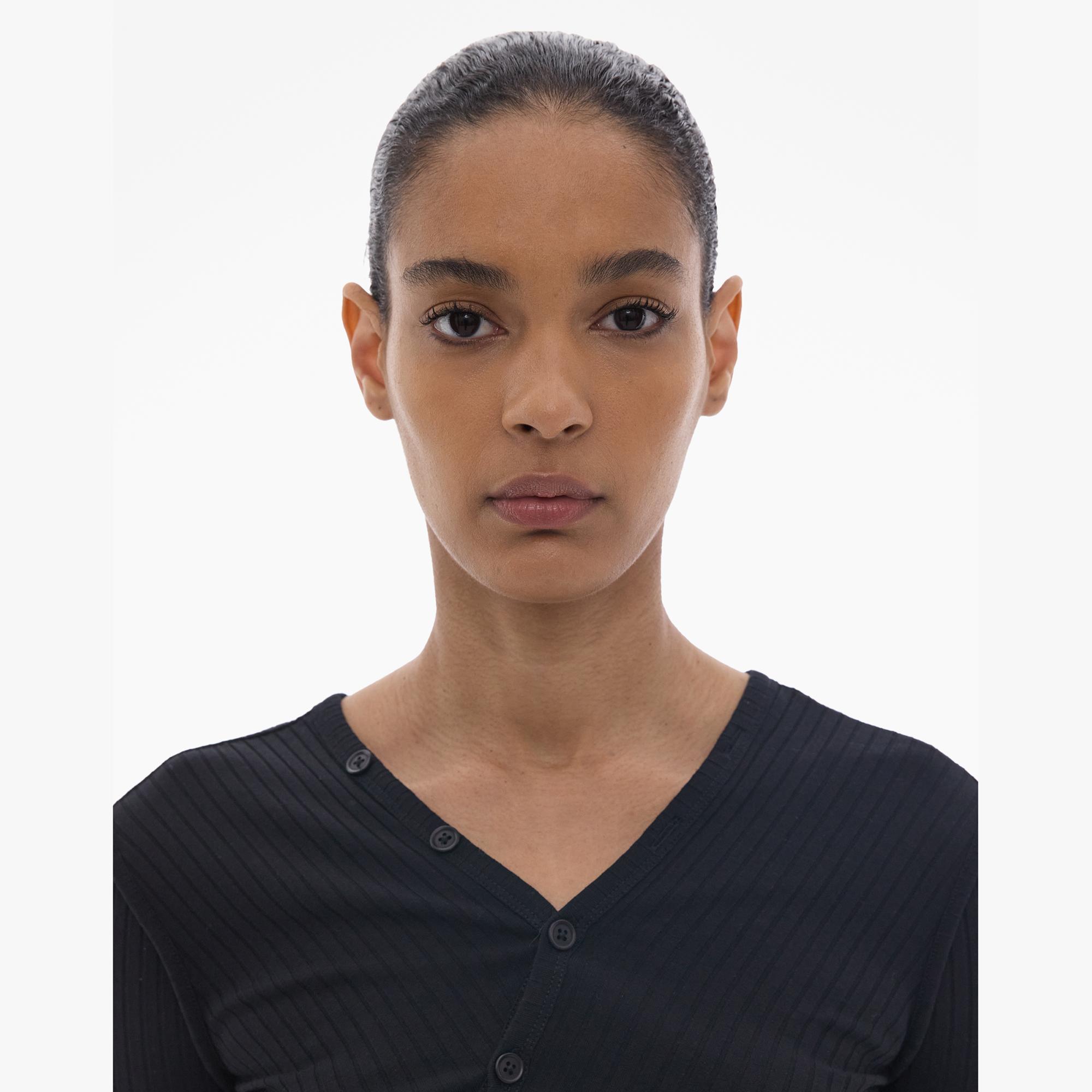 The Helmut Lang Tee is a slim-fitting style in a stretch cotton rib with a V-cut neckline, short sleeves, asymmetrical button closures along the front and nape.