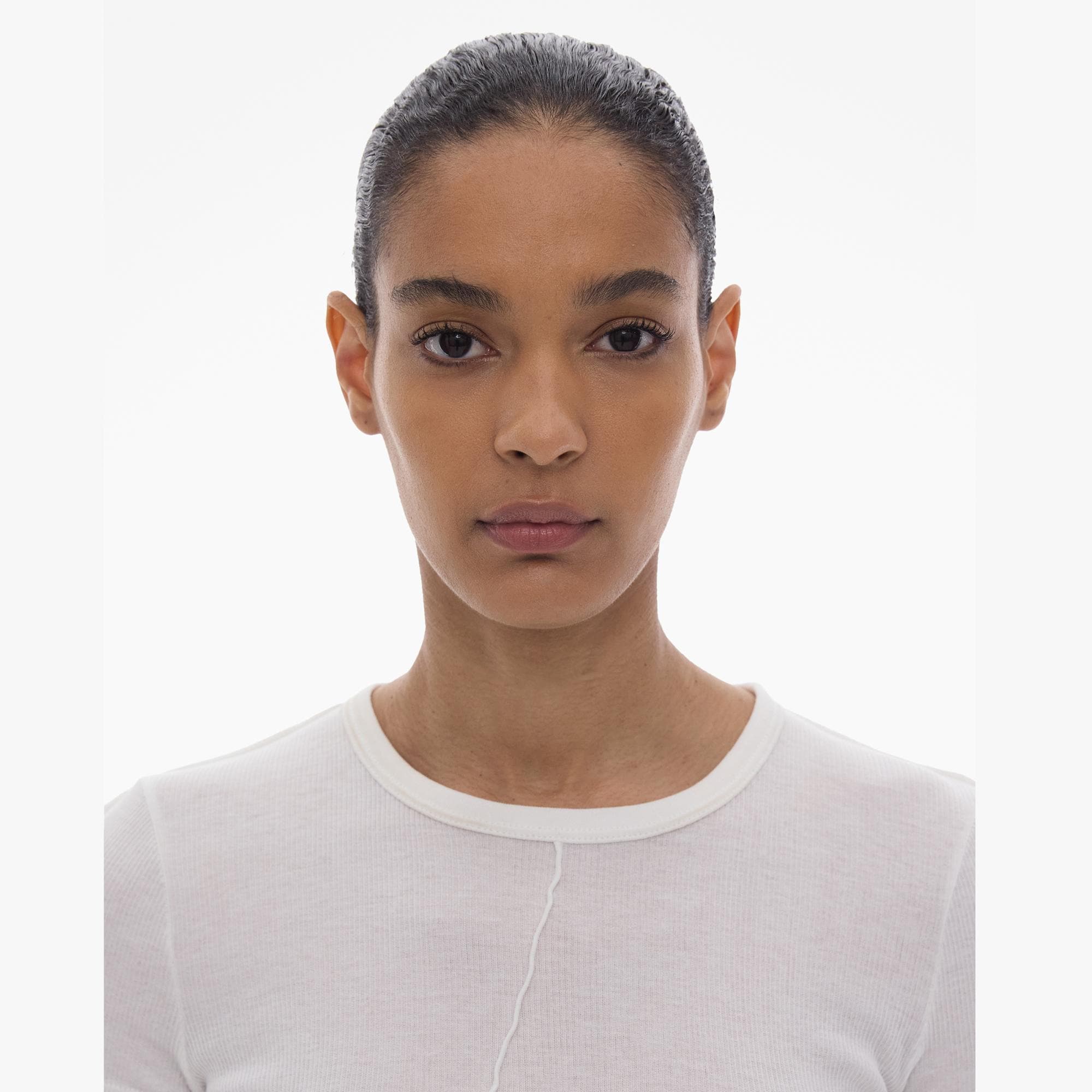 The Helmut Lang Tee is a slim-fitting style in our base double rib with a crew neckline, short sleeves, back cut-out, and angular exposed seams.