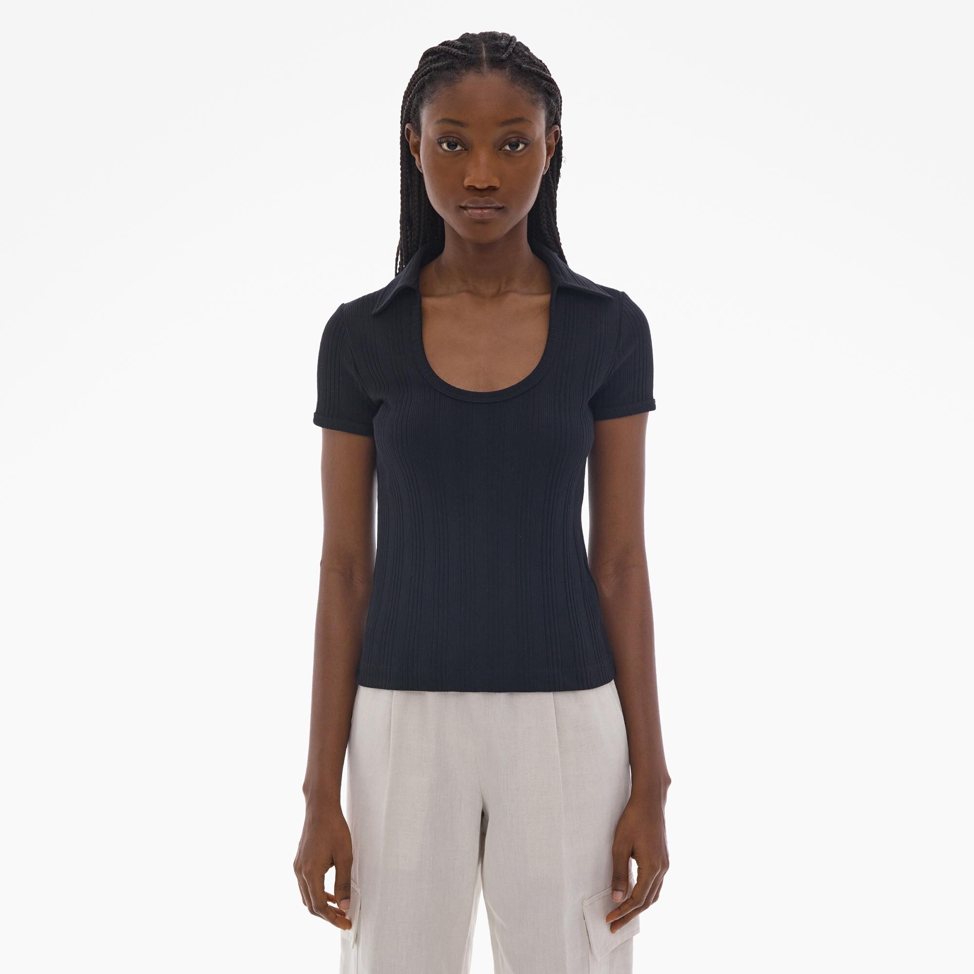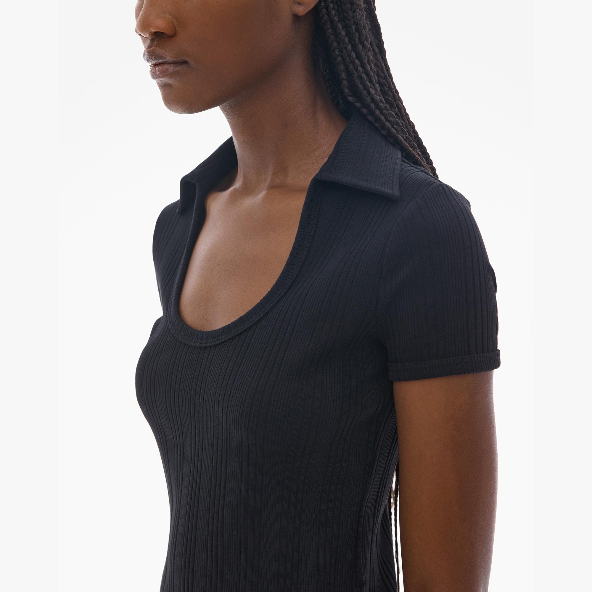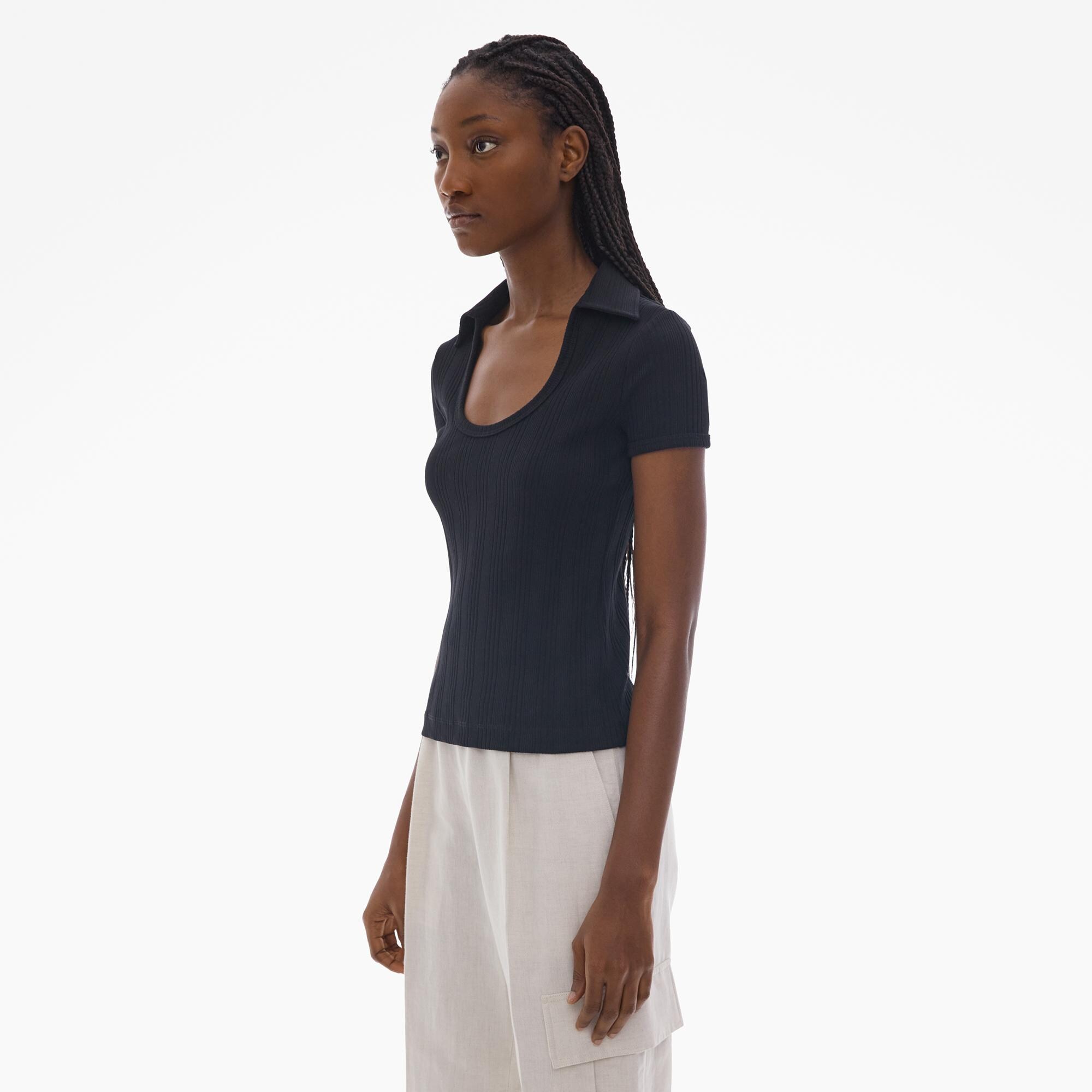 The Helmut Lang Polo is a slim-fitting style in an irregular stretch cotton rib knit with a pointed collar, scoop neckline, and short sleeves.
