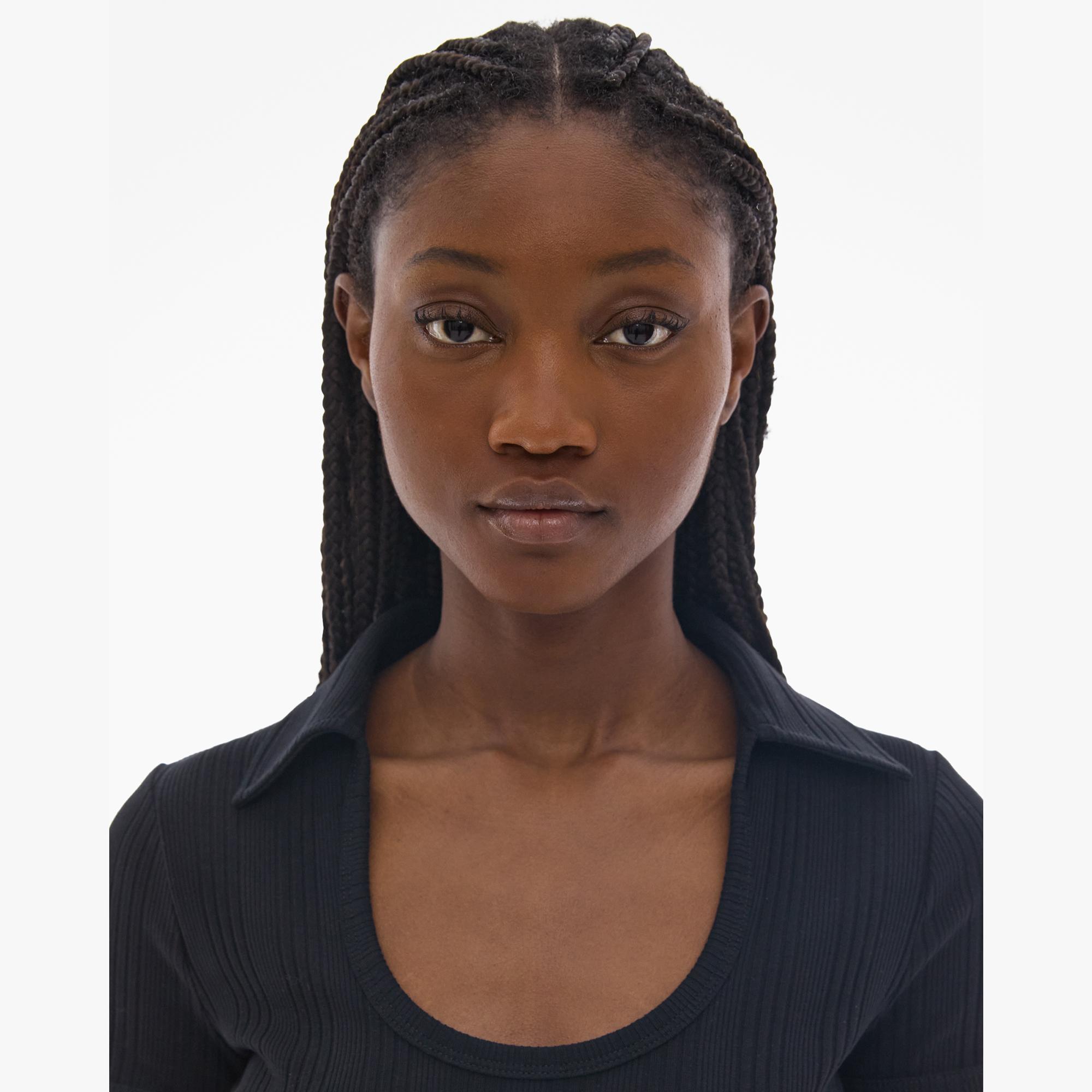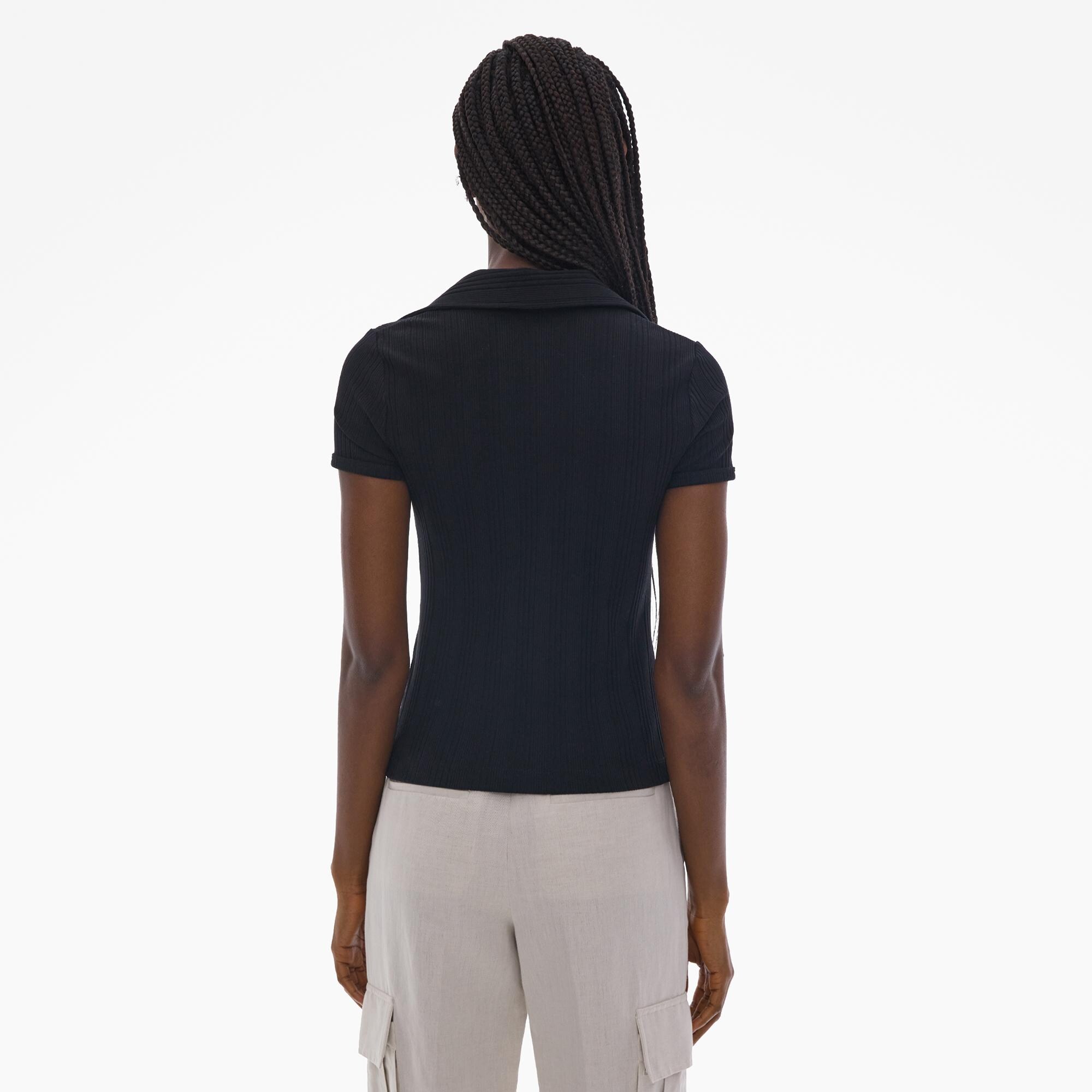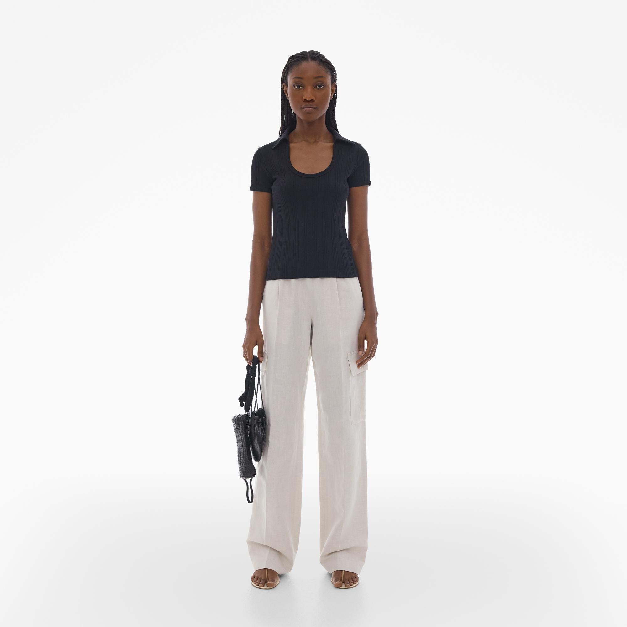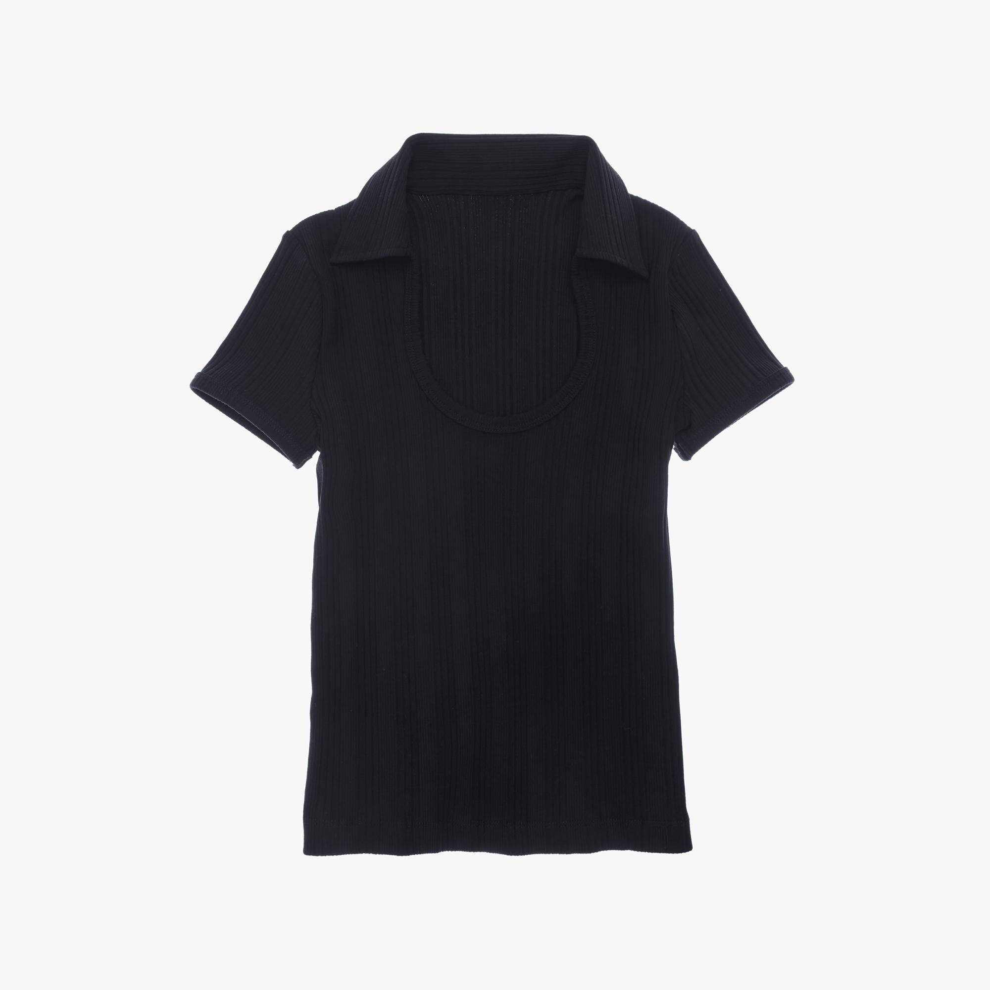 The Helmut Lang Polo is a slim-fitting style in an irregular stretch cotton rib knit with a pointed collar, scoop neckline, and short sleeves.