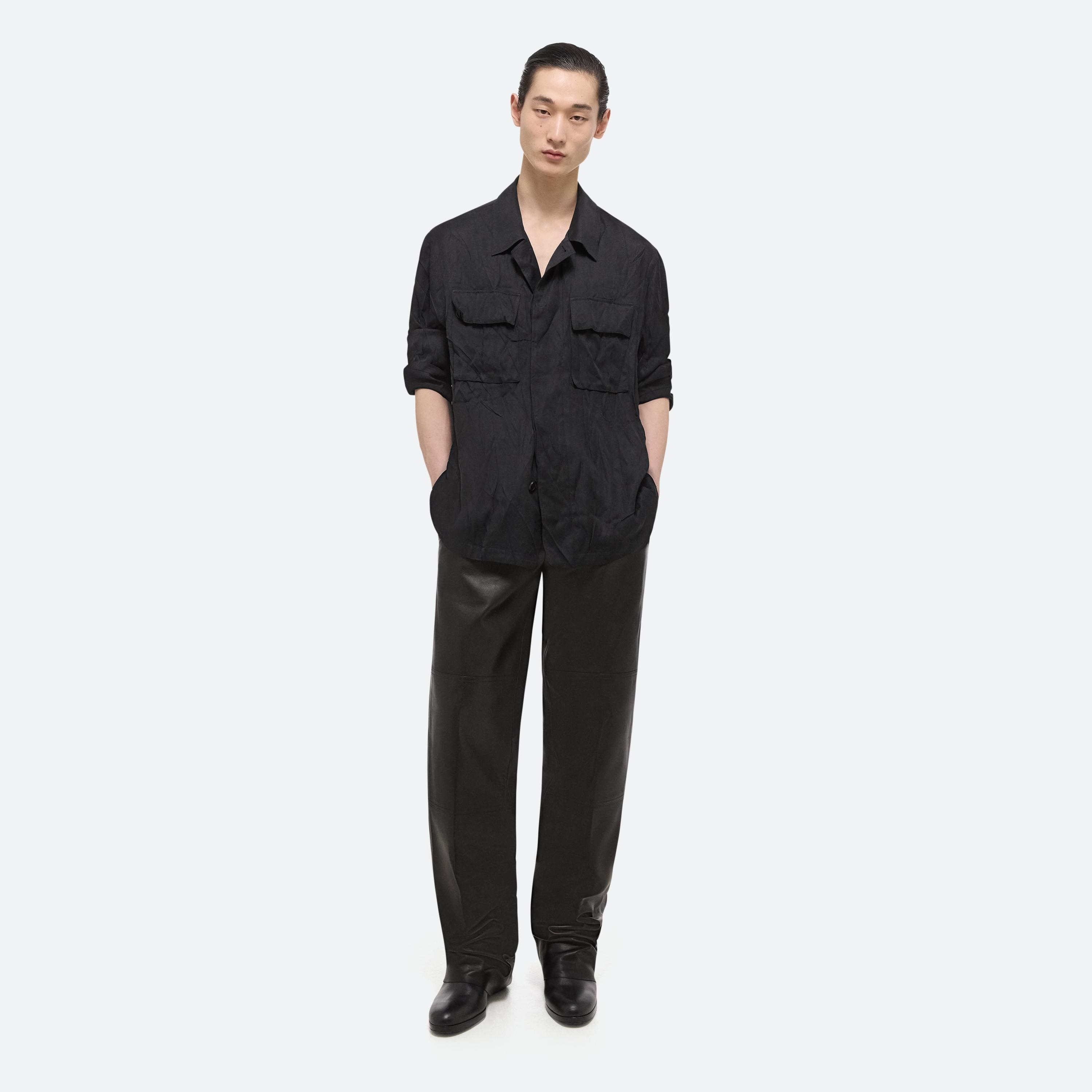 Utility shirt jacket in lightweight rayon twill is a relaxed fit body with military utilitarian details, while being slightly crushed for a unique, irregular texture.