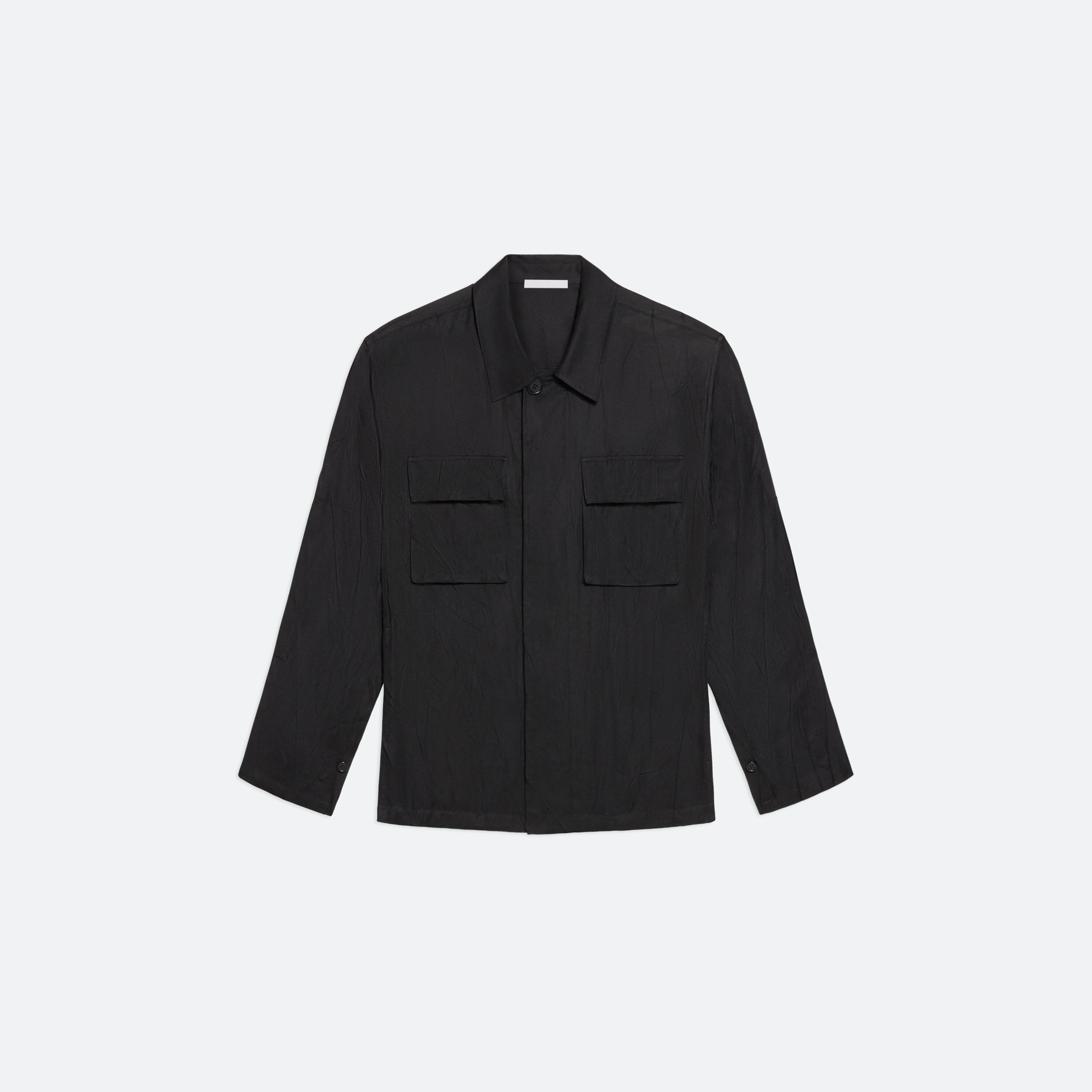 Utility shirt jacket in lightweight rayon twill is a relaxed fit body with military utilitarian details, while being slightly crushed for a unique, irregular texture.