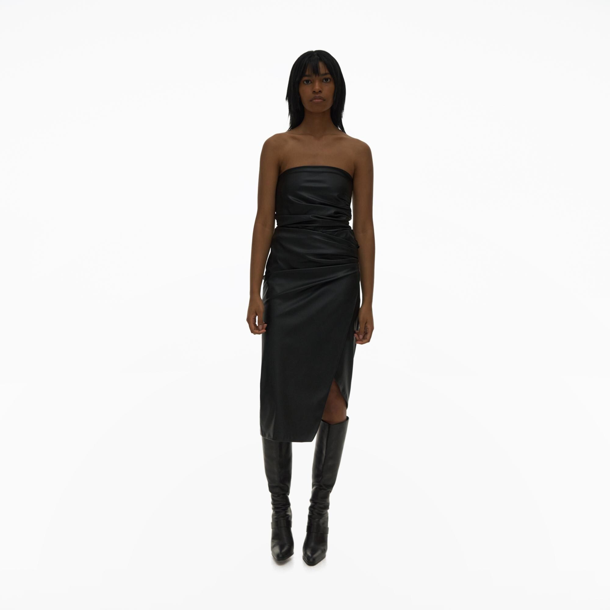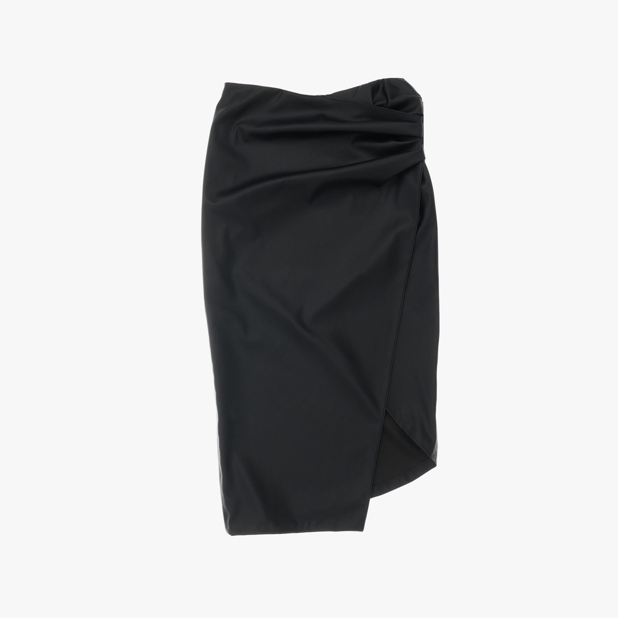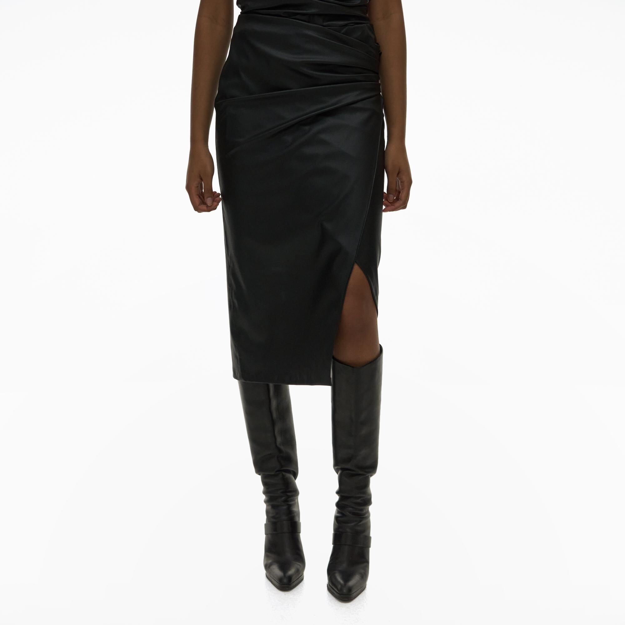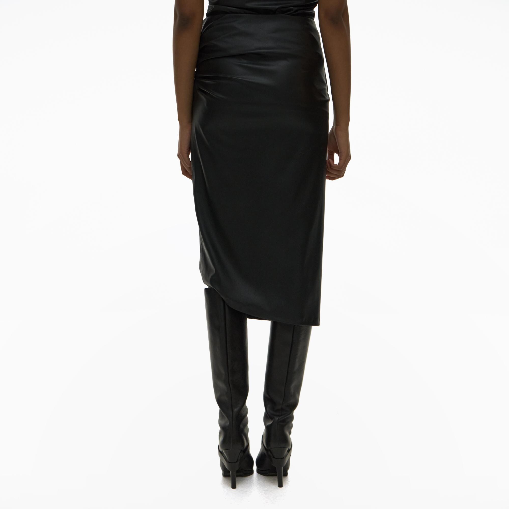 The Helmut Lang Vegan Leather Skirt is a midi skirt with an asymmetric wrap front with an invisble side zip closure.