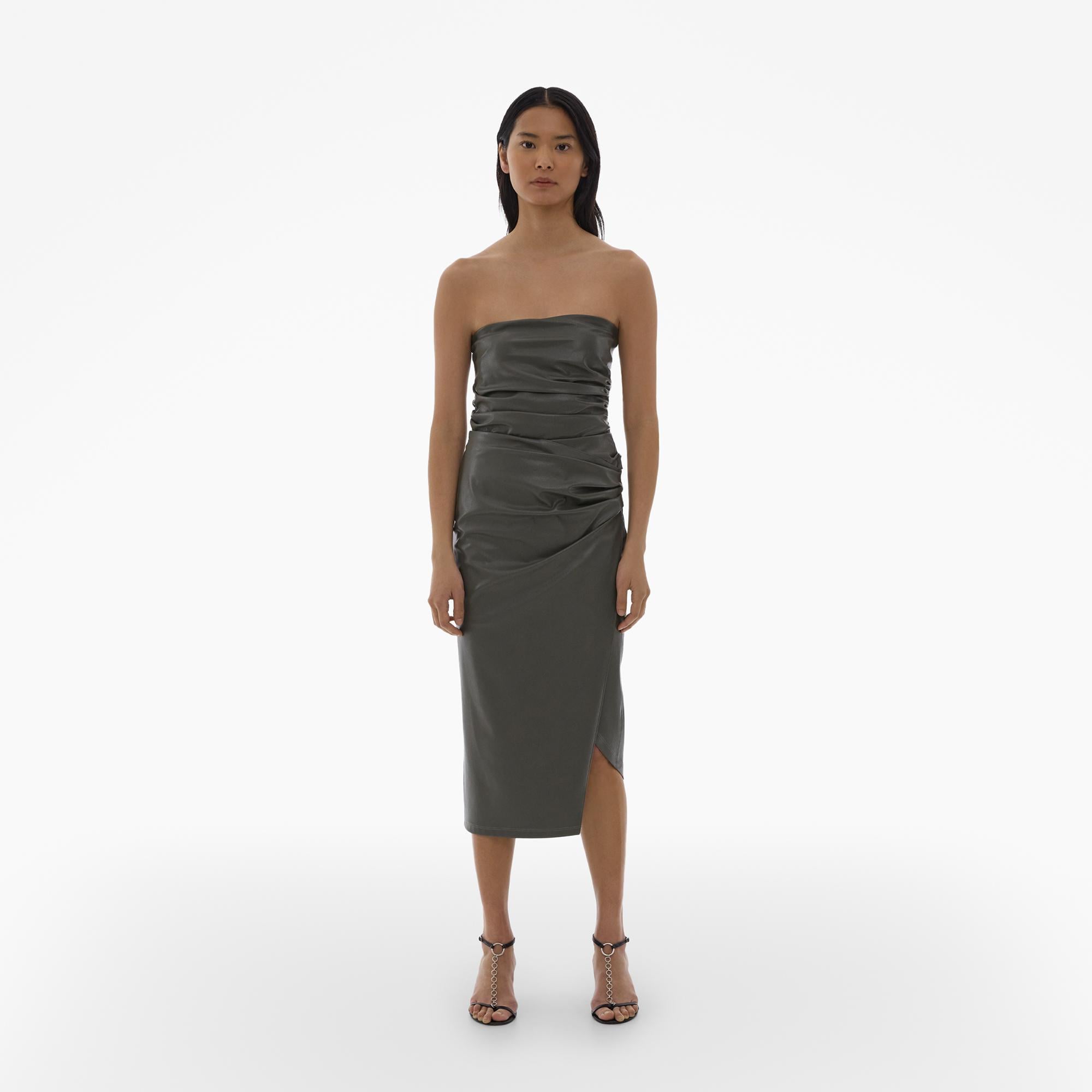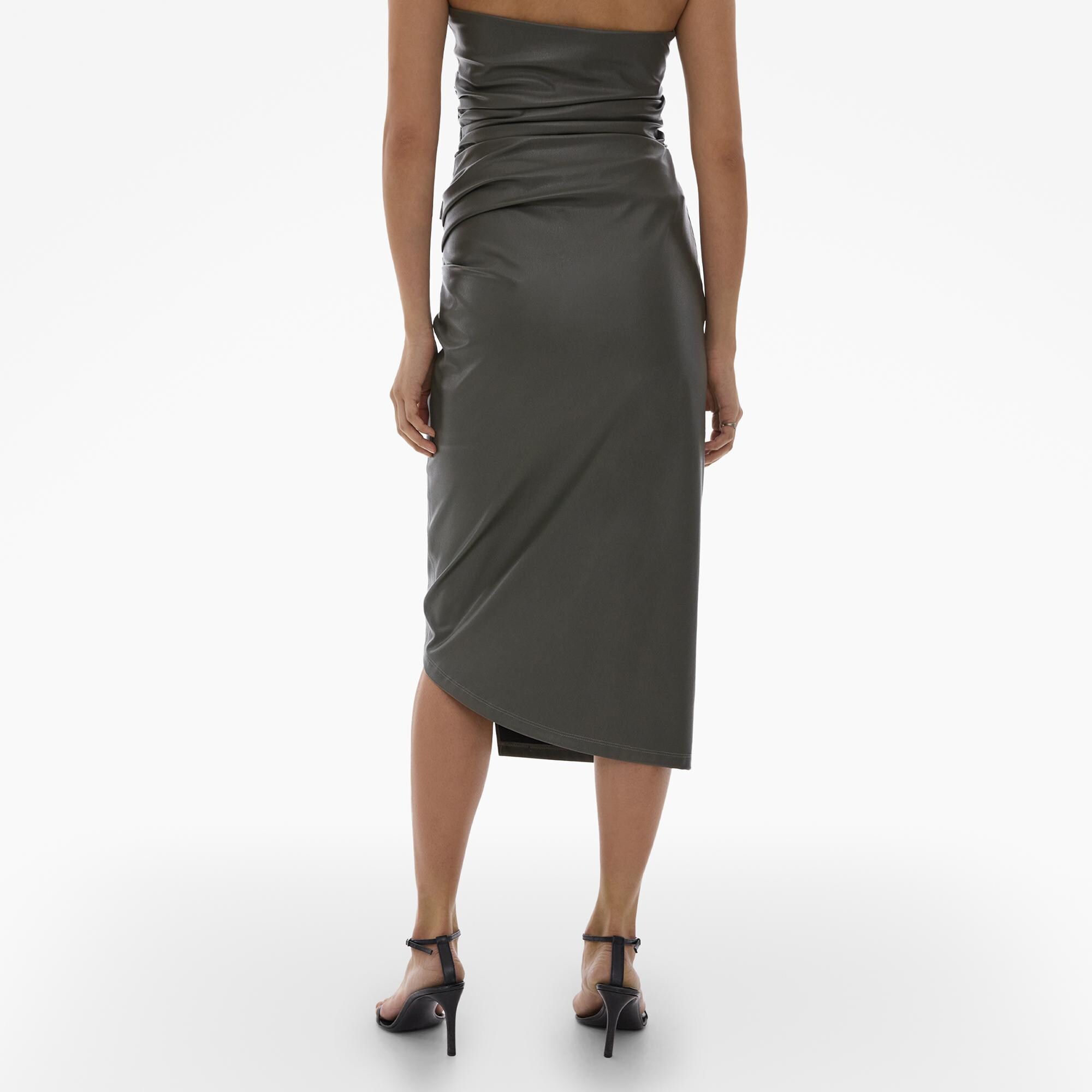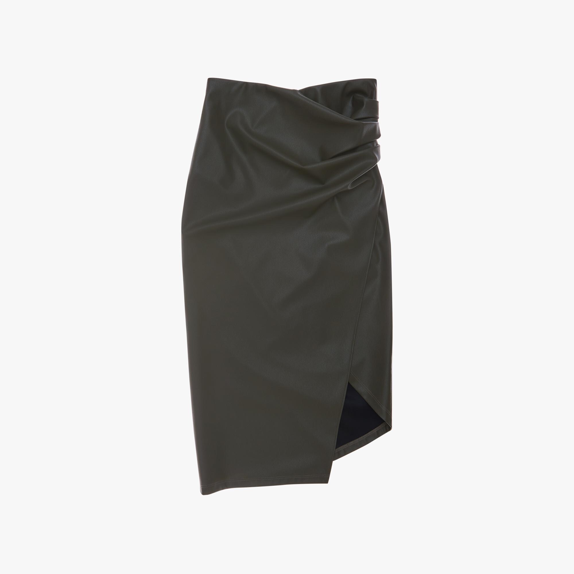 The Helmut Lang Vegan Leather Skirt is a midi skirt with an asymmetric wrap front with an invisble side zip closure.