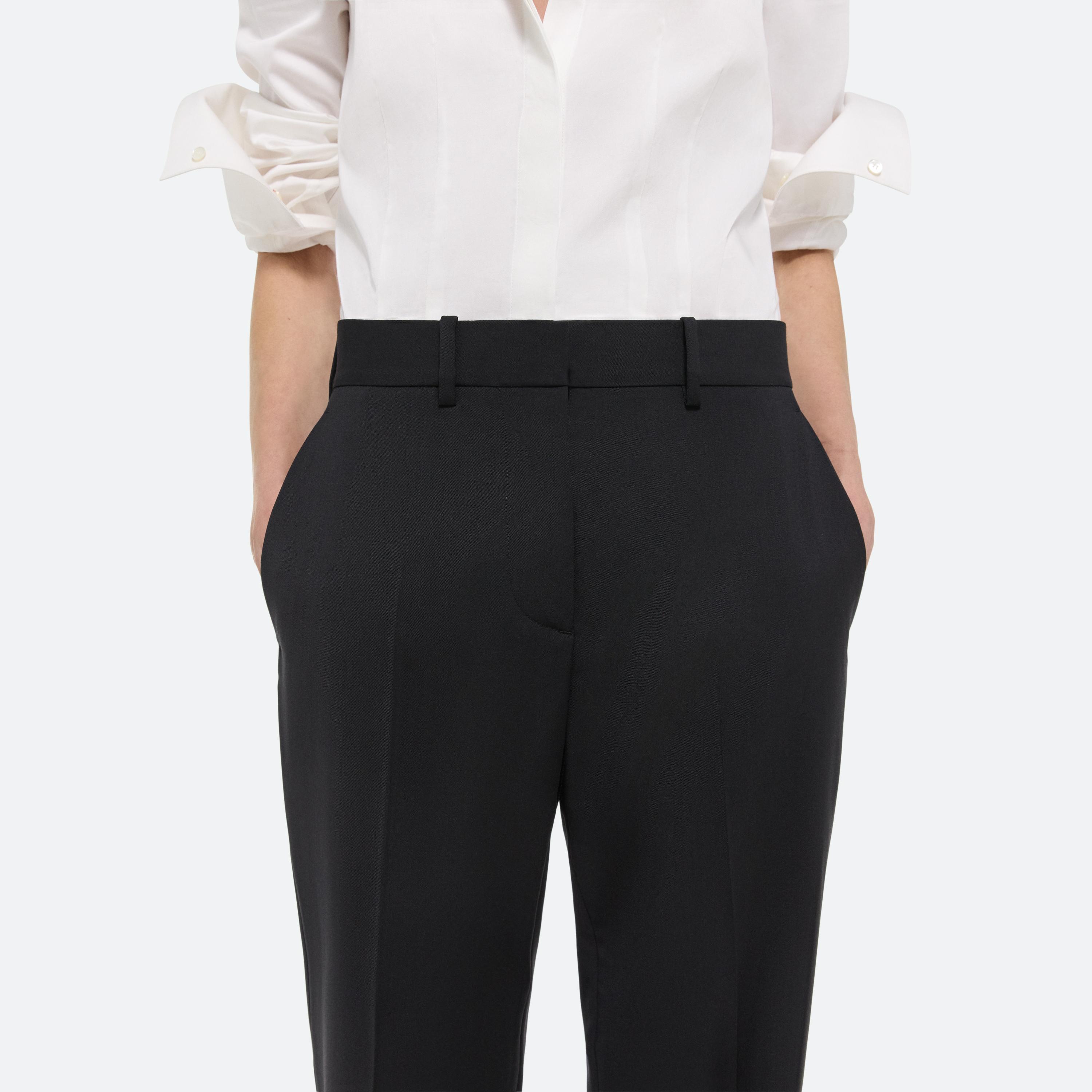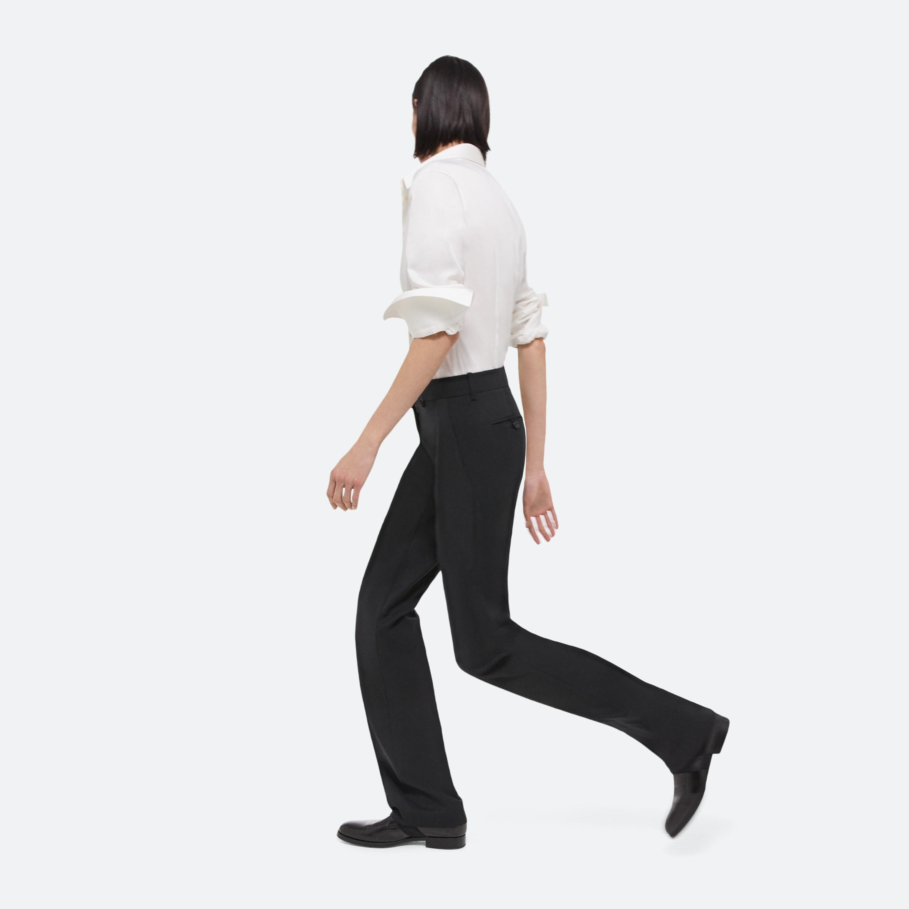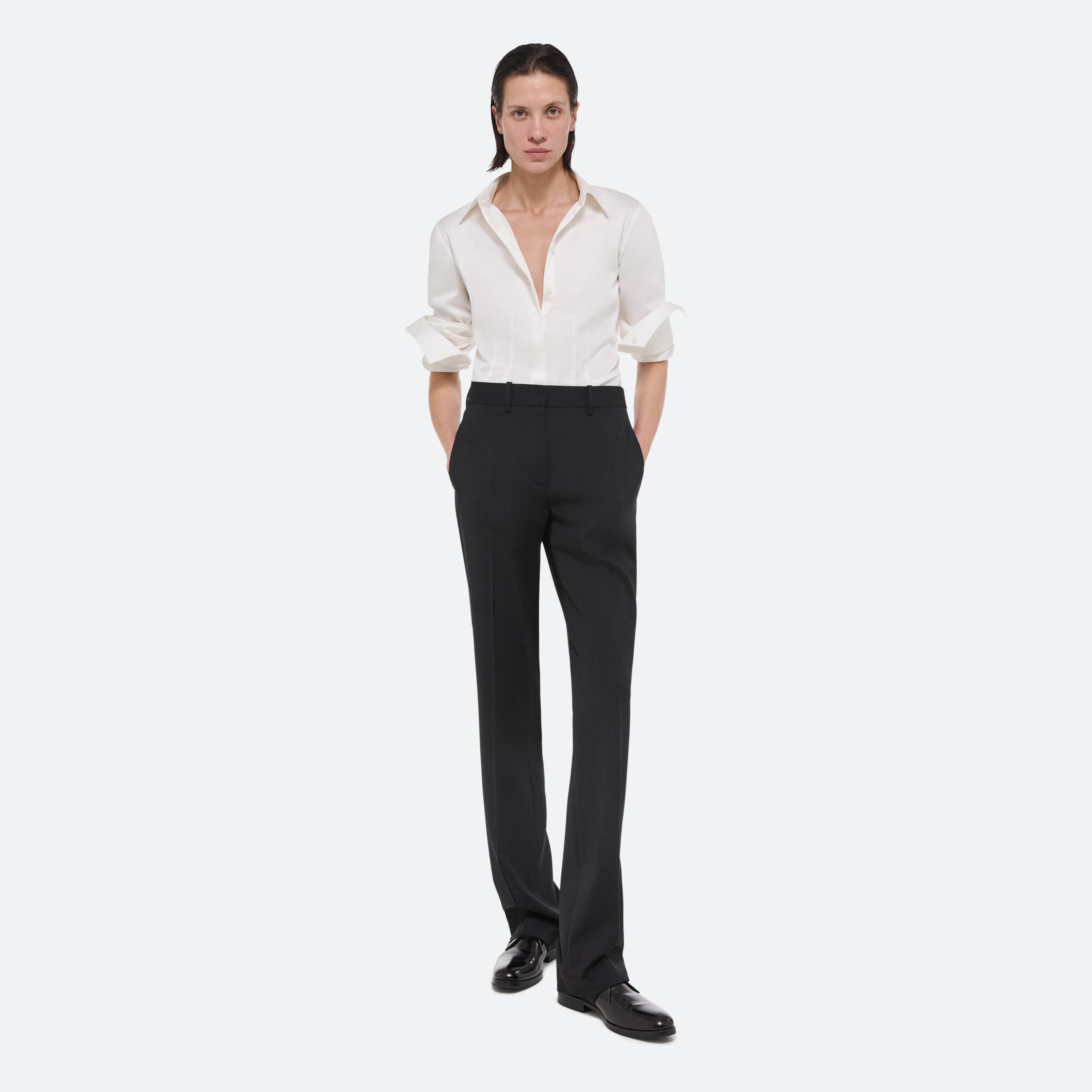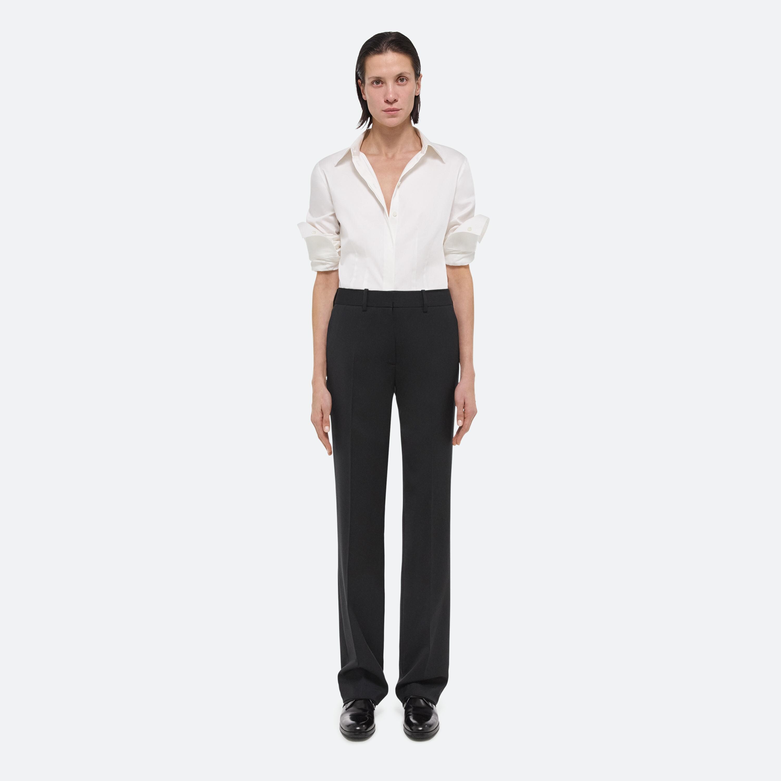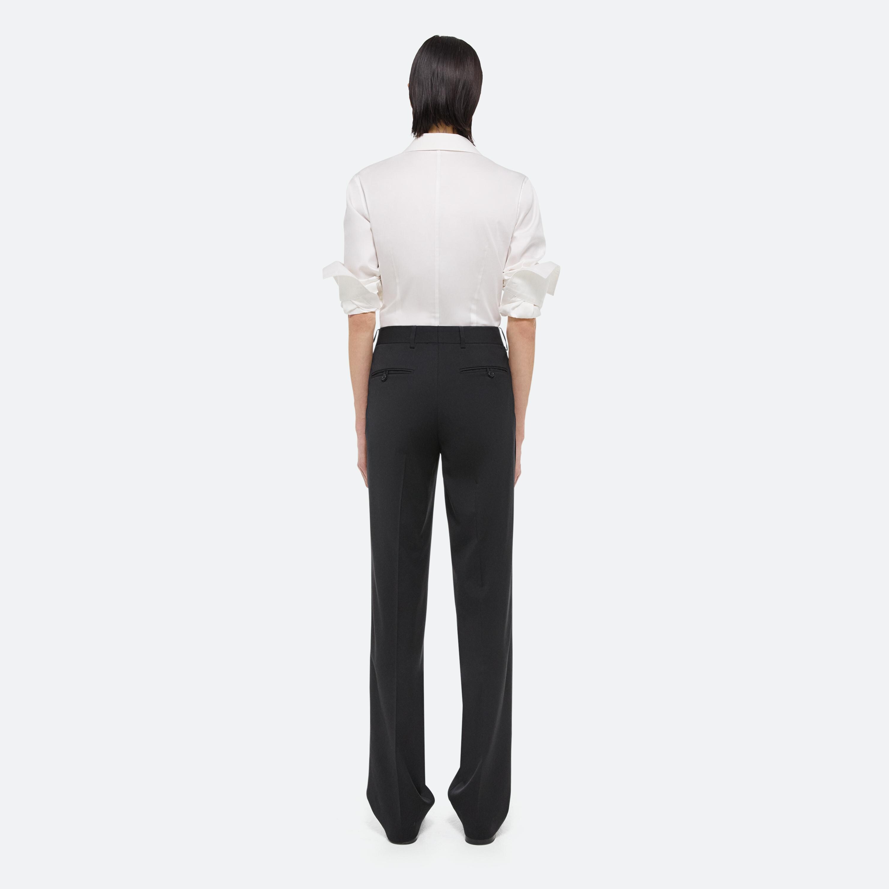 Tailored car trouser in Italian virgin wool. Cut with a relaxed, straight leg fit. Sits low on the waist and pools at the ankles.