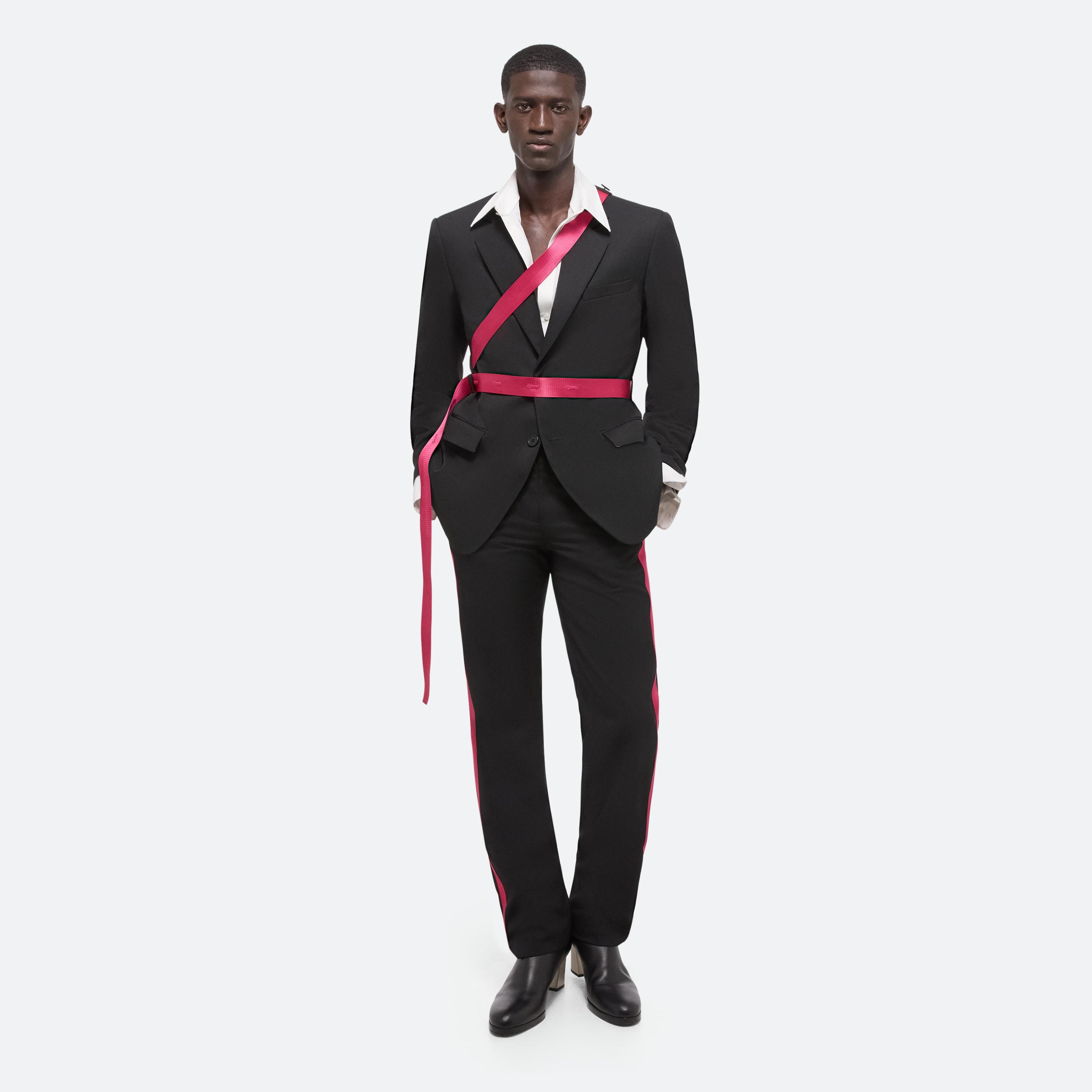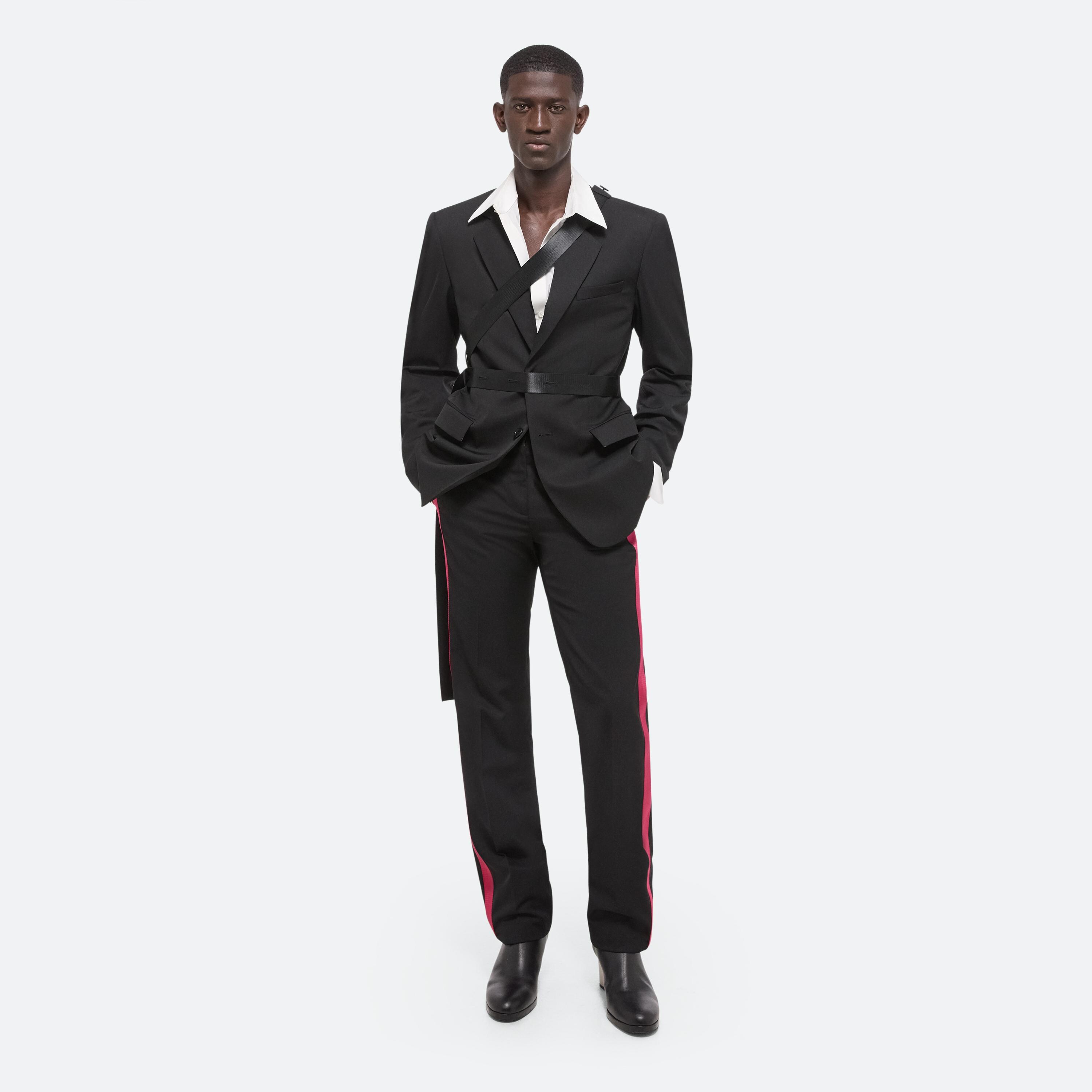 Classic blazer in Italian virgin wool with notched lapels and waist flap pockets. Detachable logo seatbelt straps, designed to be worn multiple ways. Comes with an extra seatbelt strap in black.