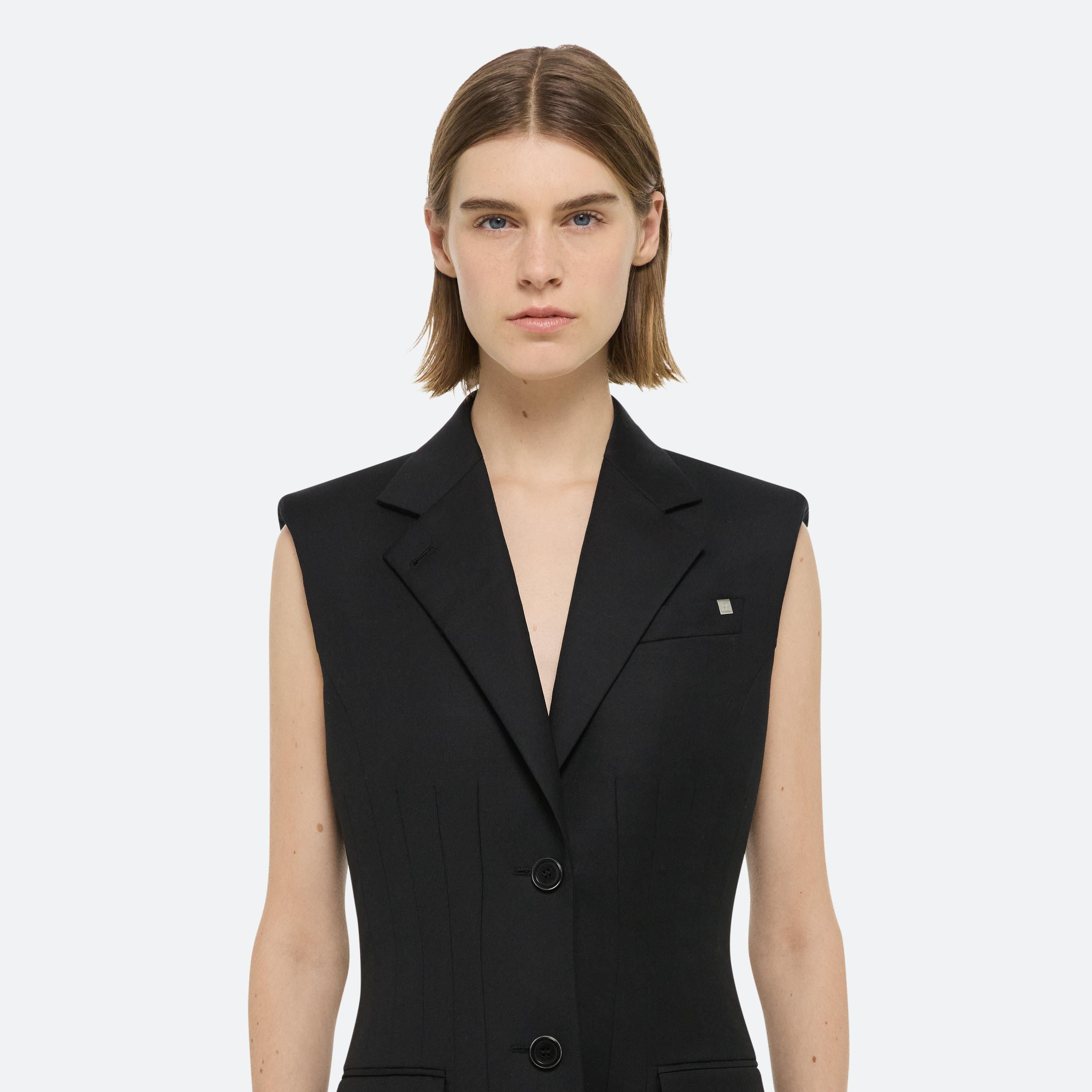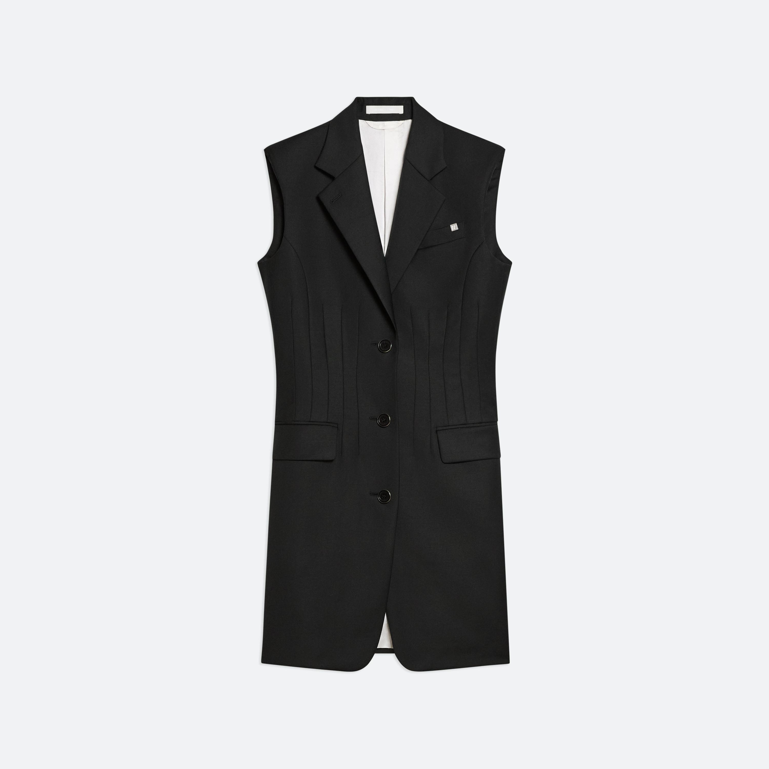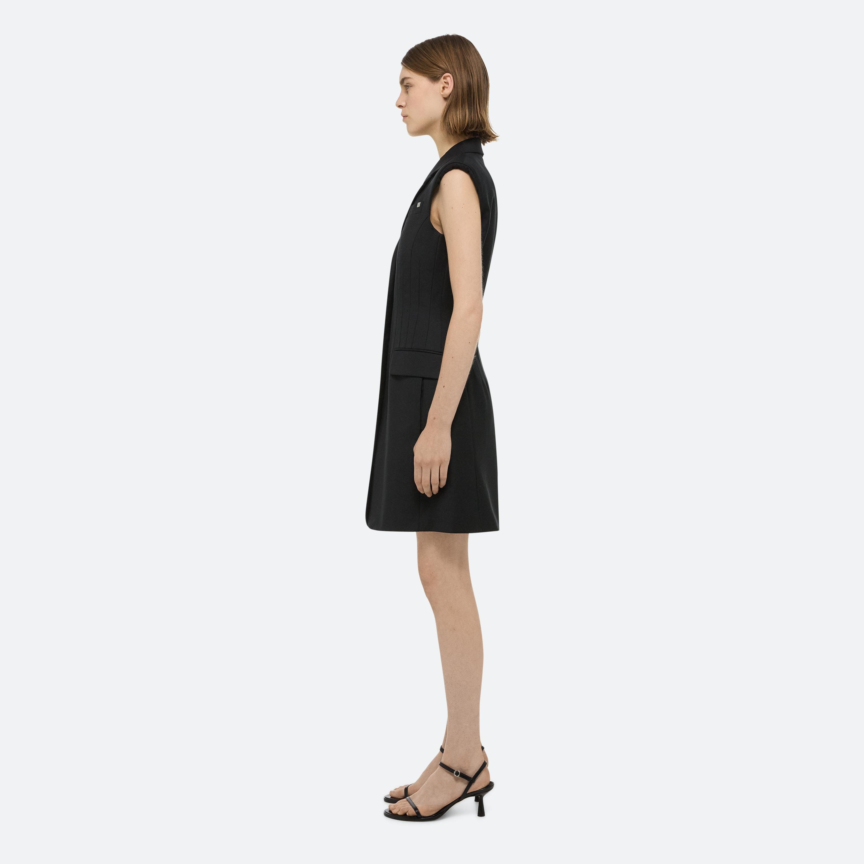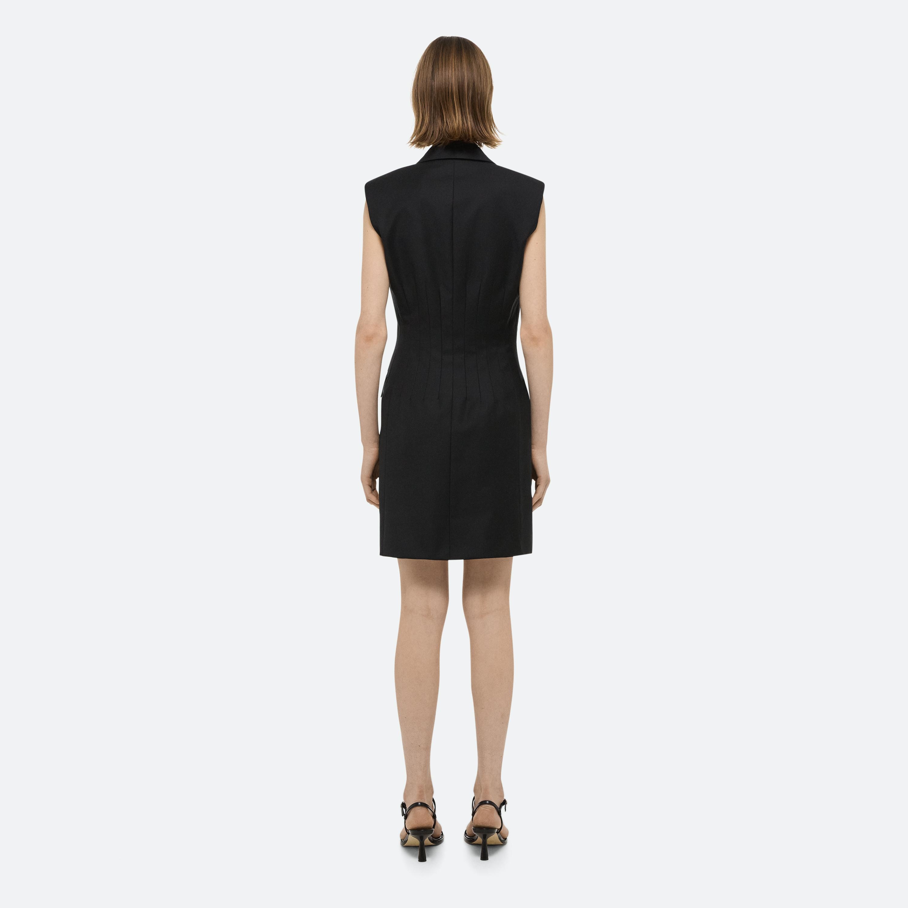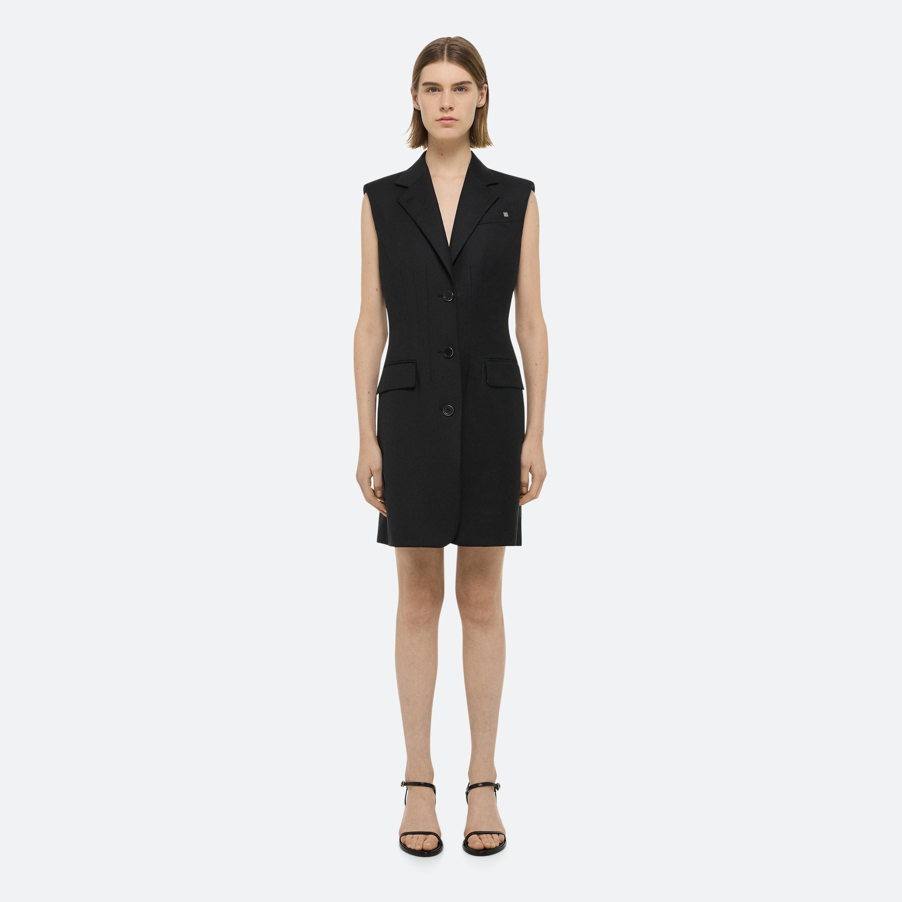 Tailored blazer dress with a fitted waist sculpted by darts. Made in wool twill with notched lapels and waist flap pockets.