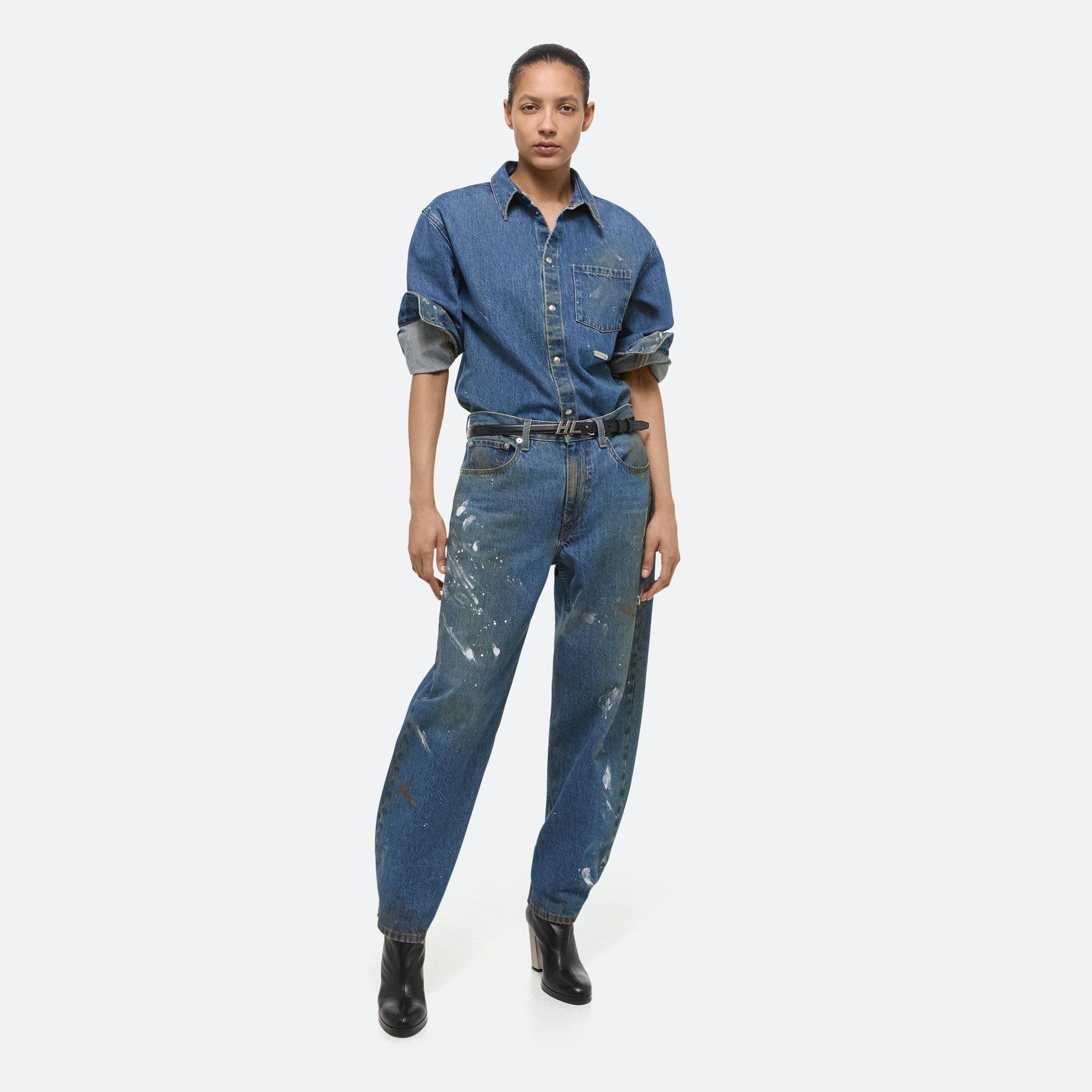 Cropped mid-rise jeans with a loose fit and wide leg. Converts into a tapered leg using two sets of snaps at the ankle. Each pair is finished by hand with paint and oil staining for a one-of-a-kind patina.