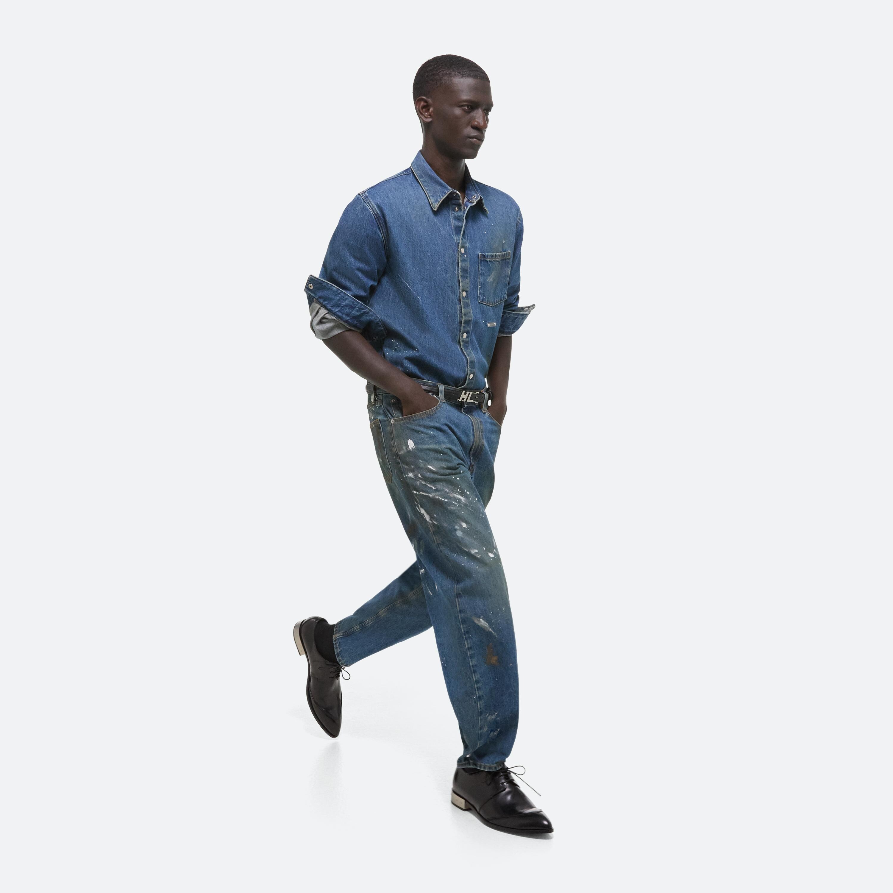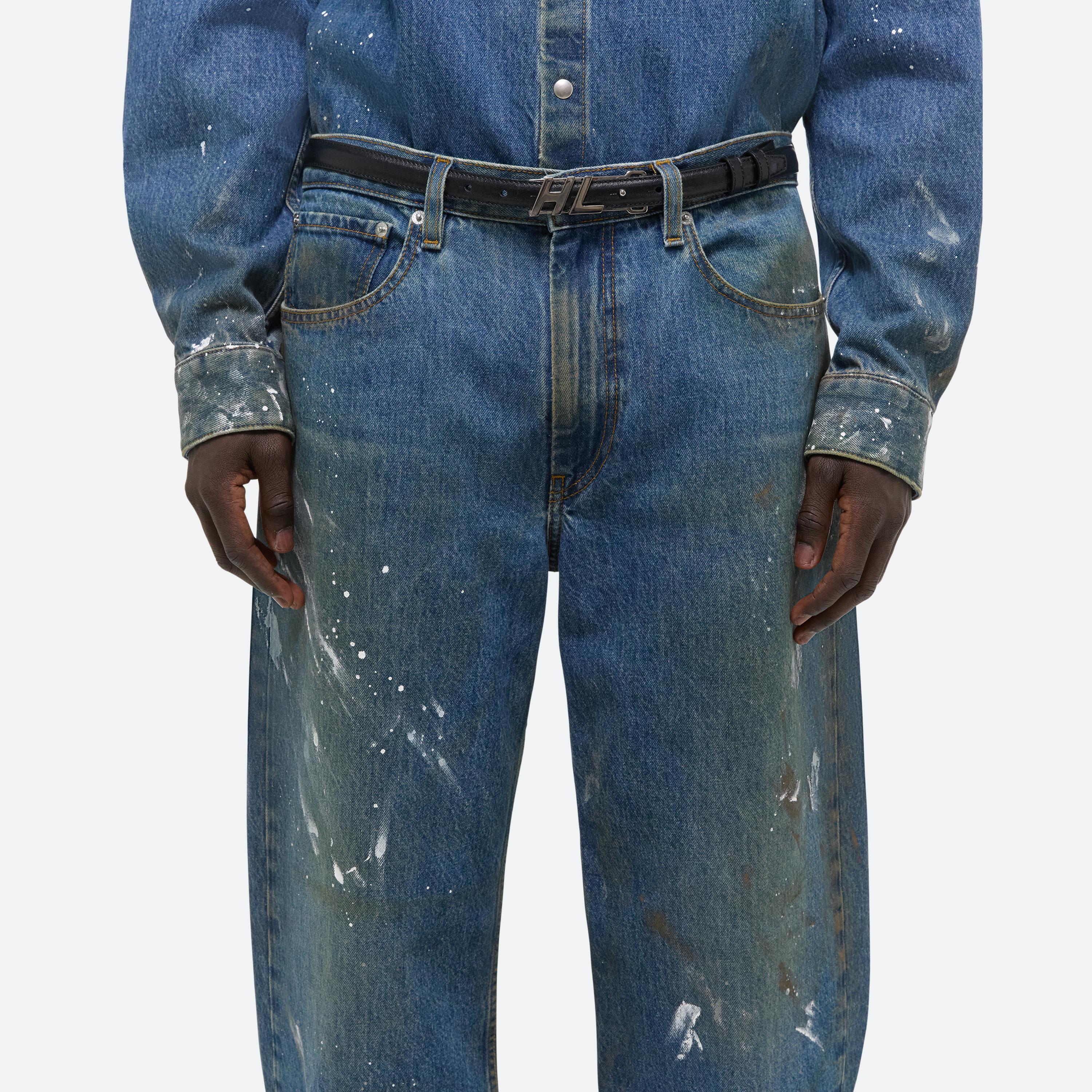 Cropped mid-rise jeans with a loose fit and wide leg. Converts into a tapered leg using two sets of snaps at the ankle. Each pair is finished by hand with paint and oil staining for a one-of-a-kind patina.