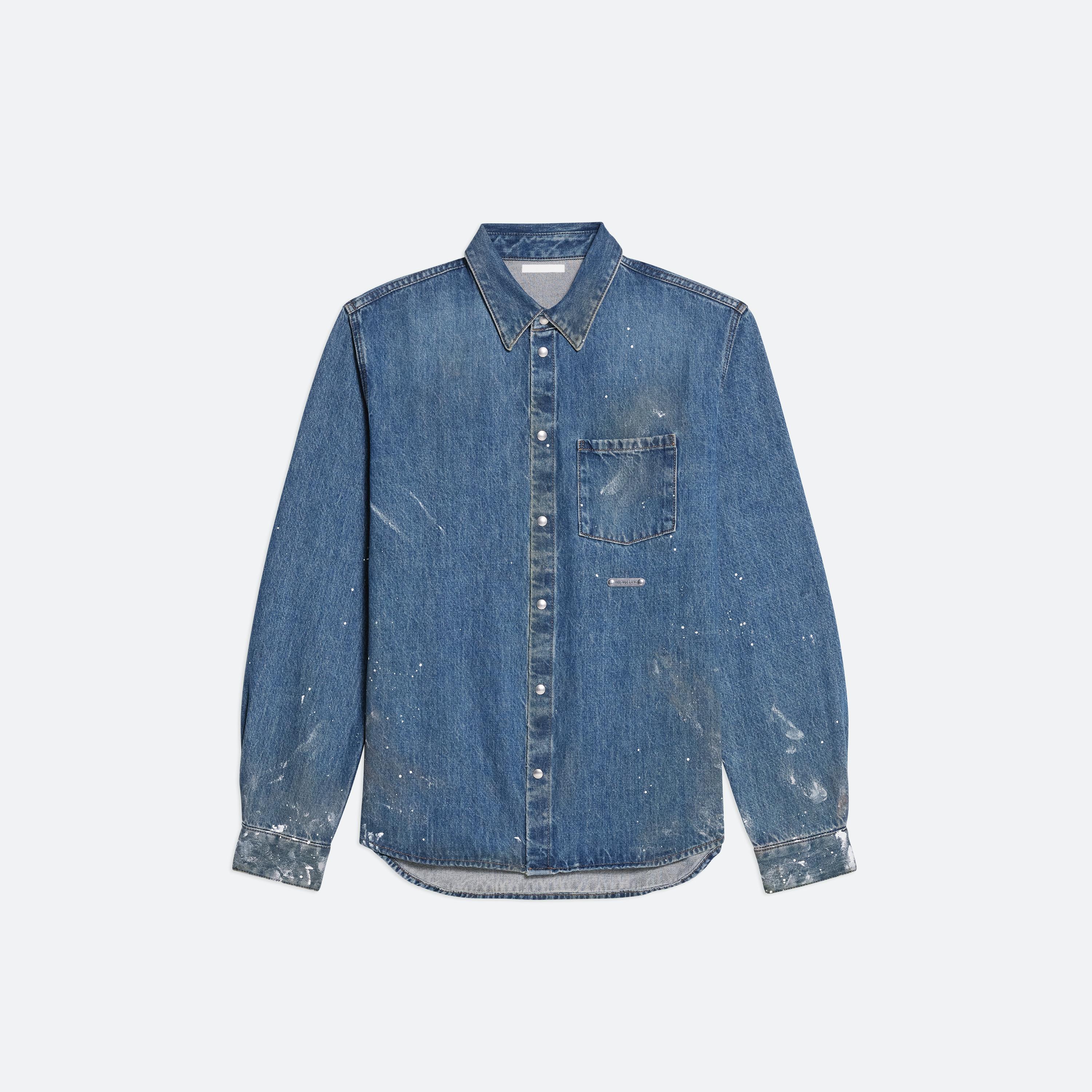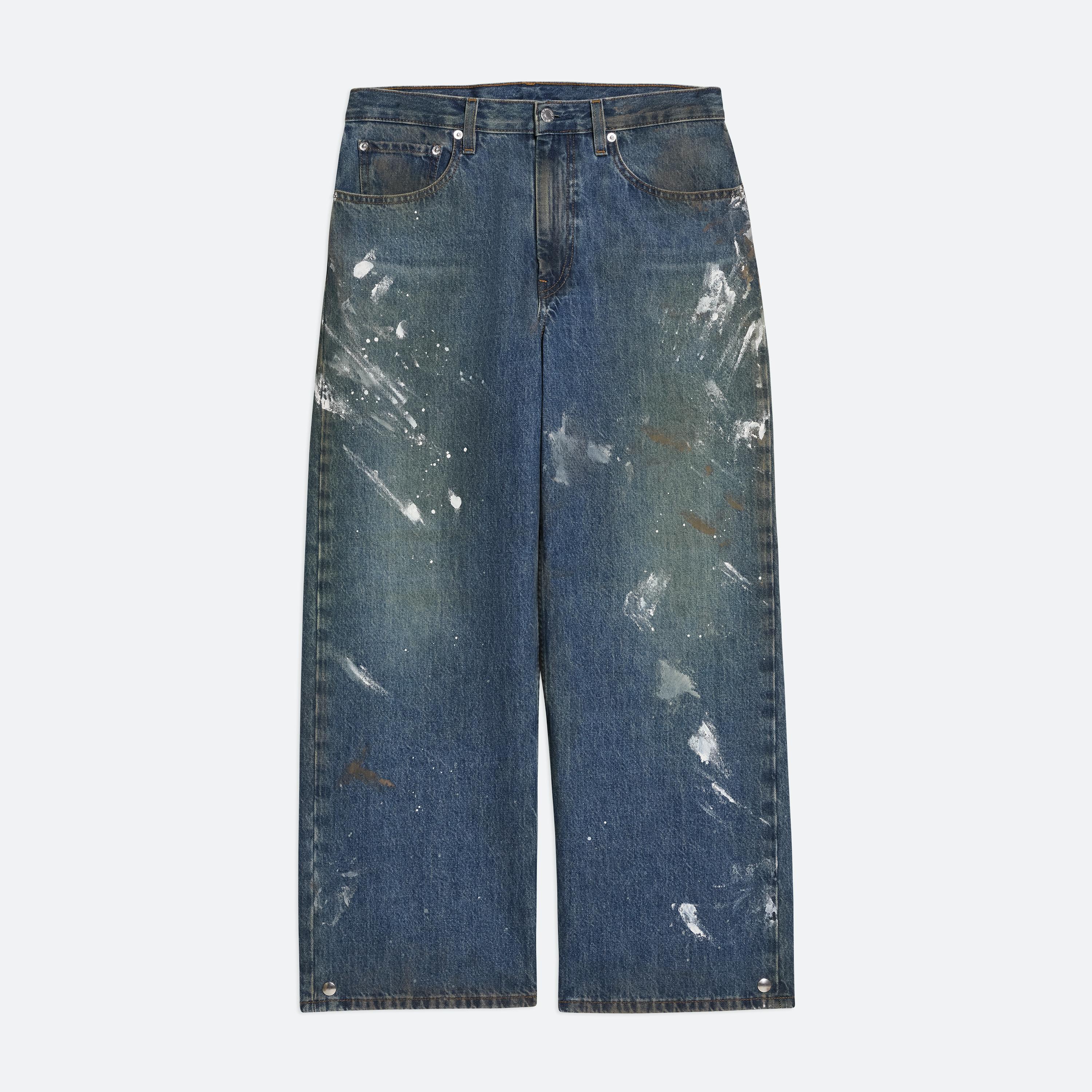 Cropped mid-rise jeans with a loose fit and wide leg. Converts into a tapered leg using two sets of snaps at the ankle. Each pair is finished by hand with paint and oil staining for a one-of-a-kind patina.