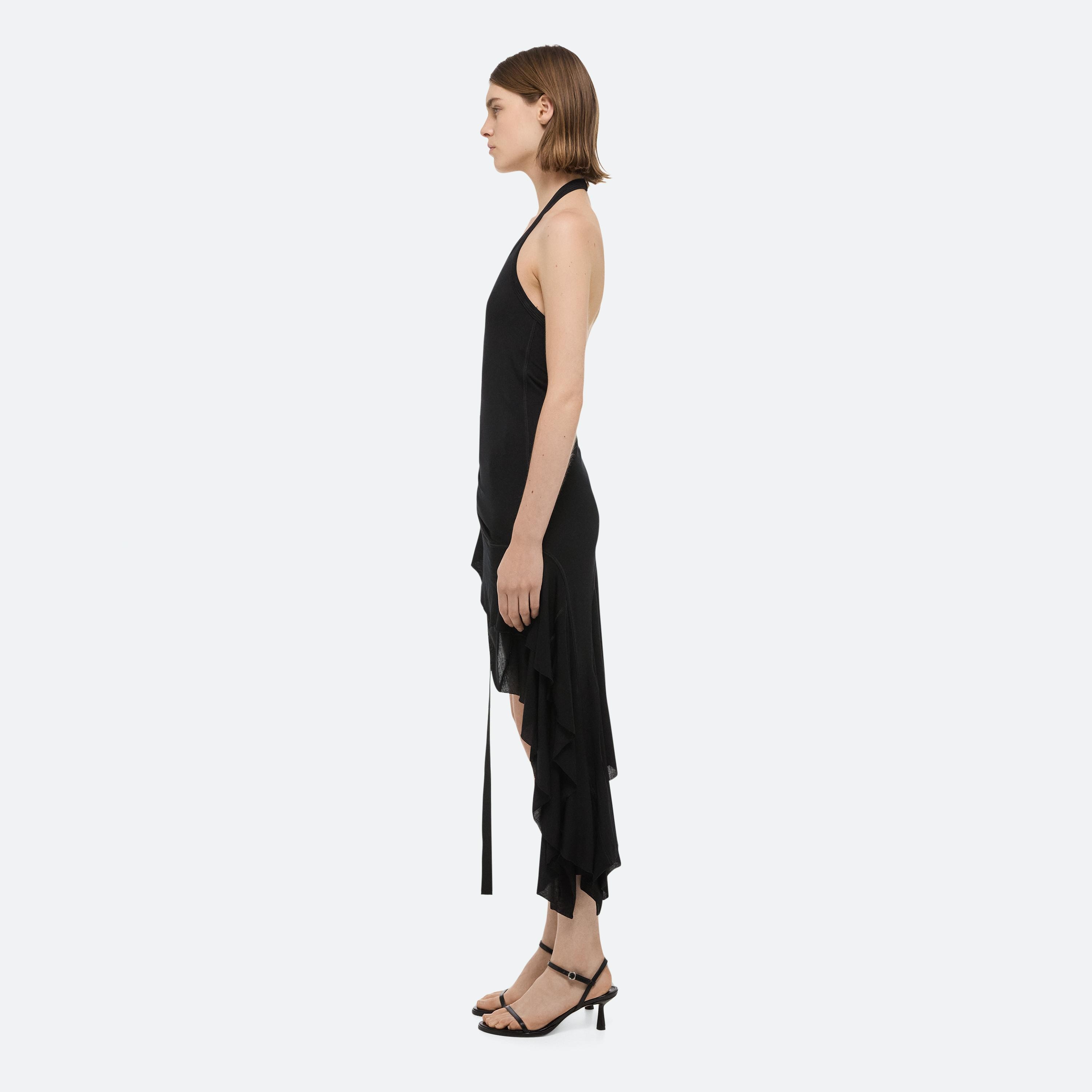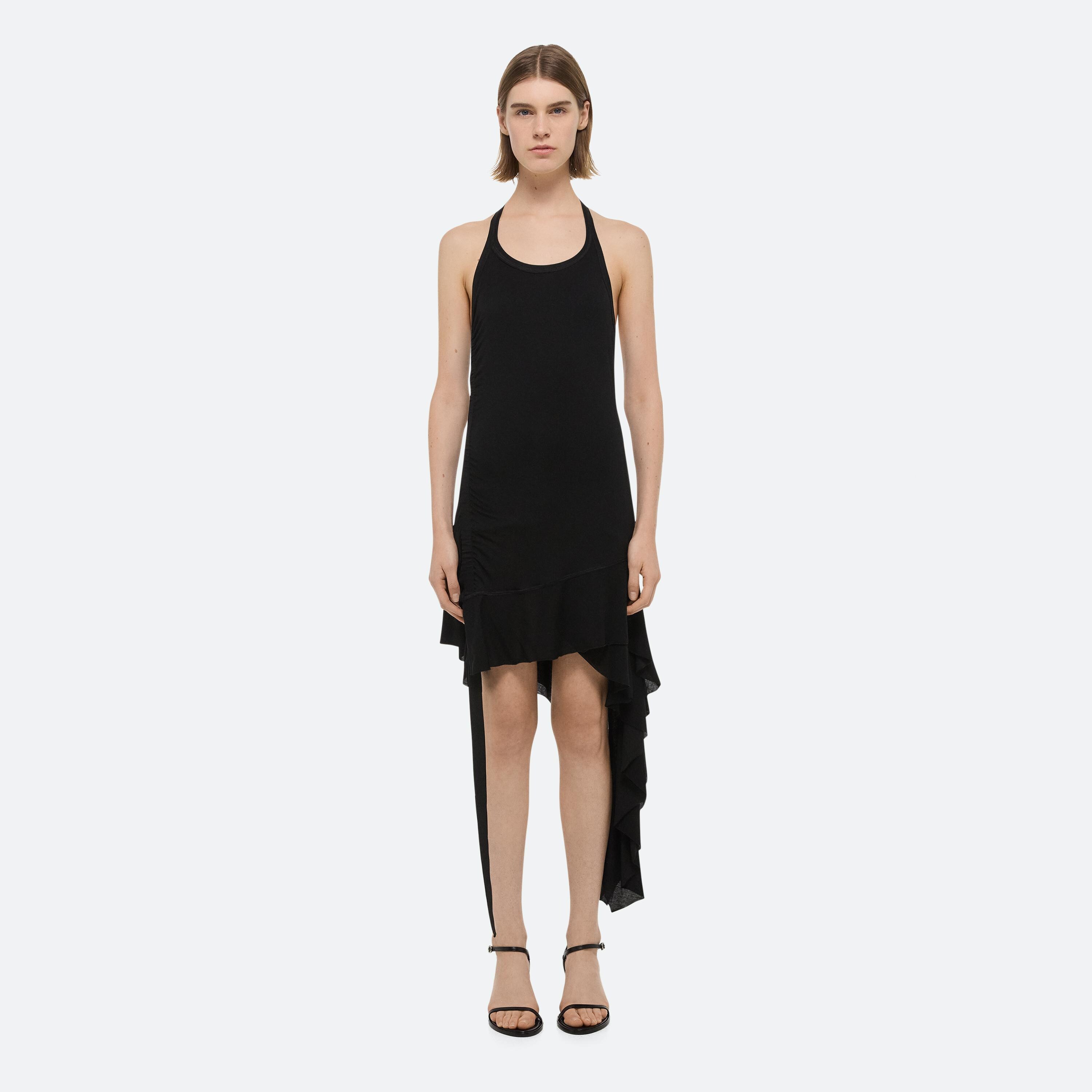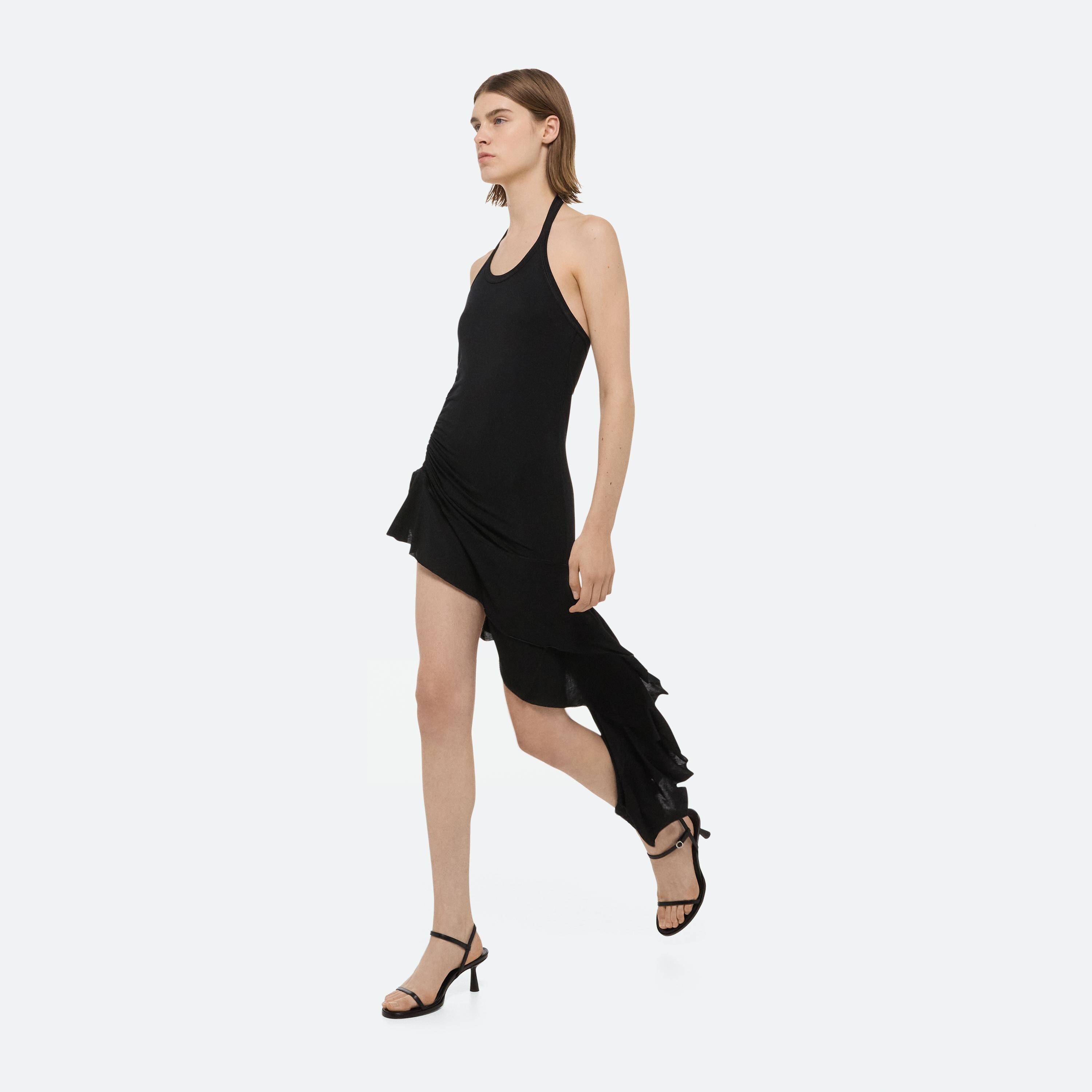 Halter-neck dress in soft lyocell jersey. Control the length using the signature seatbelt strap. Finished with an asymmetrical ruffled hem that adds movement to every step.