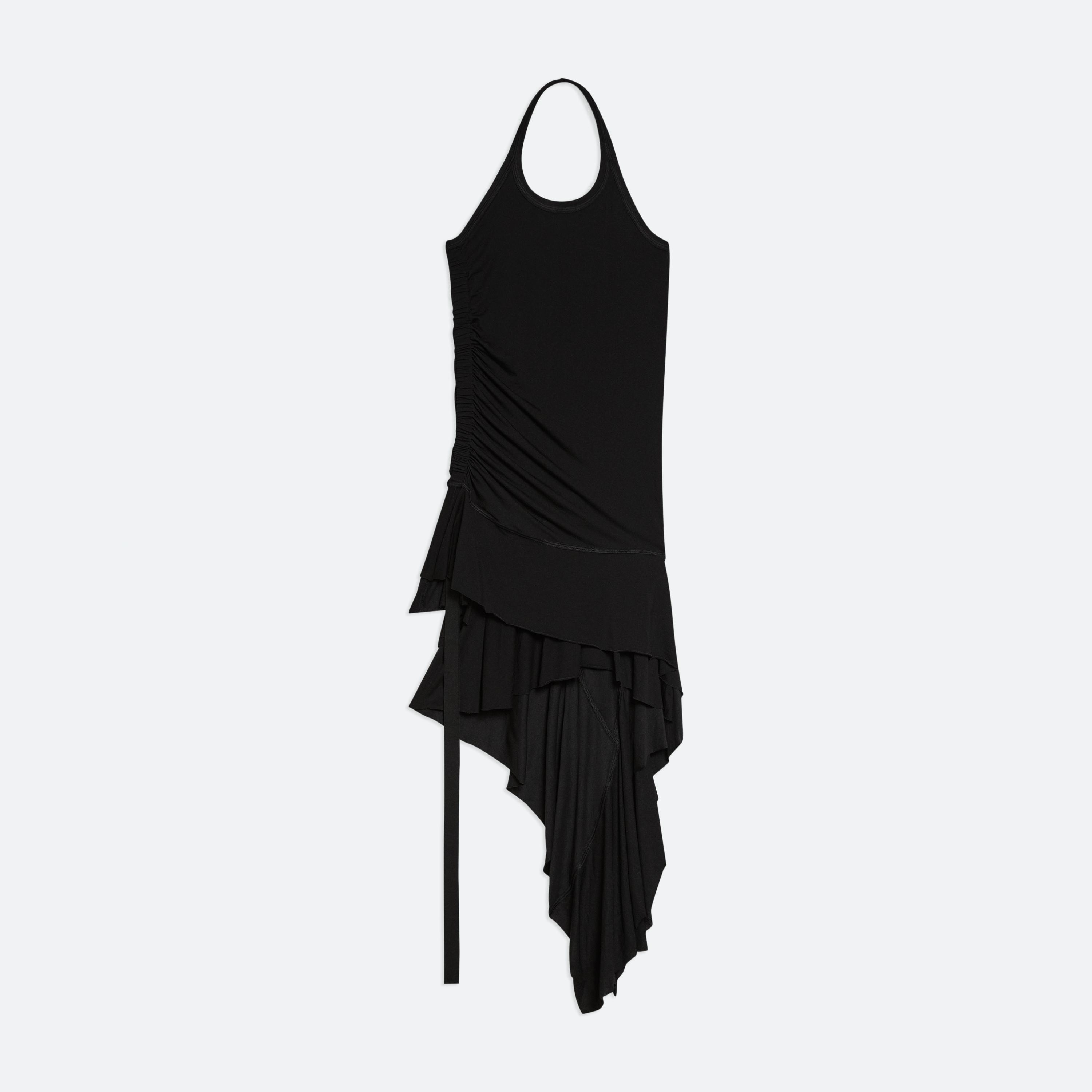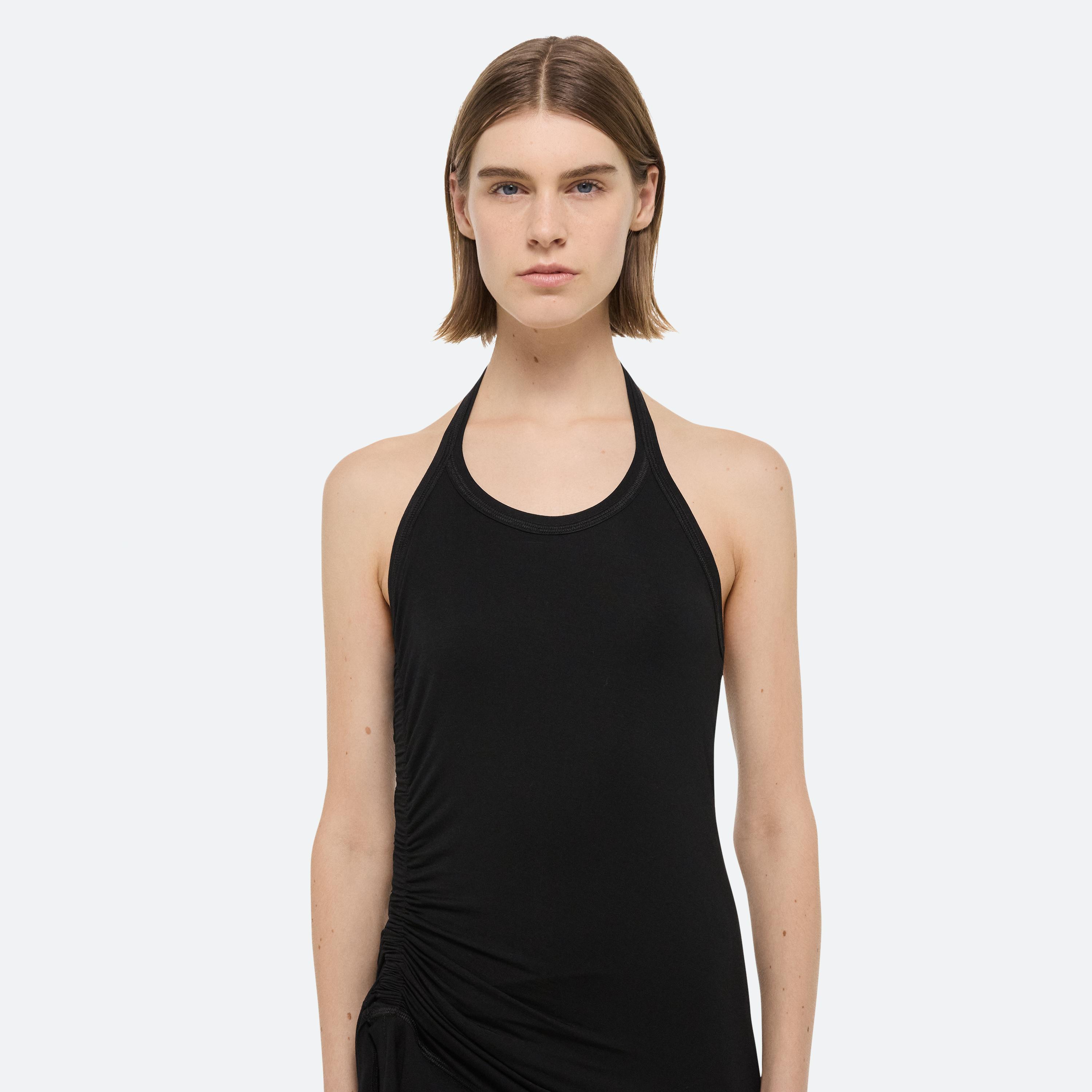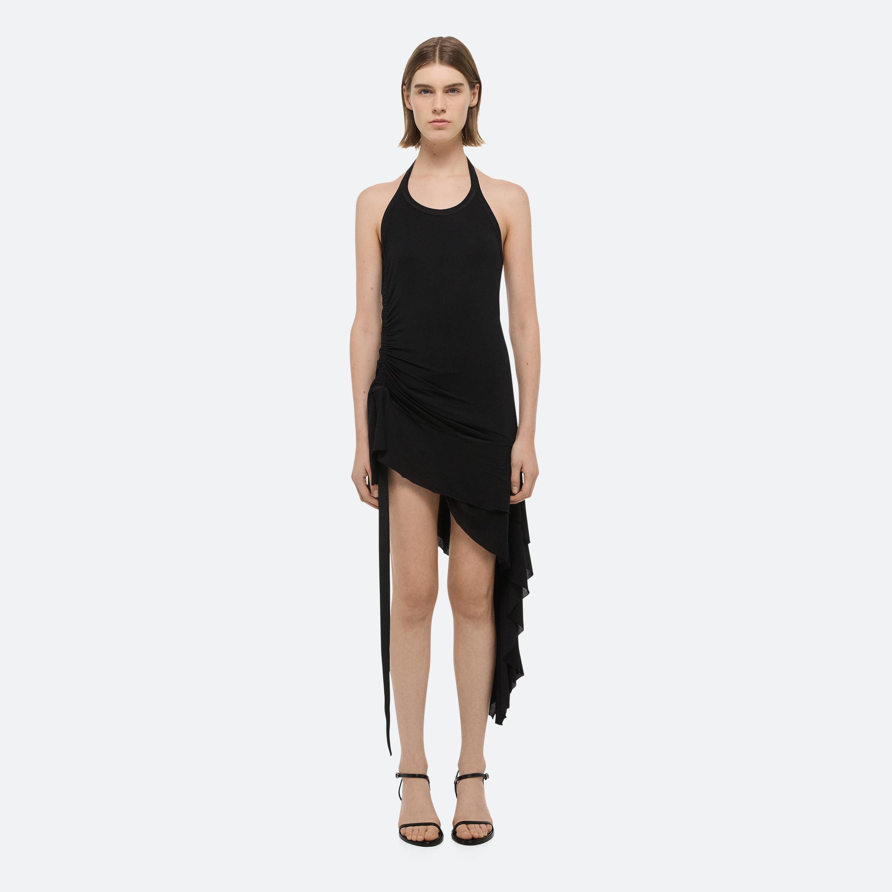 Halter-neck dress in soft lyocell jersey. Control the length using the signature seatbelt strap. Finished with an asymmetrical ruffled hem that adds movement to every step.