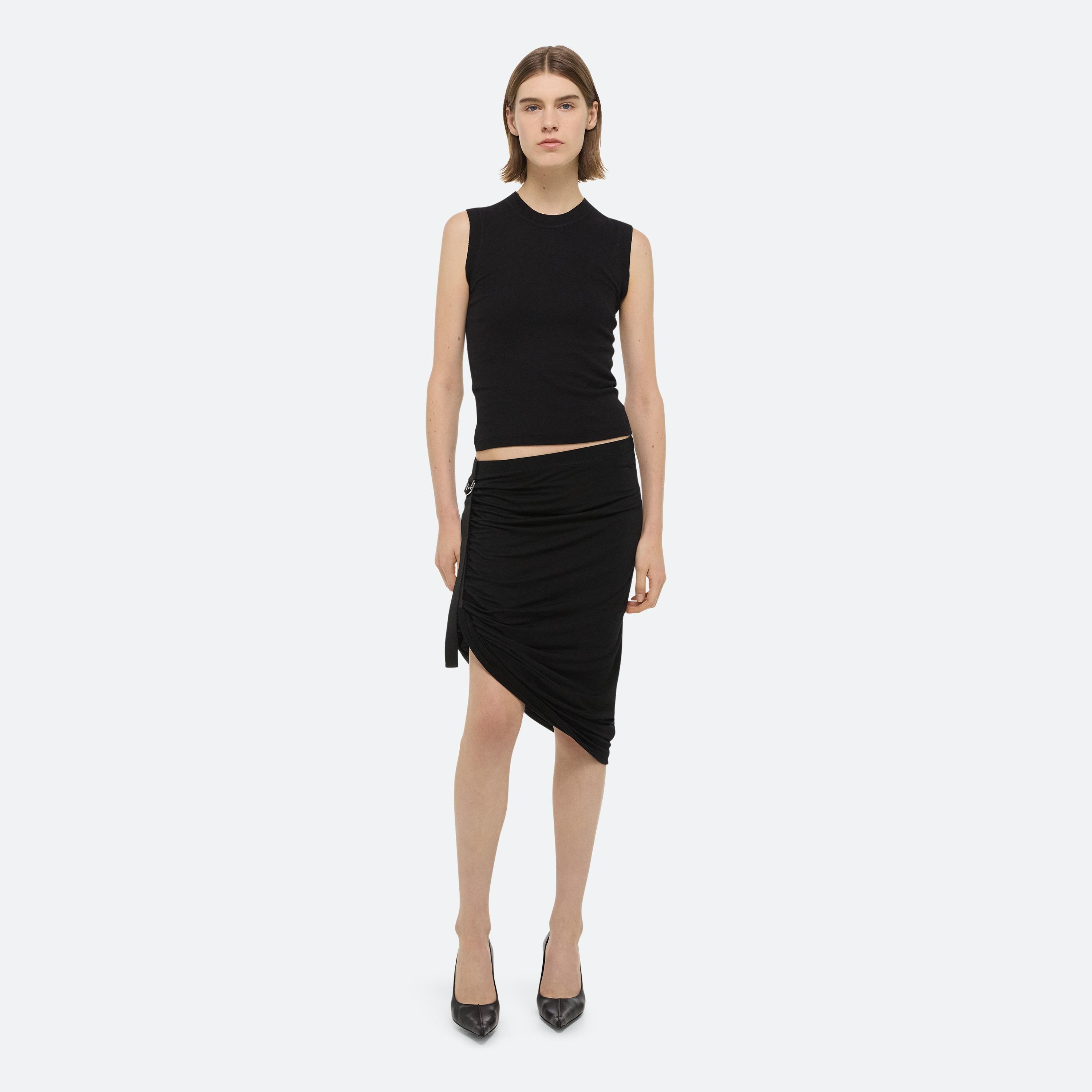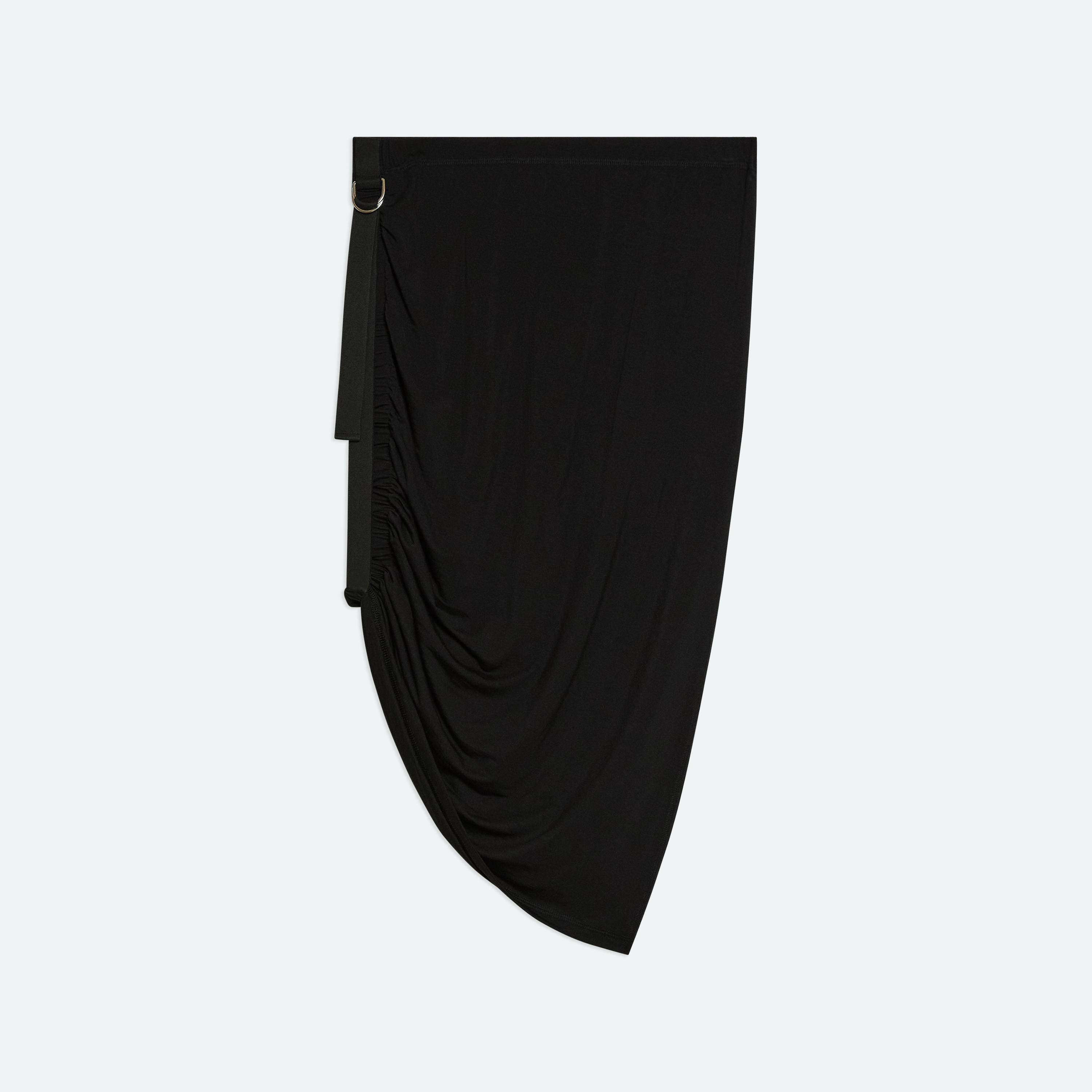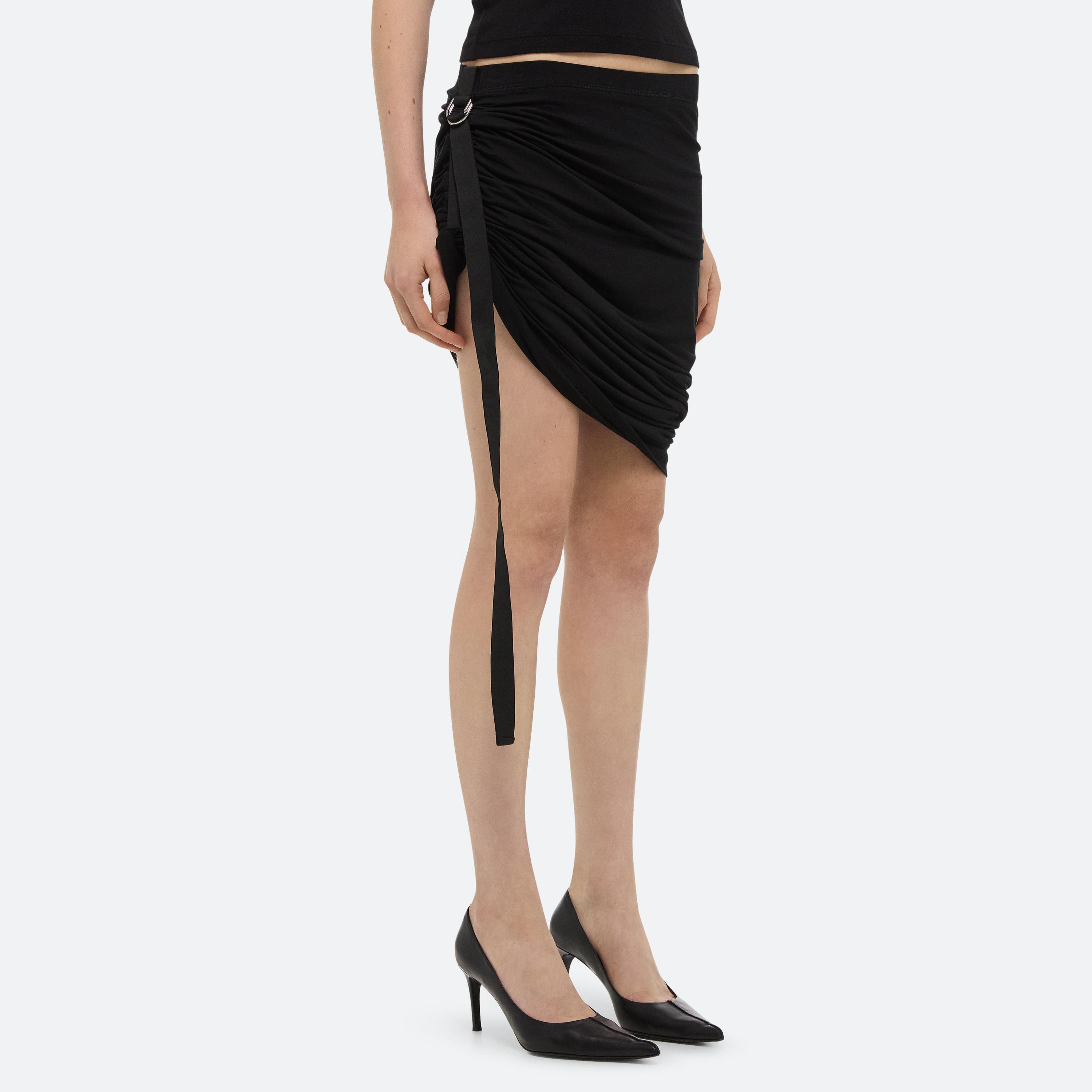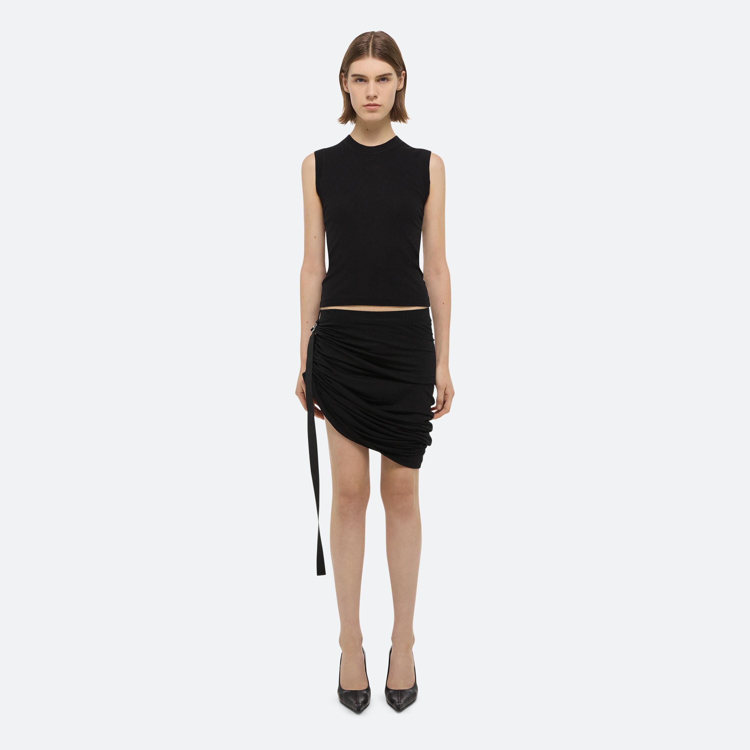 Draped skirt in soft lyocell jersey. Control the length of the skirt with our signature seatbelt strap to create an asymmetrical mini. Matches the Wind Harness Top.