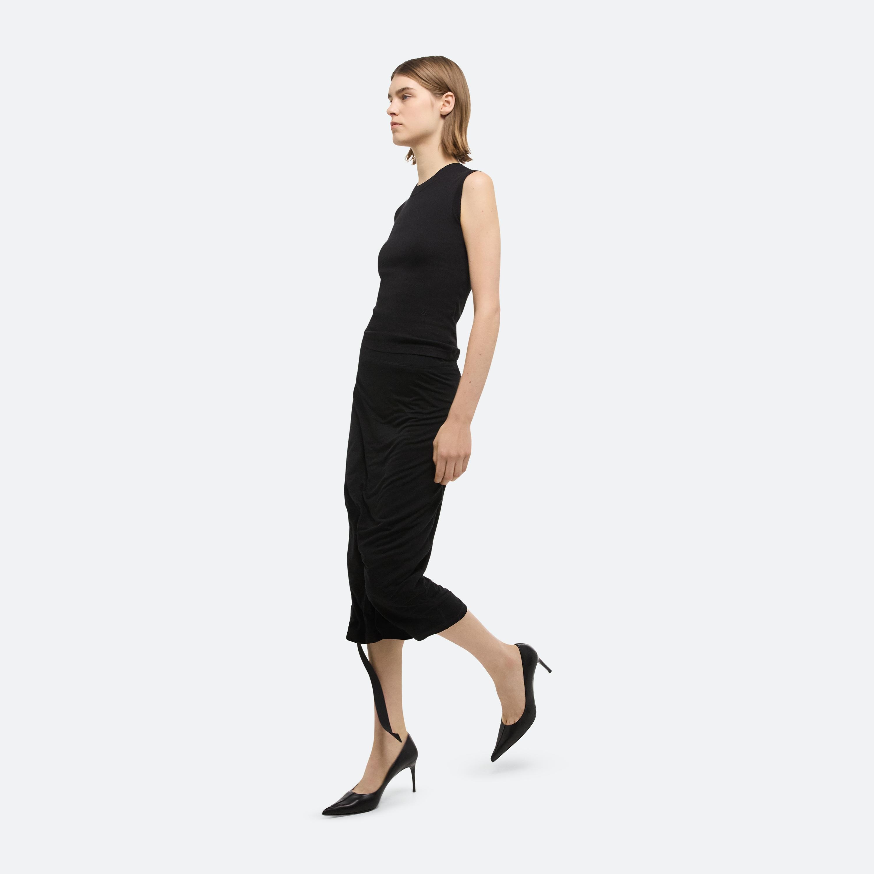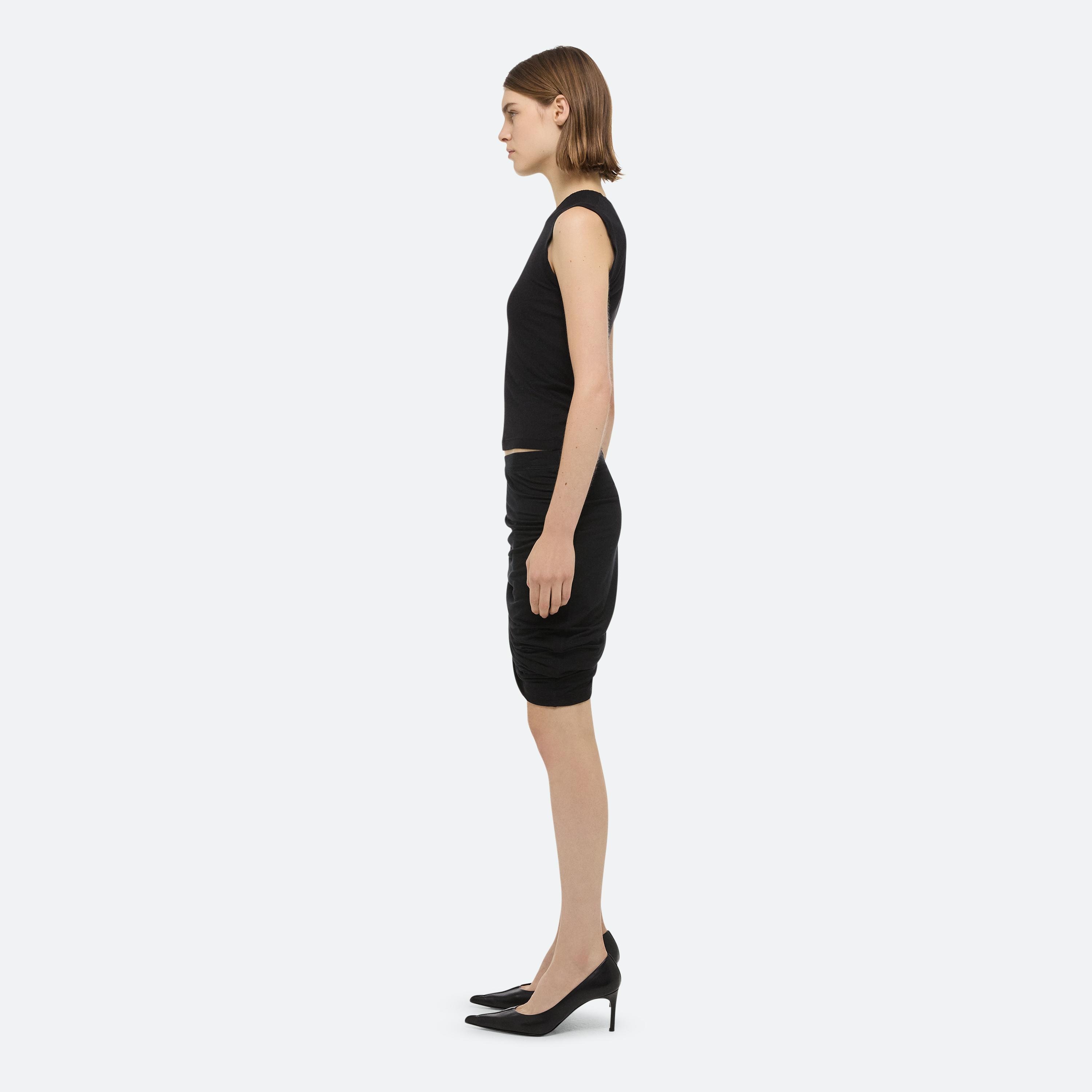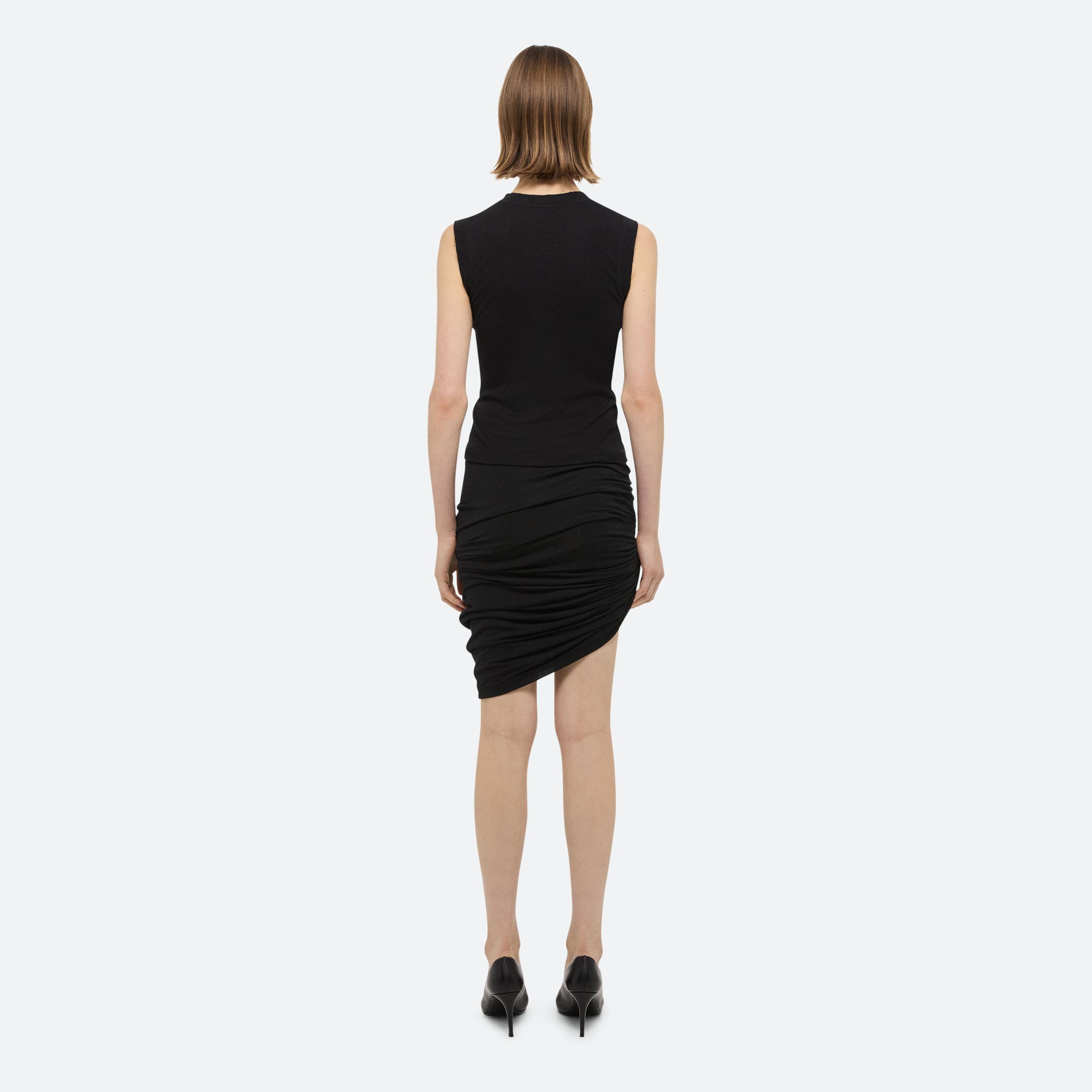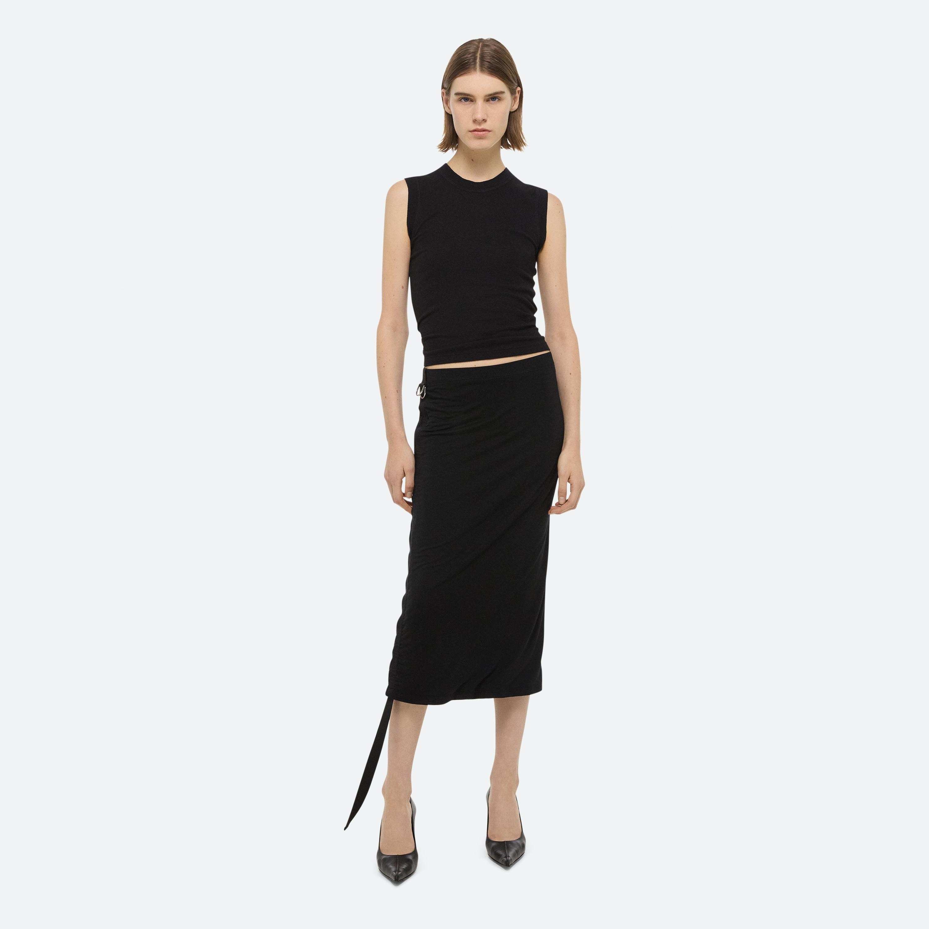 Draped skirt in soft lyocell jersey. Control the length of the skirt with our signature seatbelt strap to create an asymmetrical mini. Matches the Wind Harness Top.