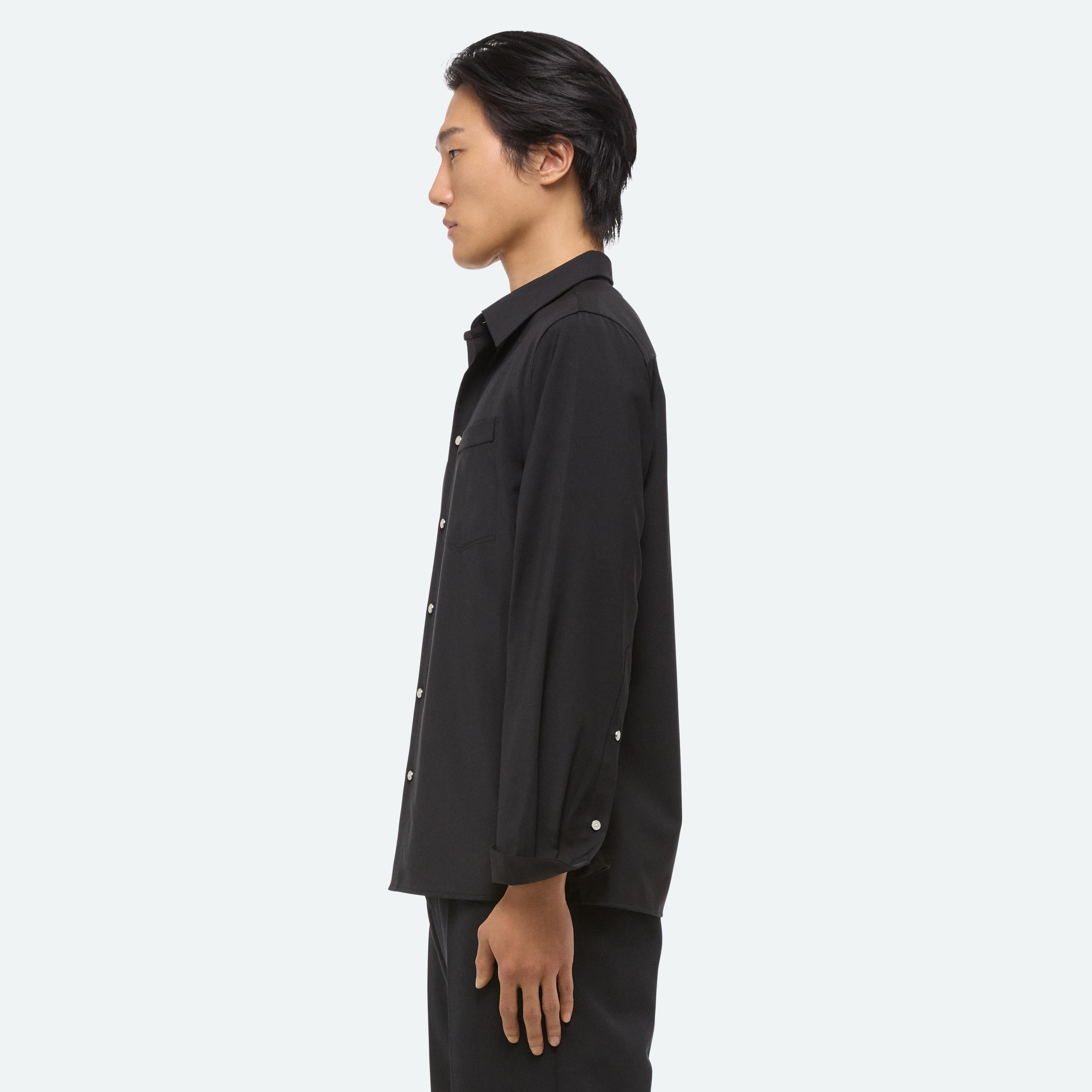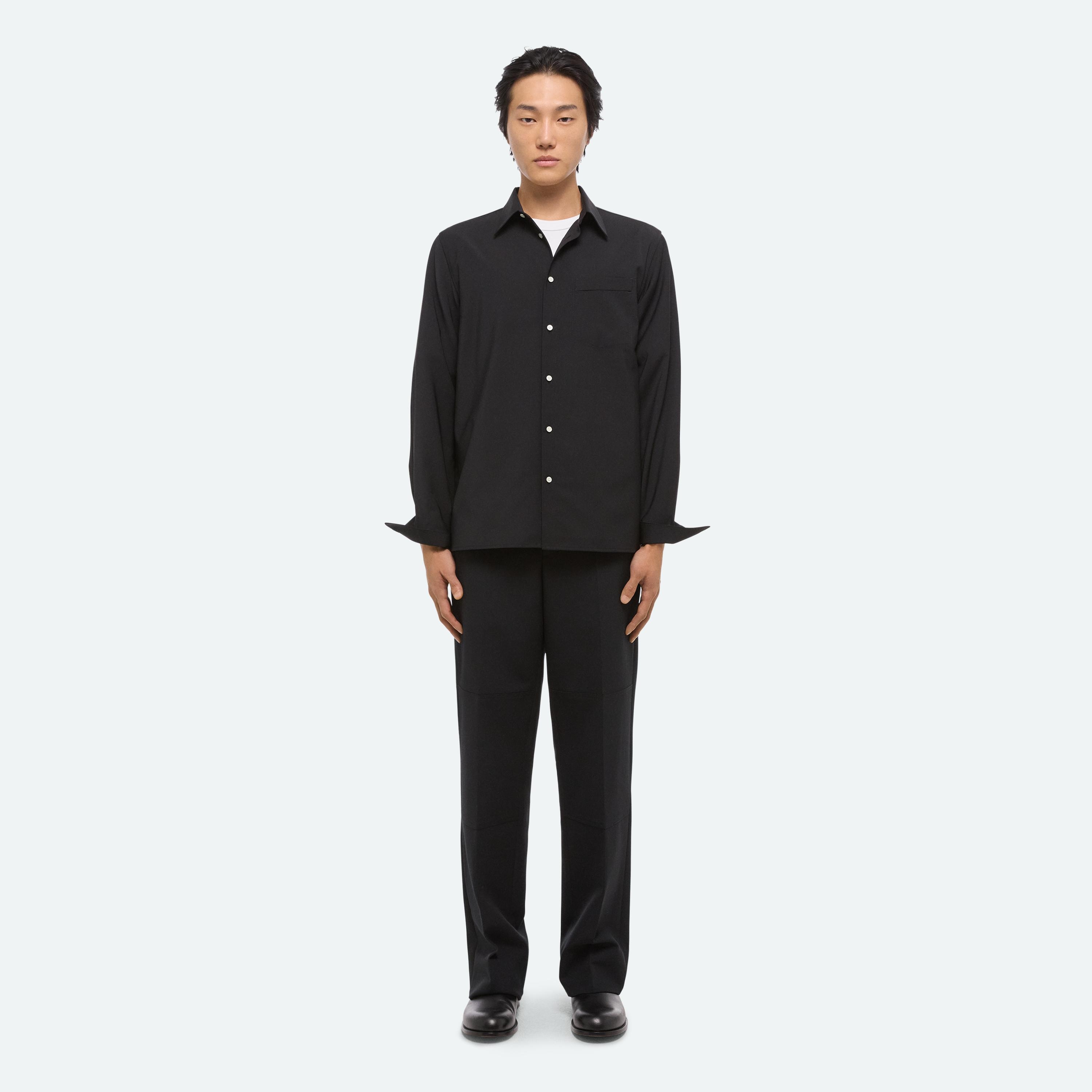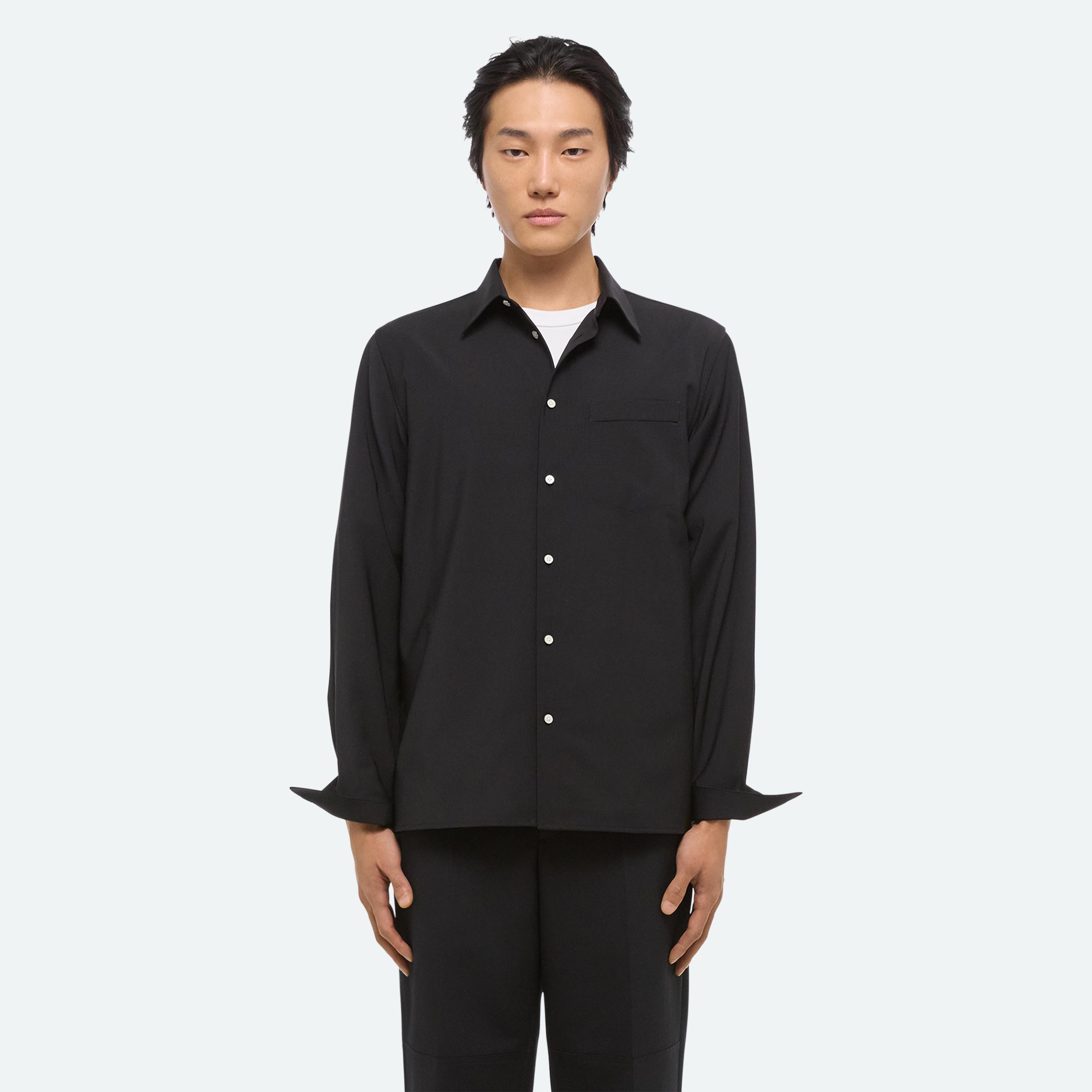 Classic shirt in a lightweight tropical wool with contrasting white buttons.
