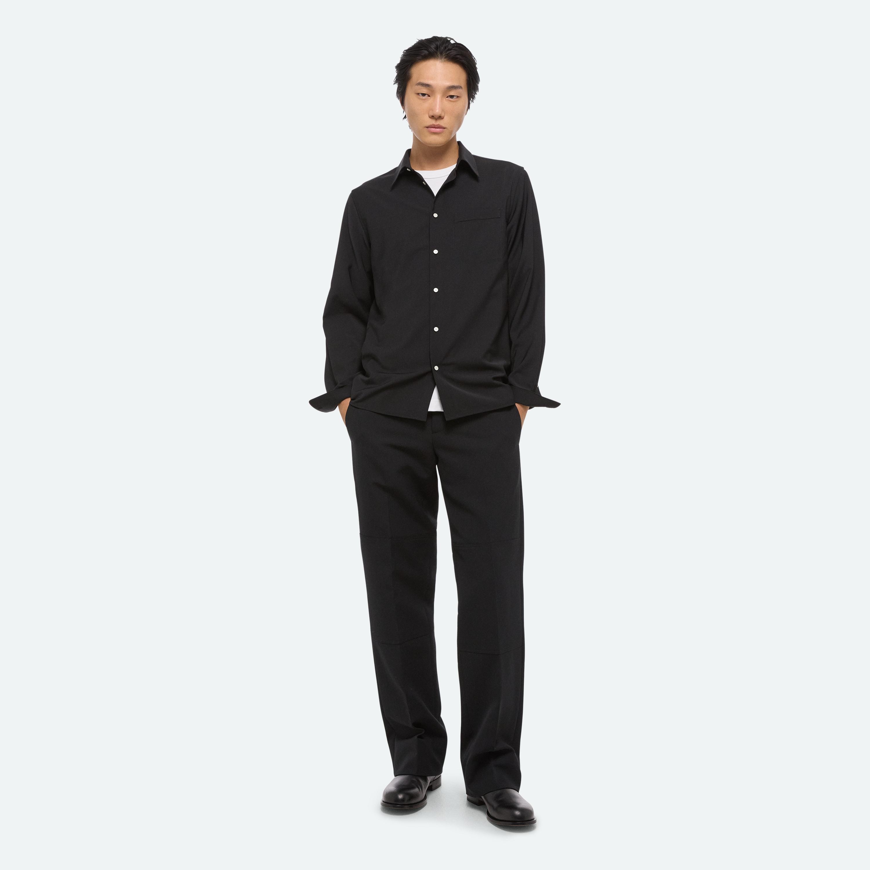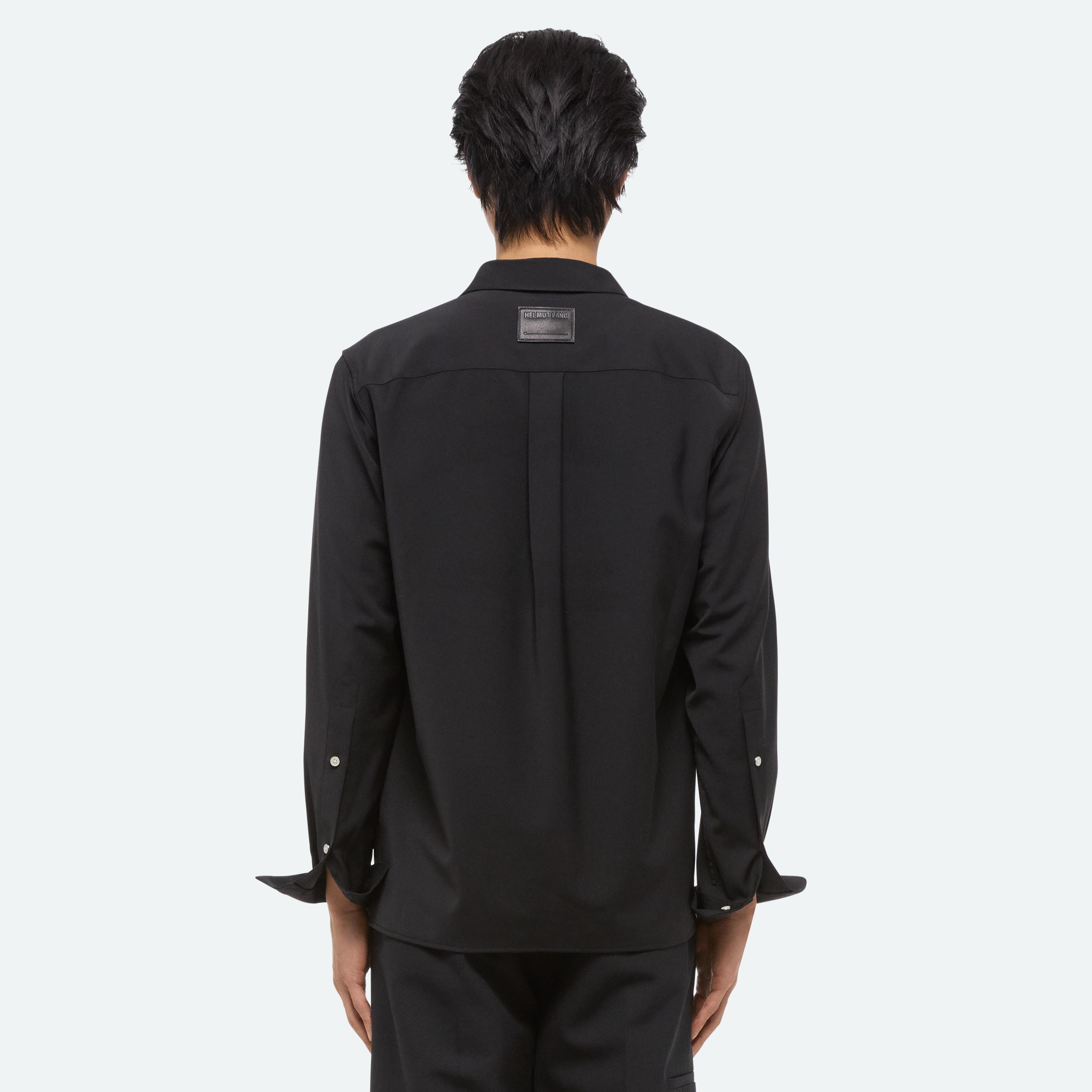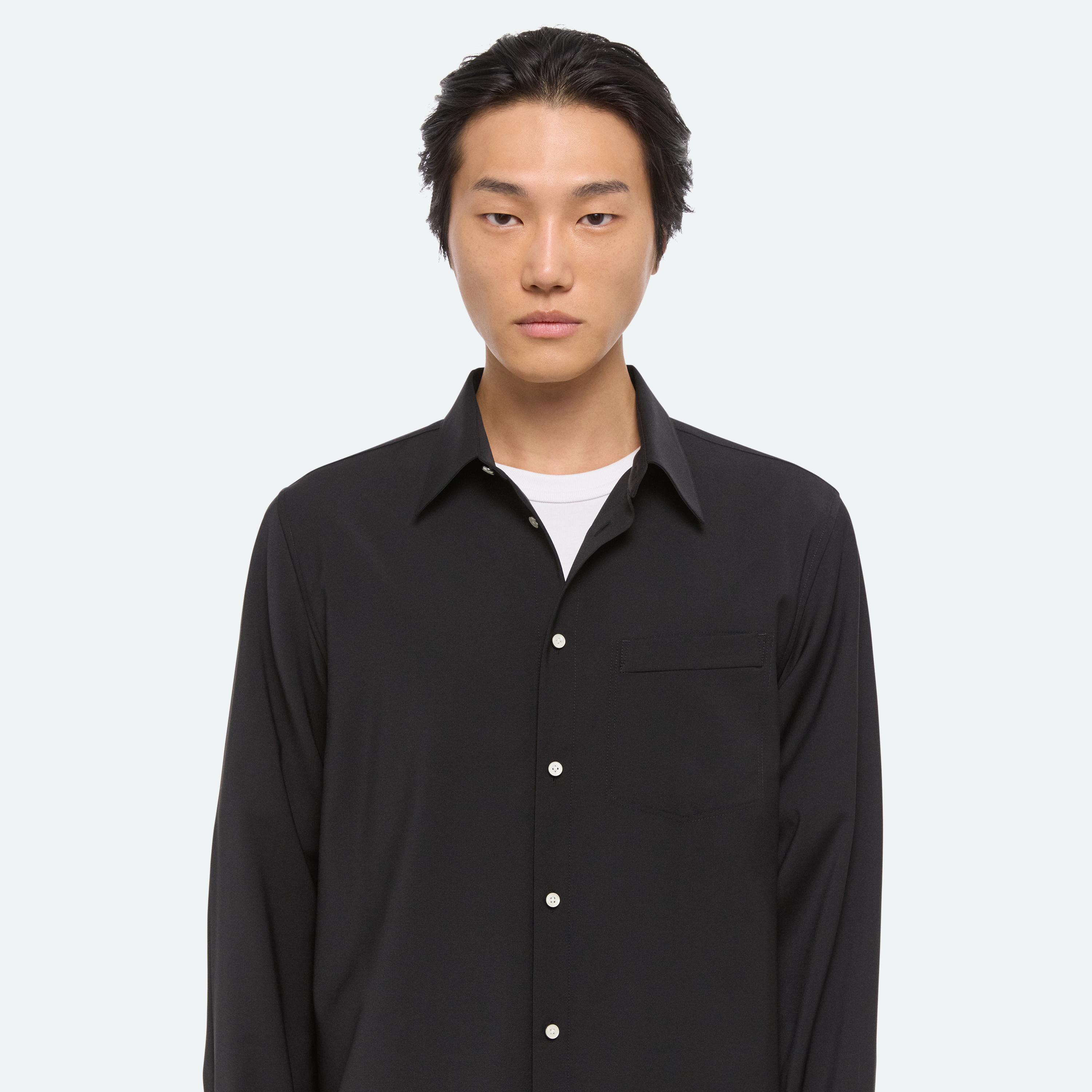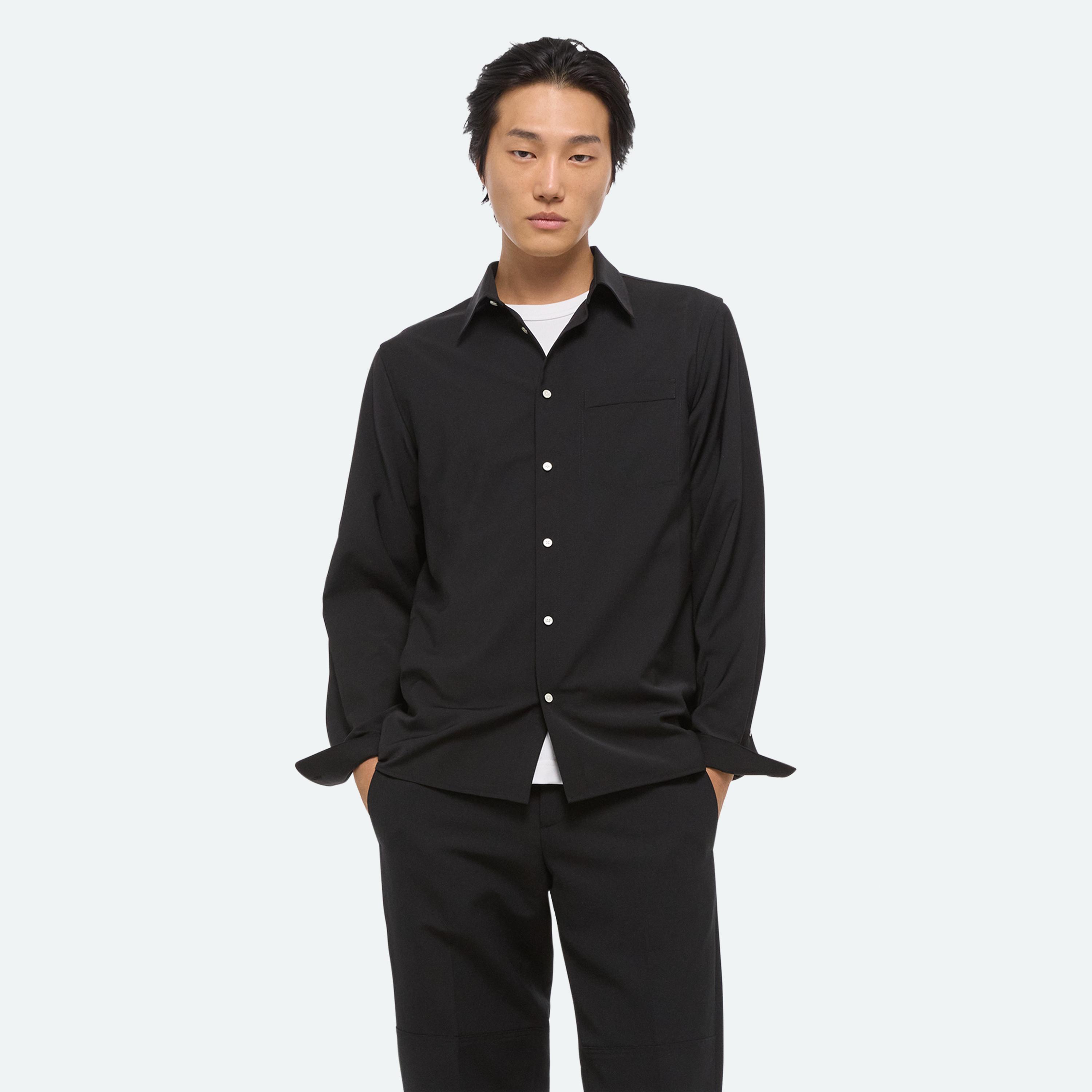 Classic shirt in a lightweight tropical wool with contrasting white buttons.