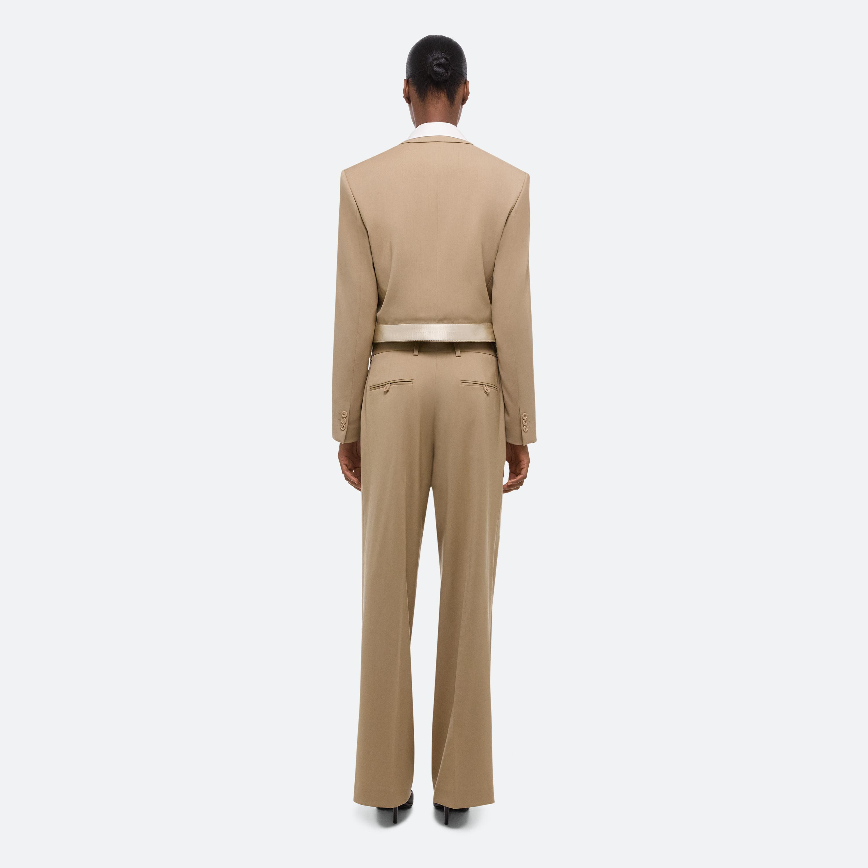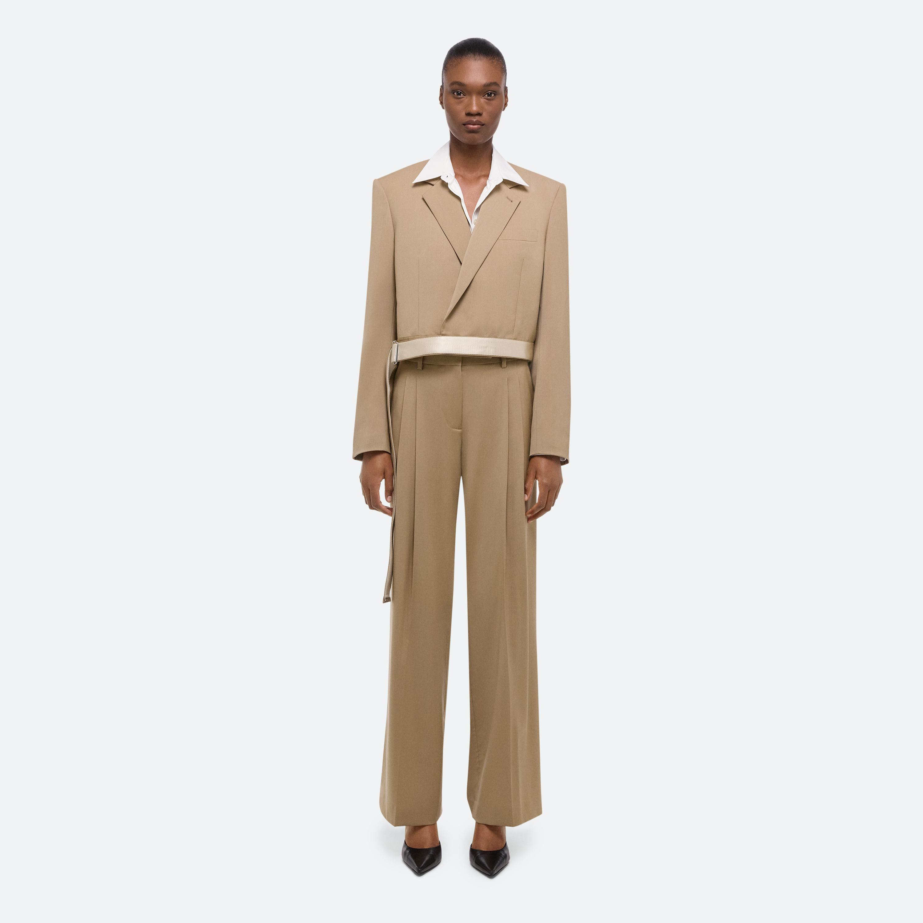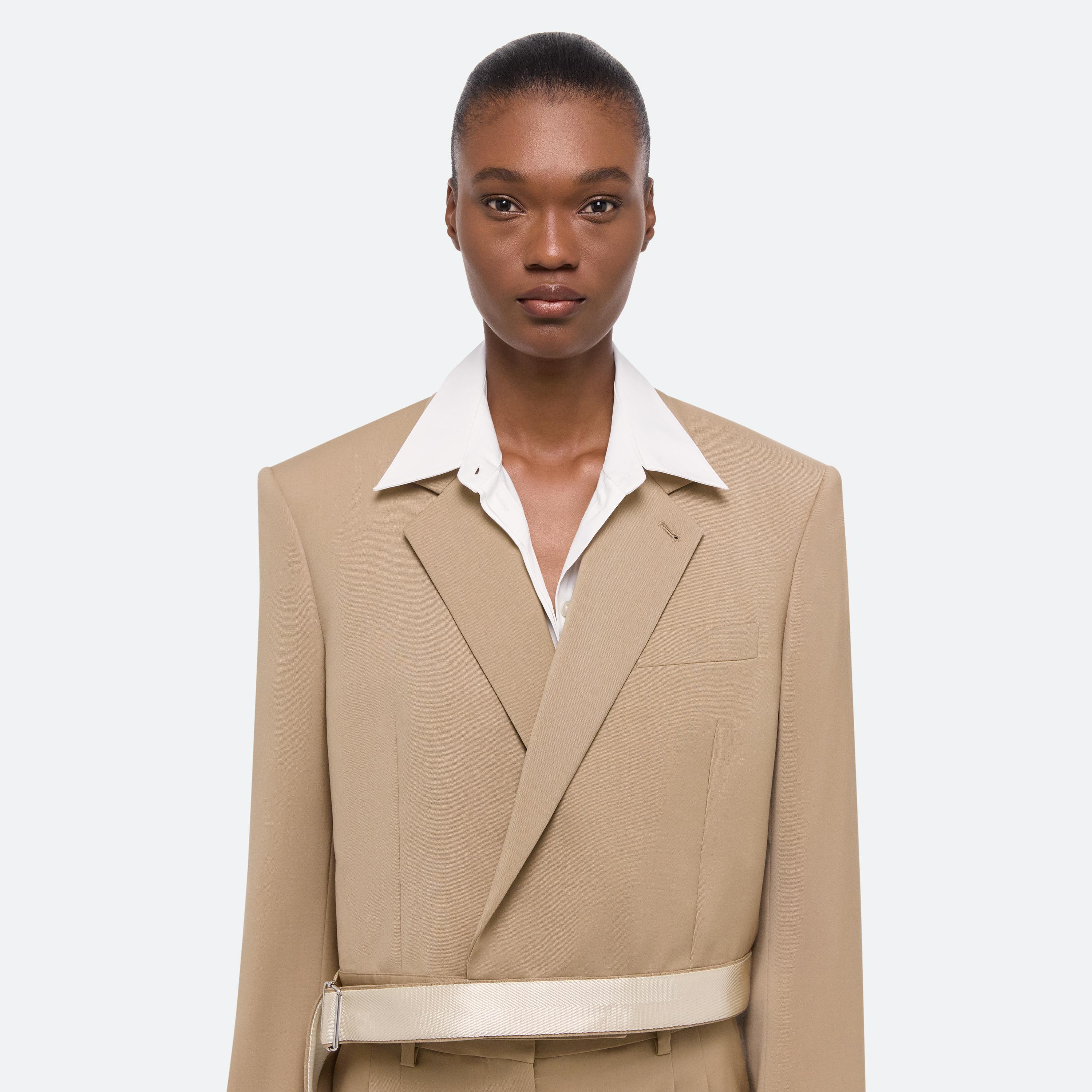 Cropped blazer in virgin Italian wool that cinches closed with our signature seatbelt strap. Features classic details like notched lapels and chest welt pocket.