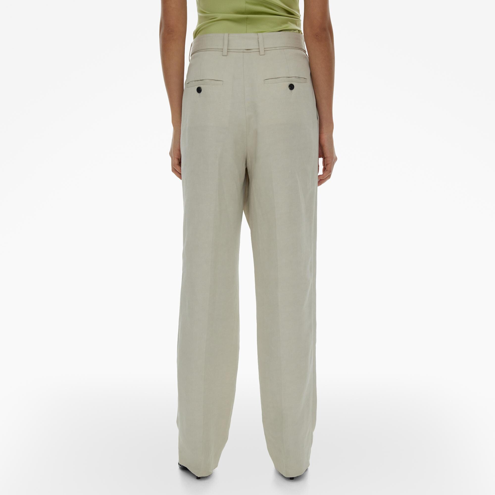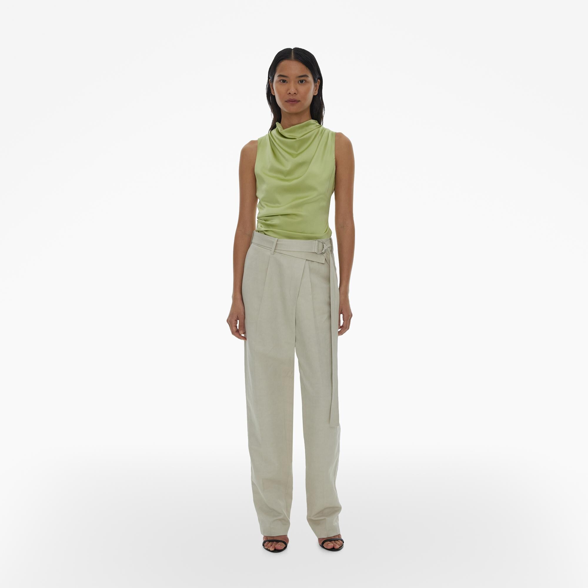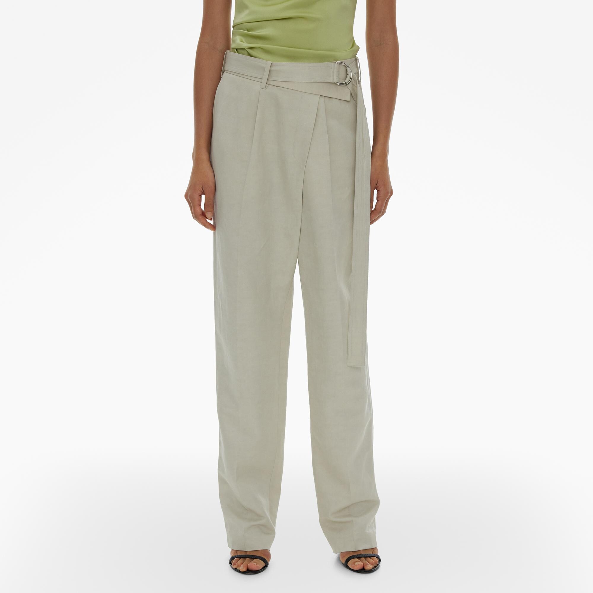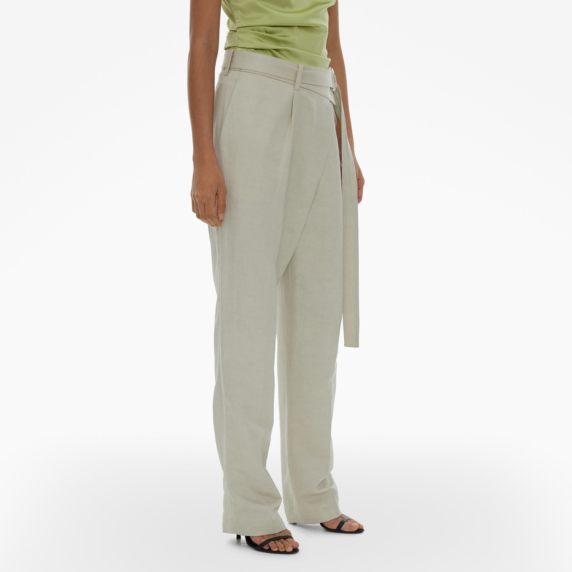 The Helmut Lang Wrap Pant is a high-rise straight-leg style in a cotton-linen blend with belt loops, adjustable D-ring belt, slant pockets, back button pockets, and wrap overlay fly with zip and hook closures.