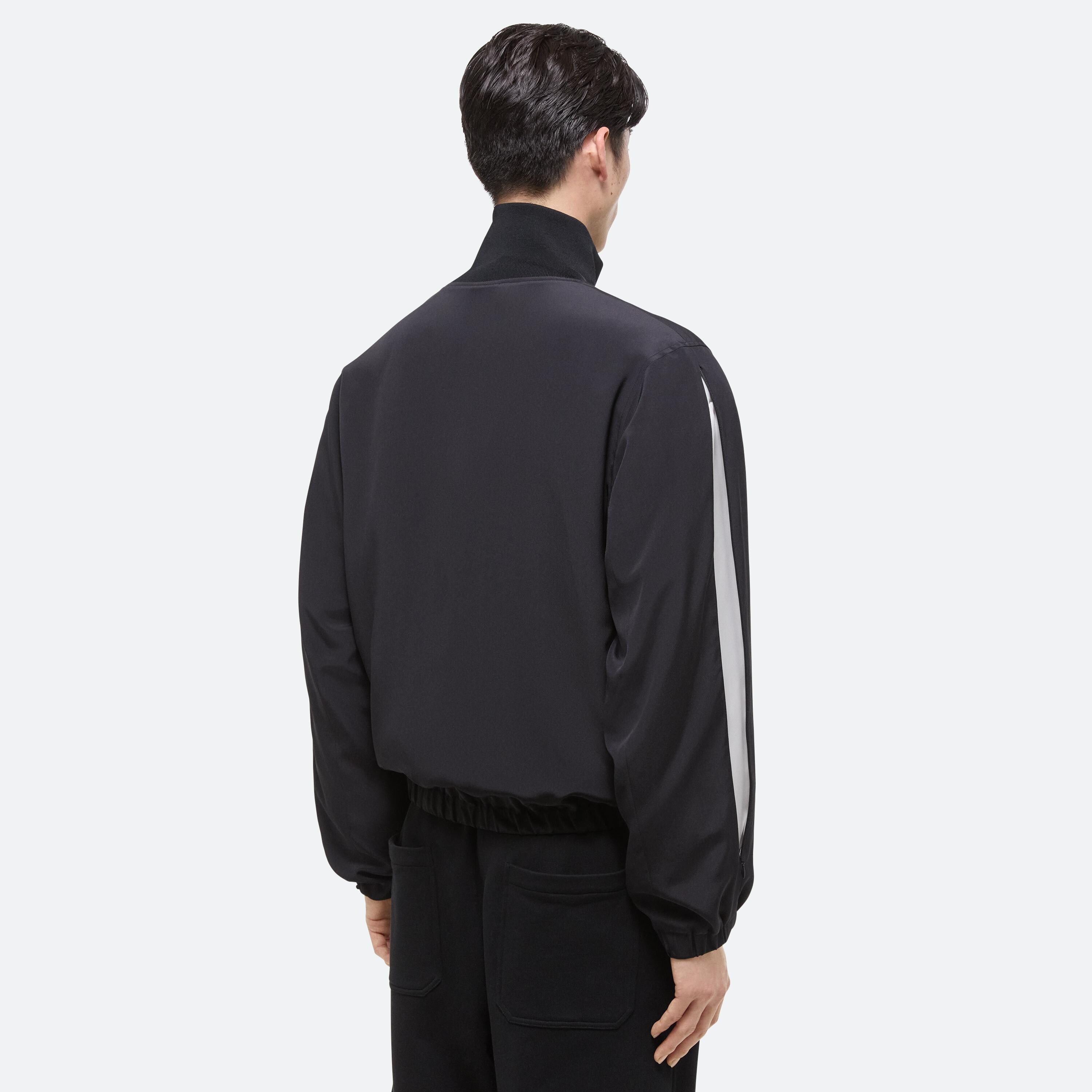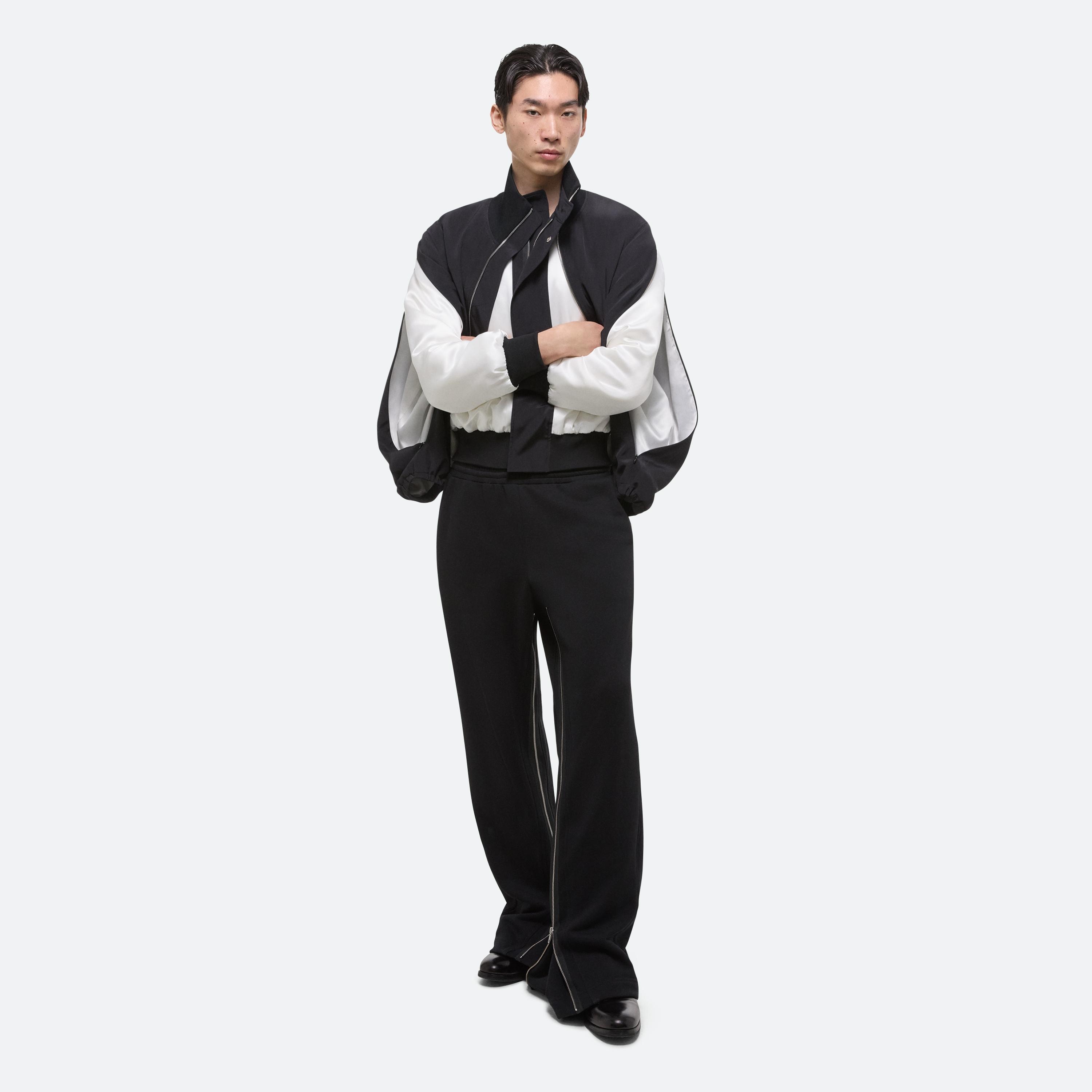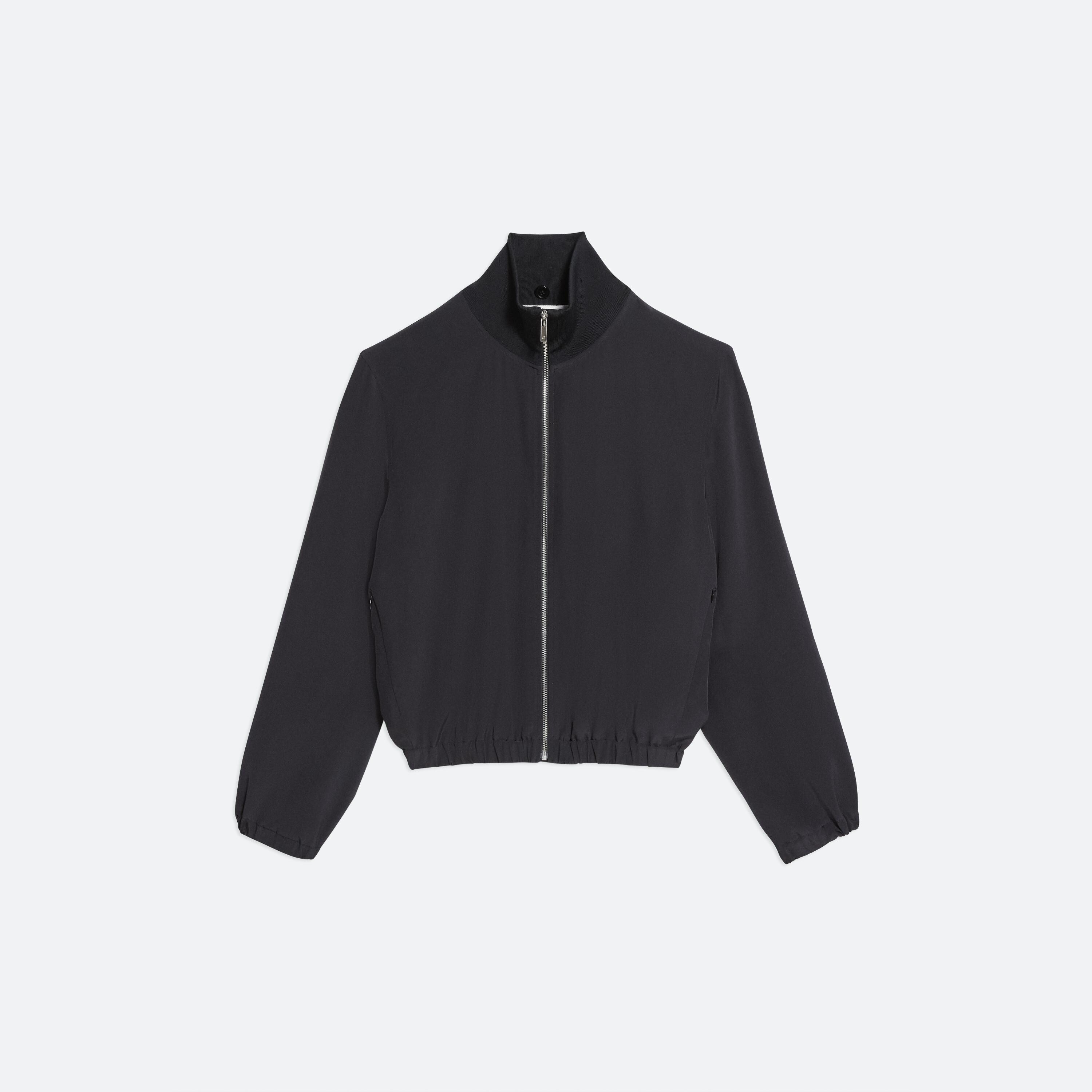 Layered silk bomber jacket with metal logo zipper. Full-length zippers along each sleeve open to add volume and reveal the inner layer, creating endless styling combinations. Each layer has its own pockets and closures, allowing them to be worn separately or together. Made from lightweight silk crepe de chine.