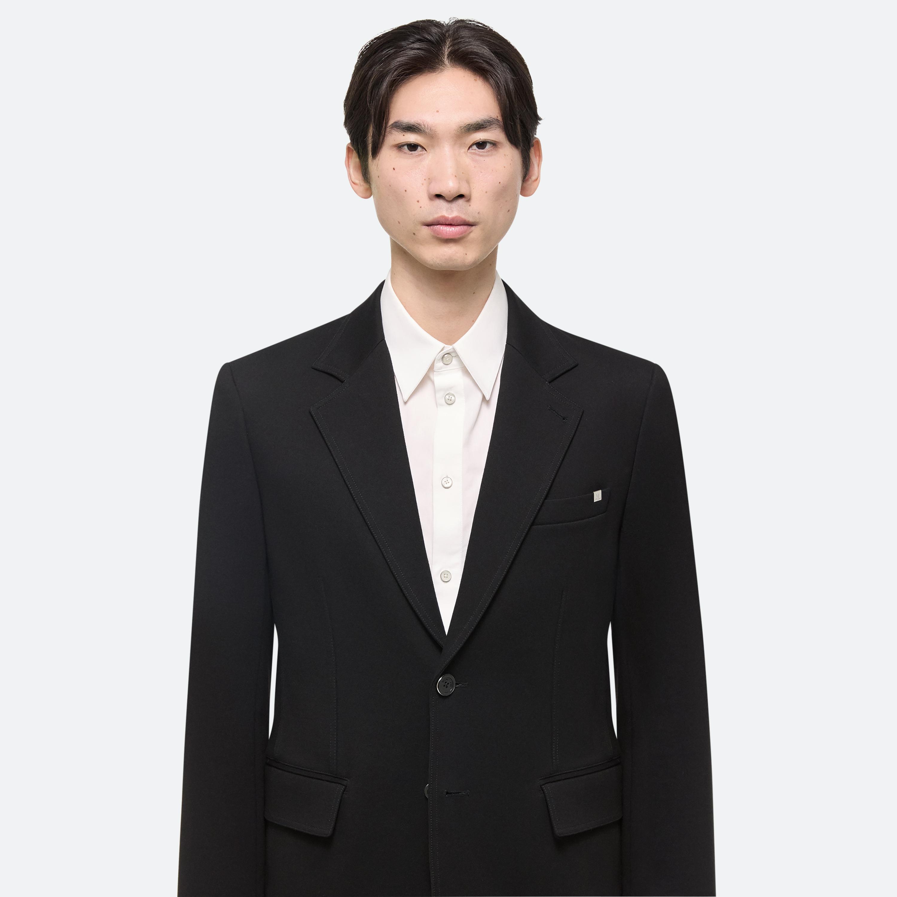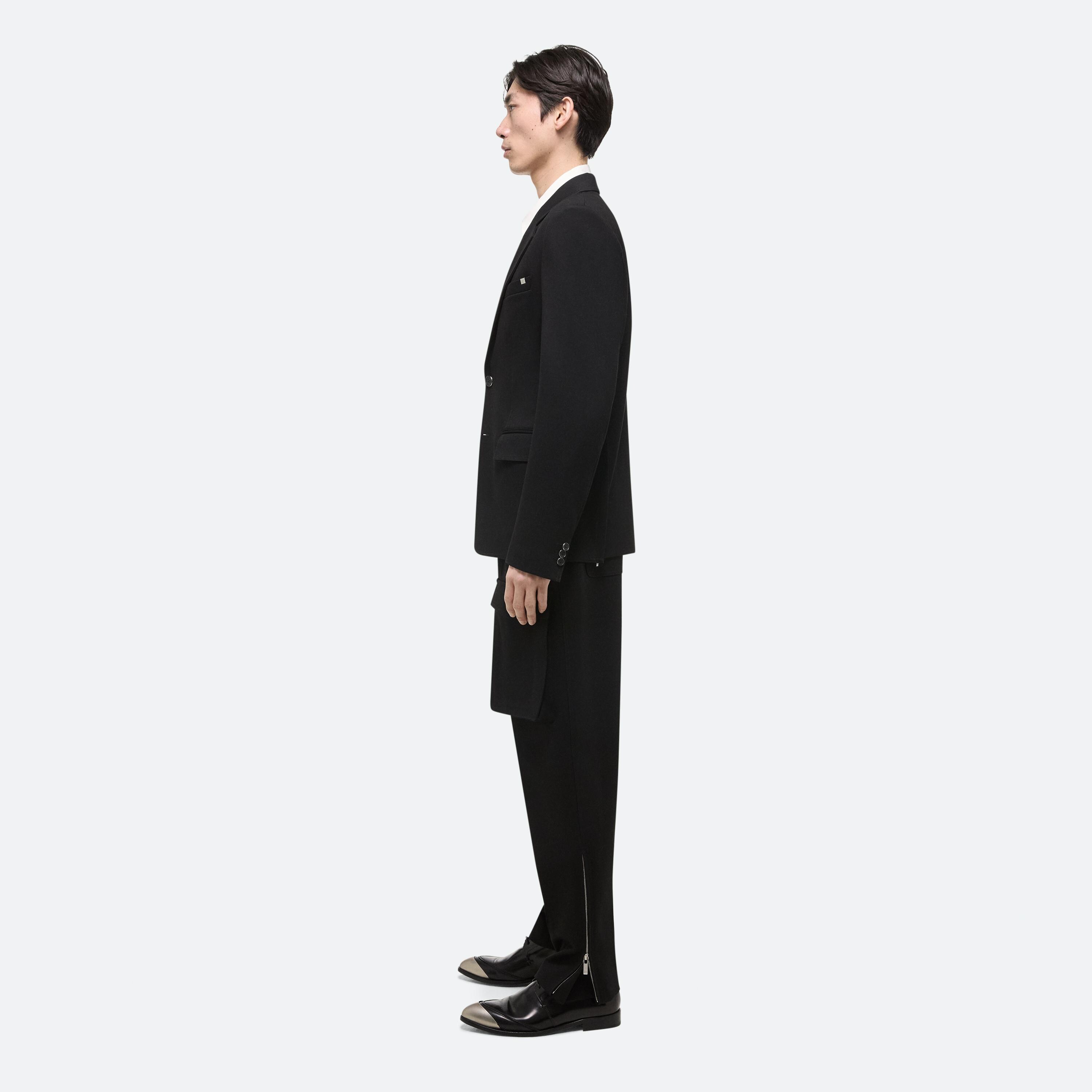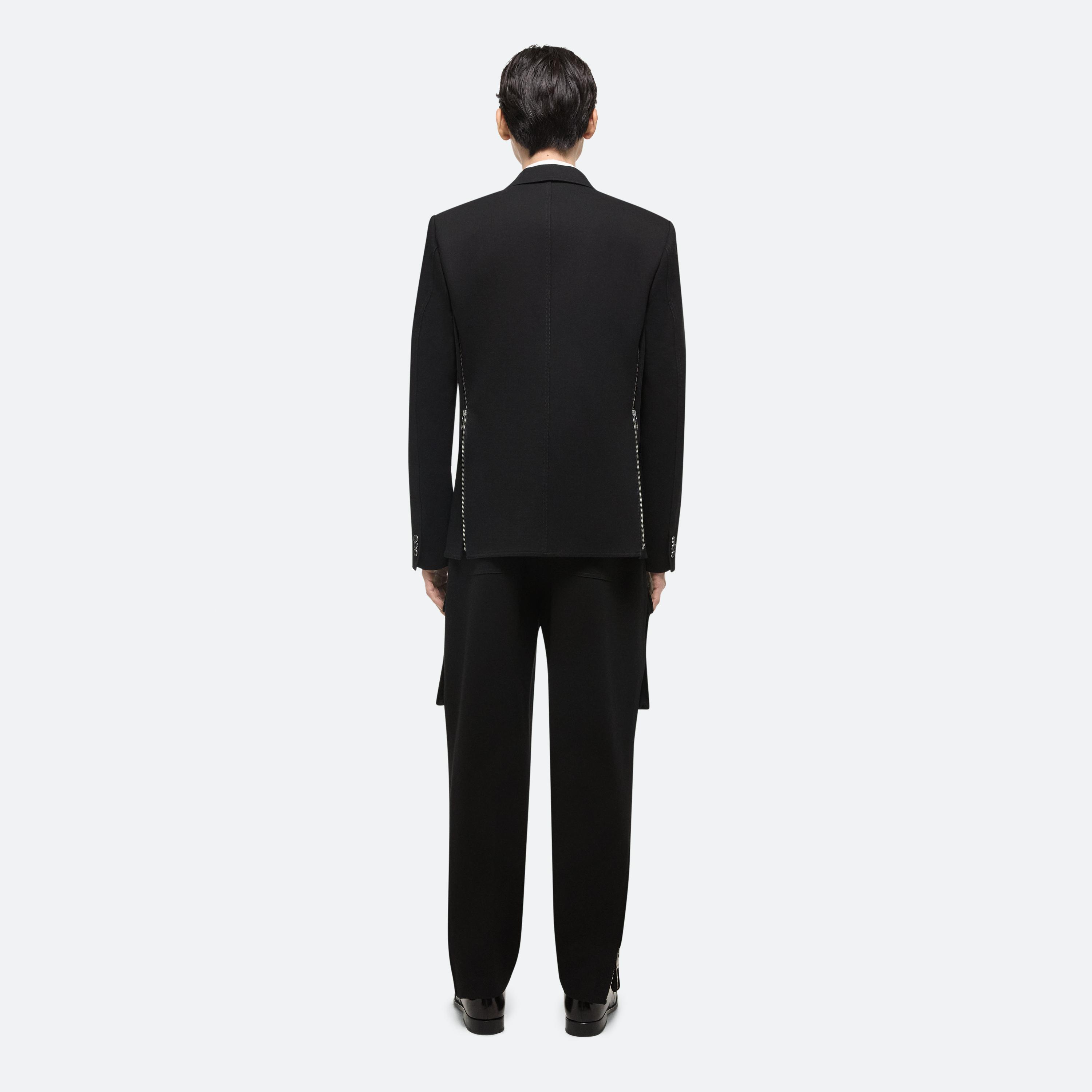 Classic blazer in structured ponte with notched lapels and flap pockets. Extended dual vents finished with zippers open to create a boxier fit.