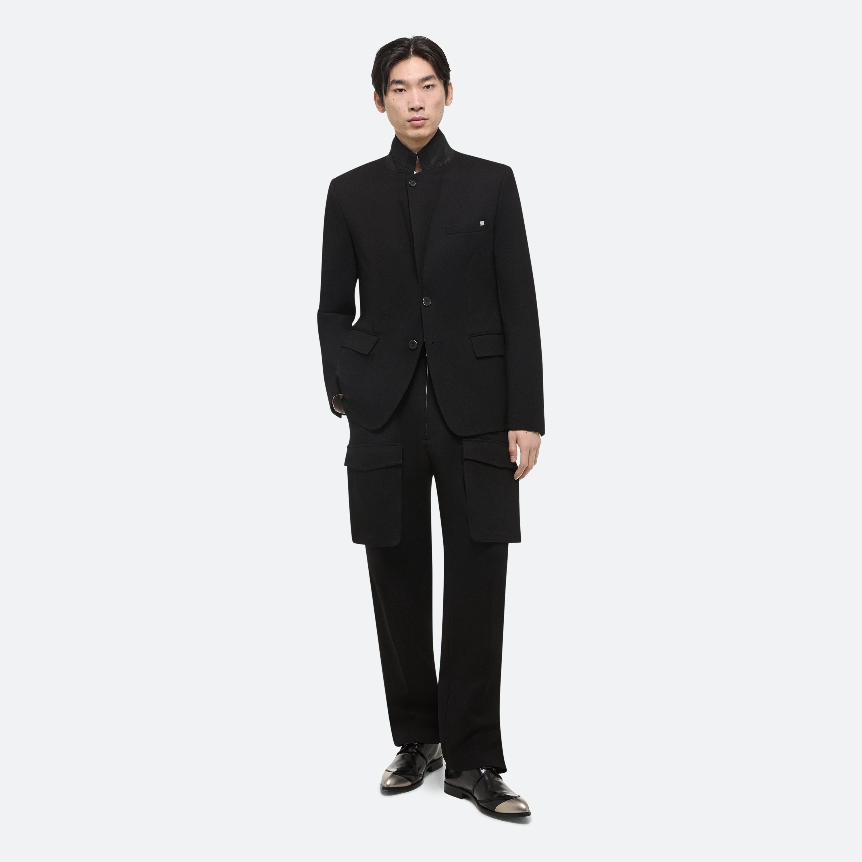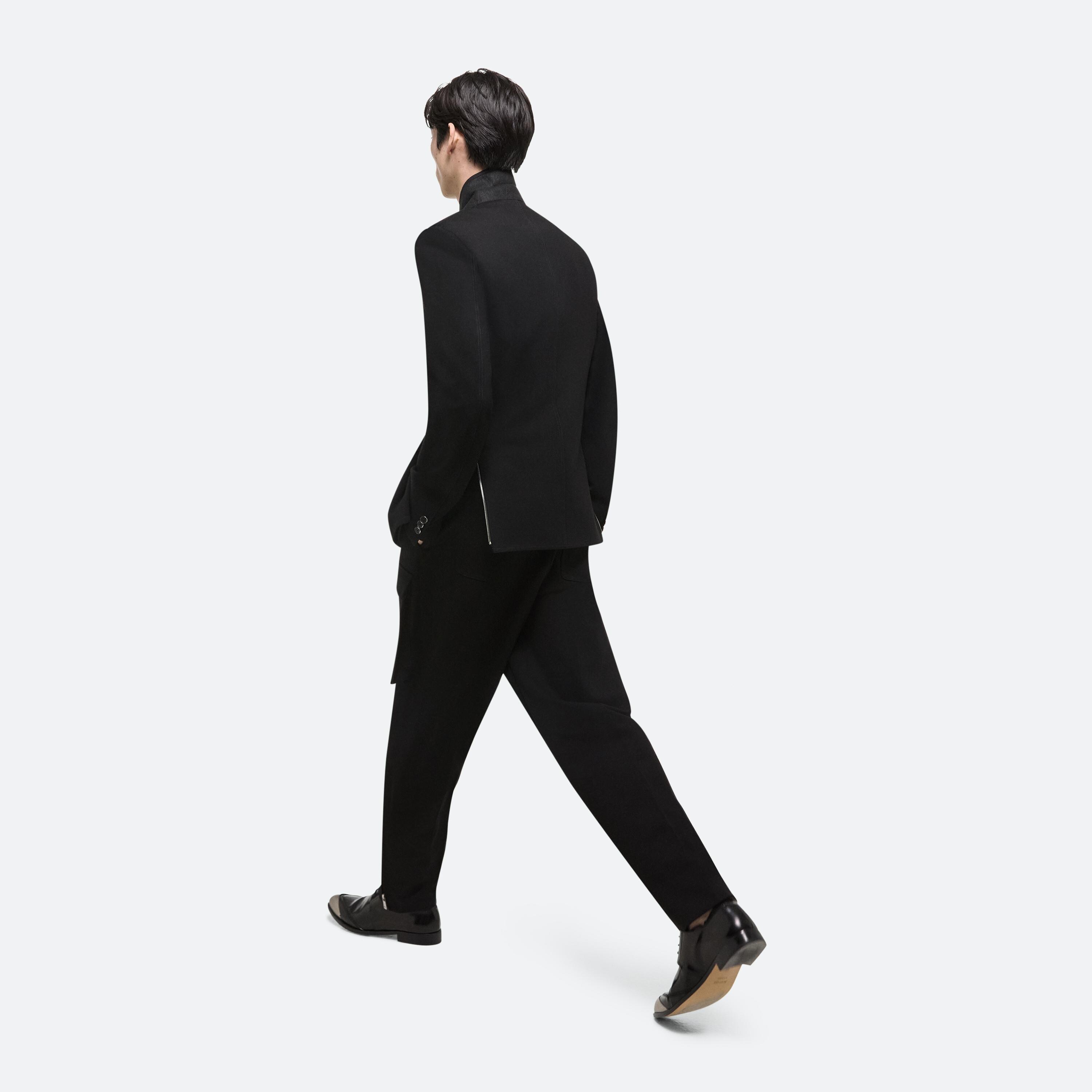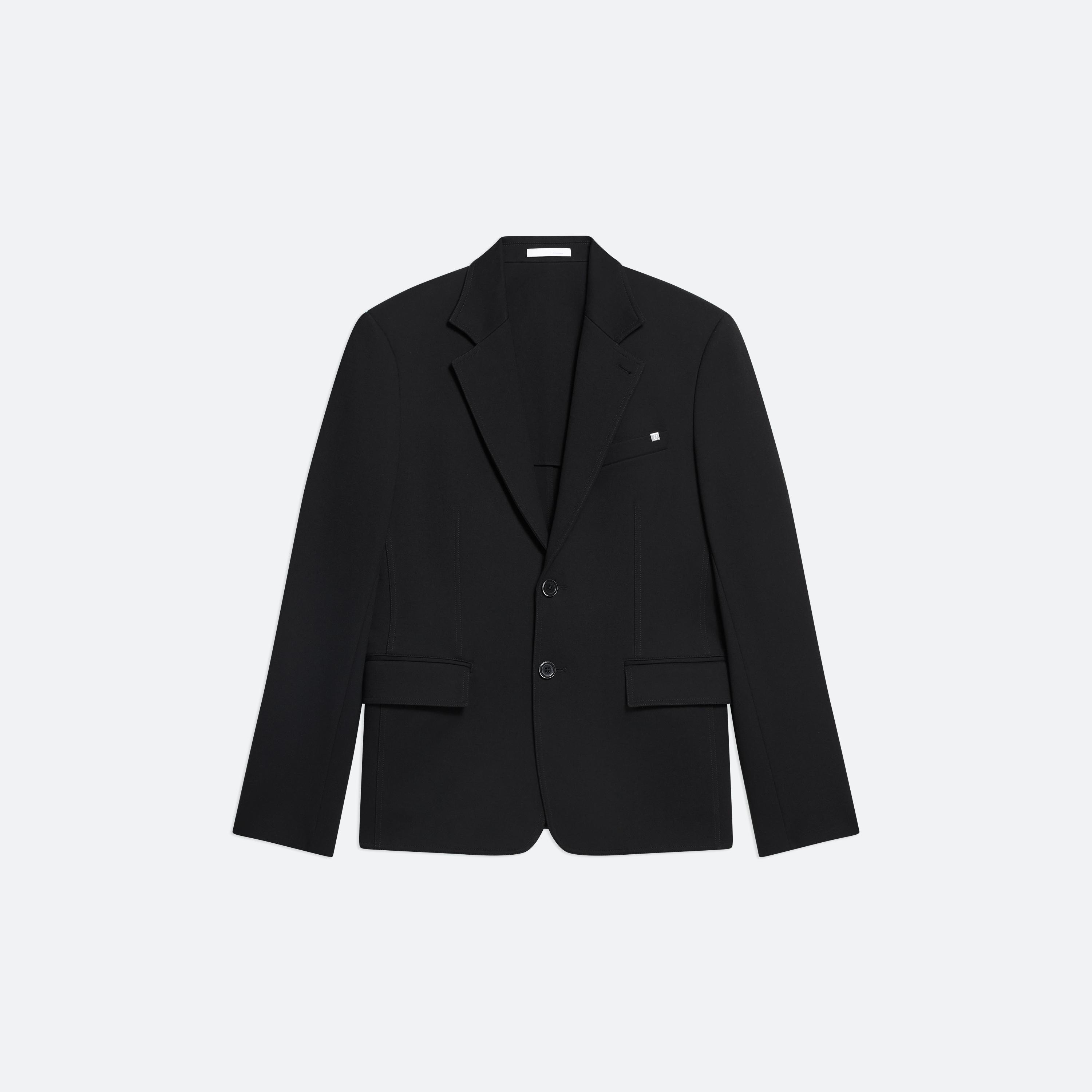 Classic blazer in structured ponte with notched lapels and flap pockets. Extended dual vents finished with zippers open to create a boxier fit.