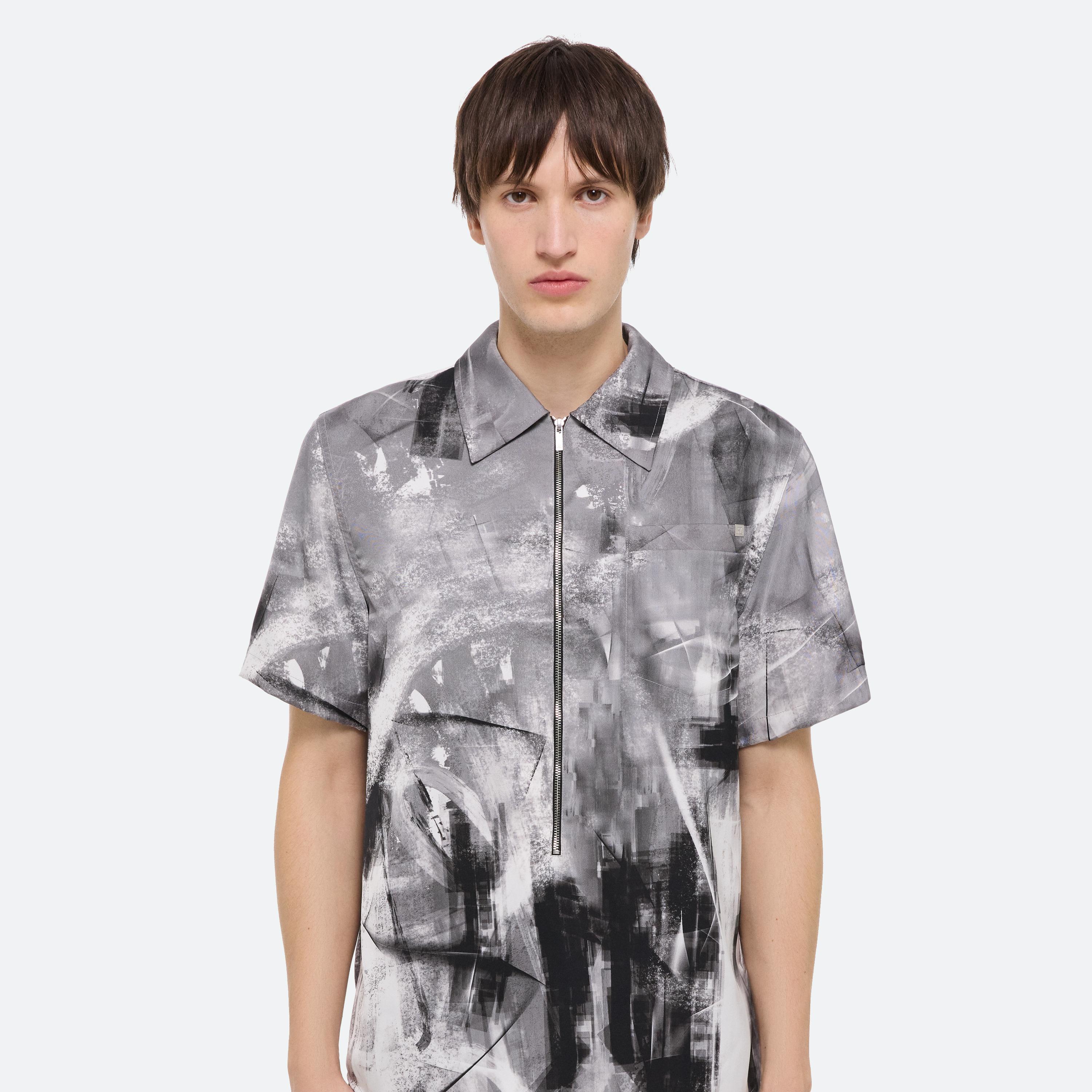 Short-sleeved shirt with exaggerated zipper in fluid twill. Features an all-over print created by Creative Director Peter Do.