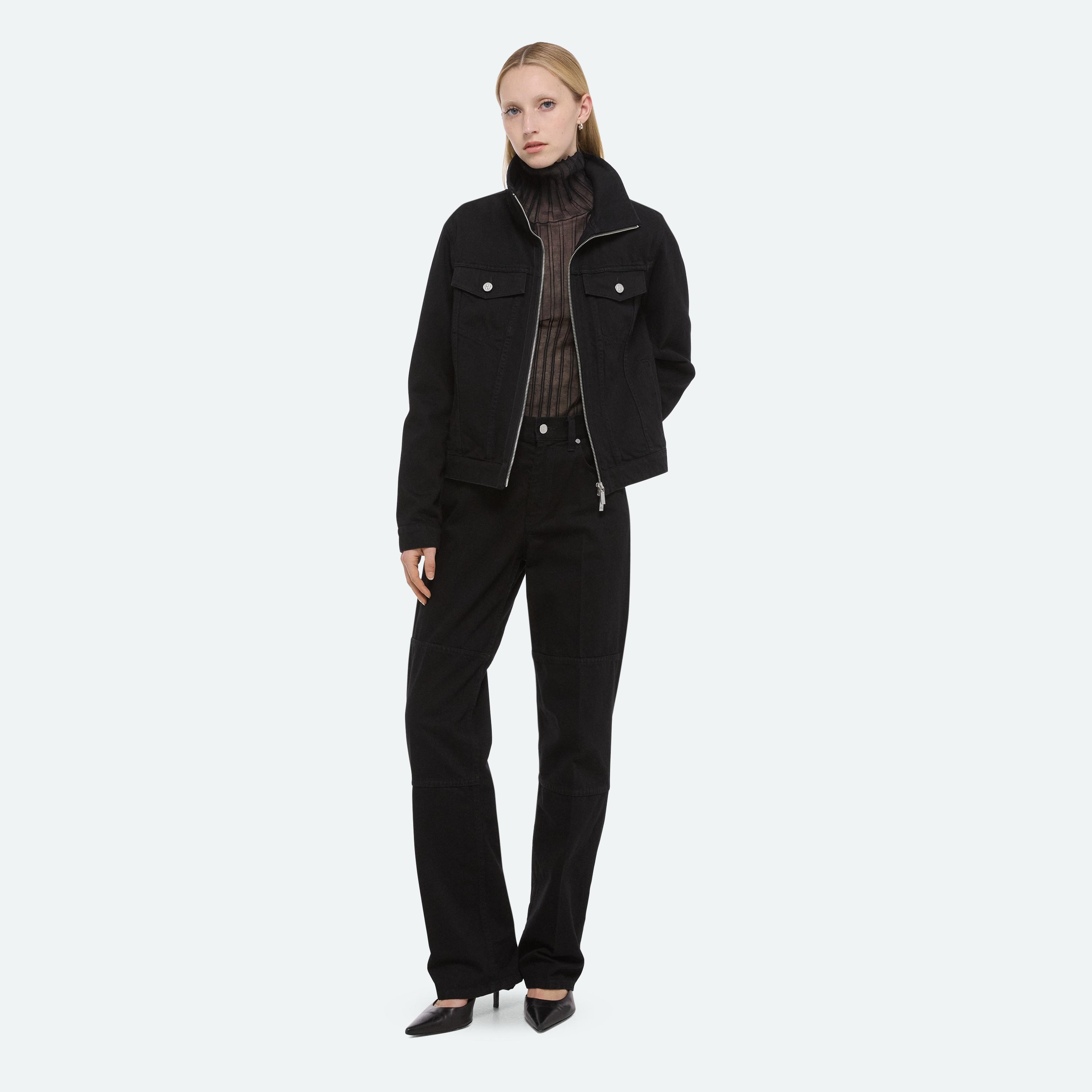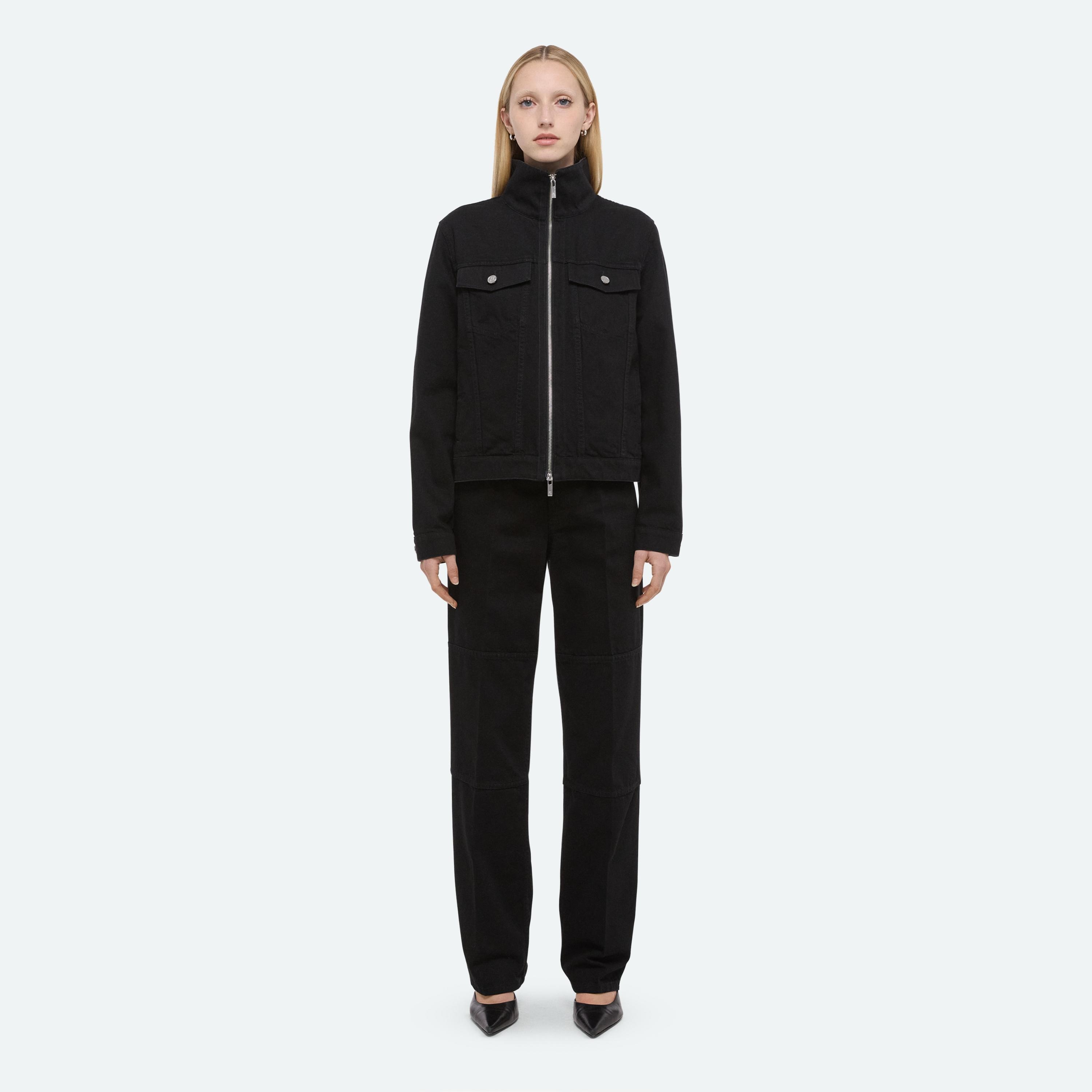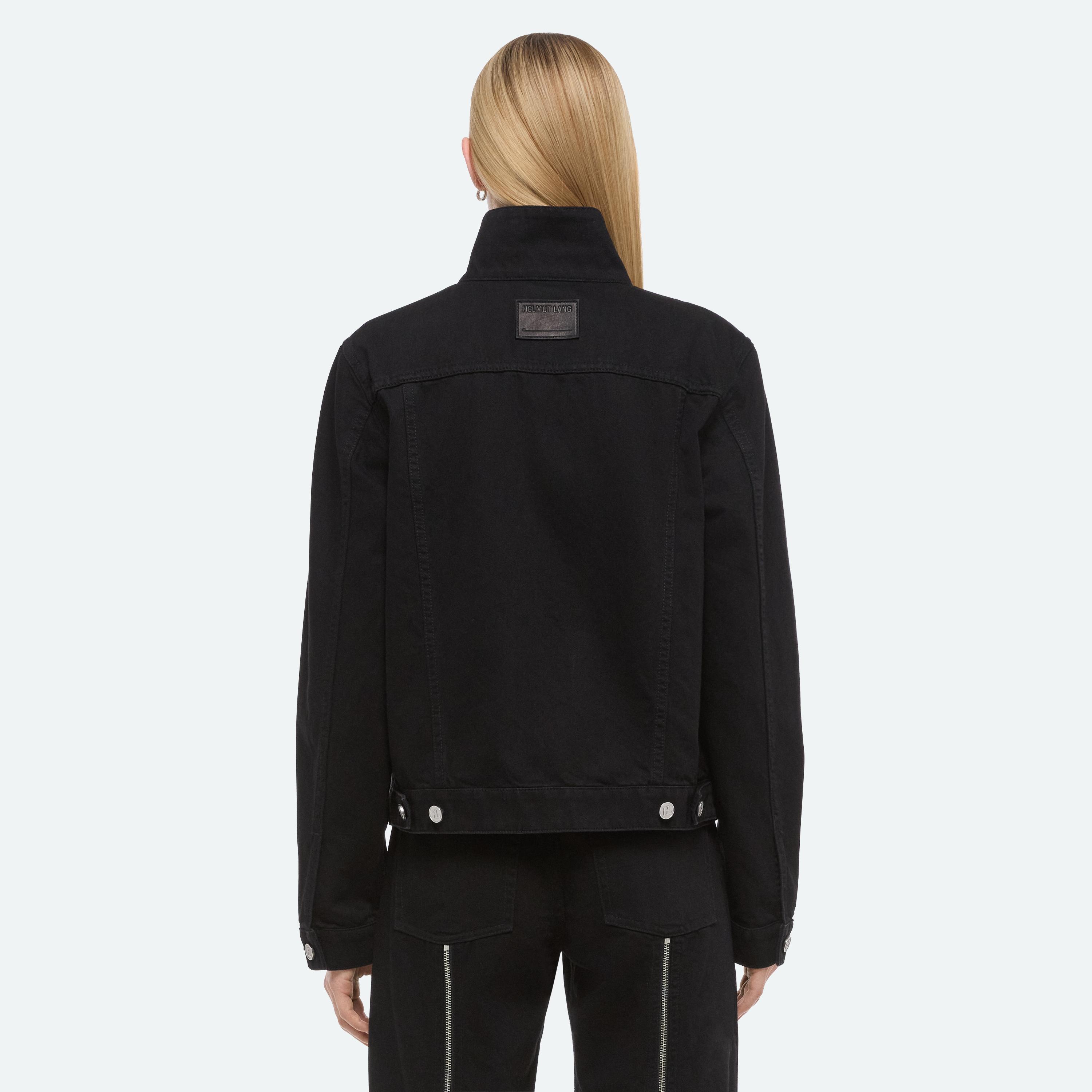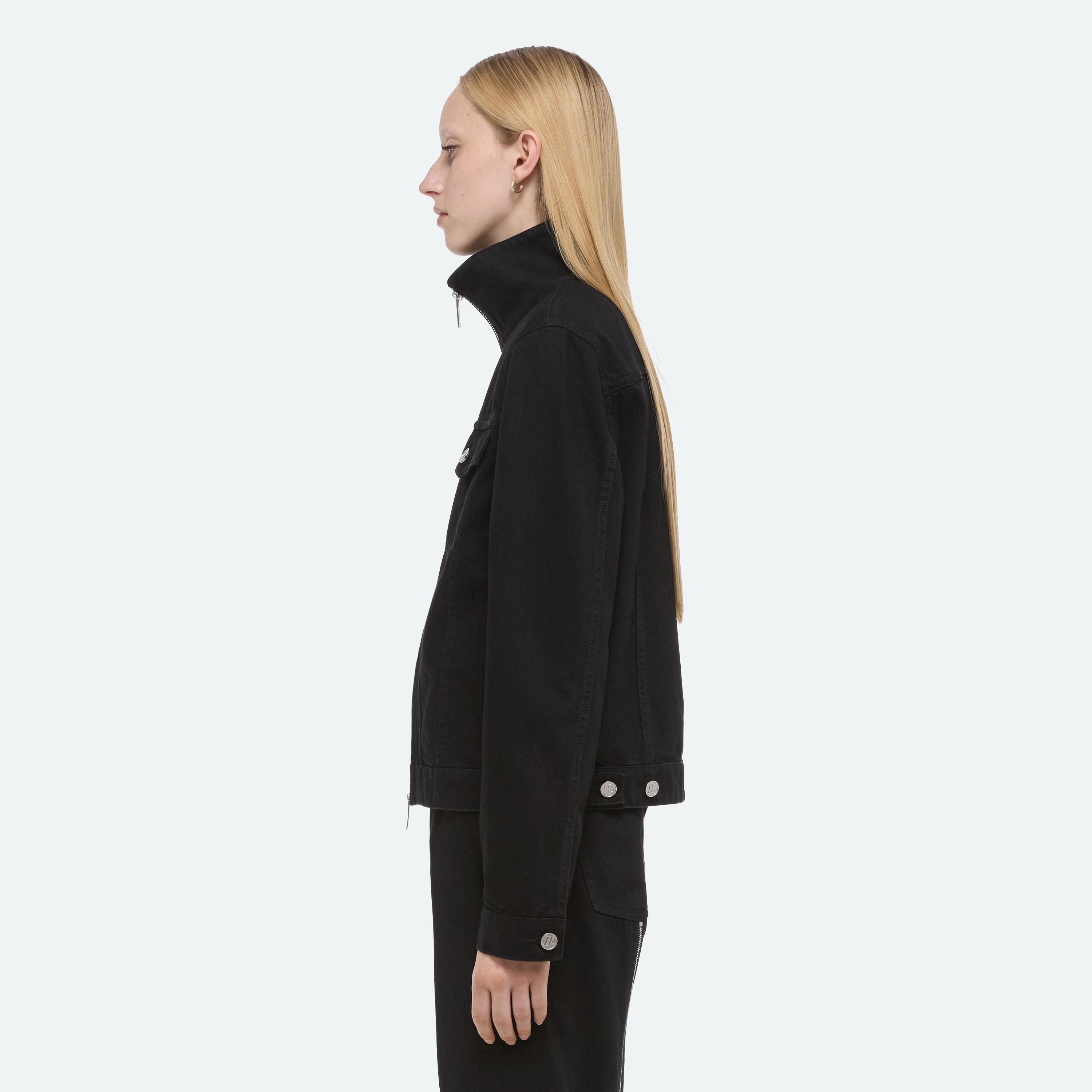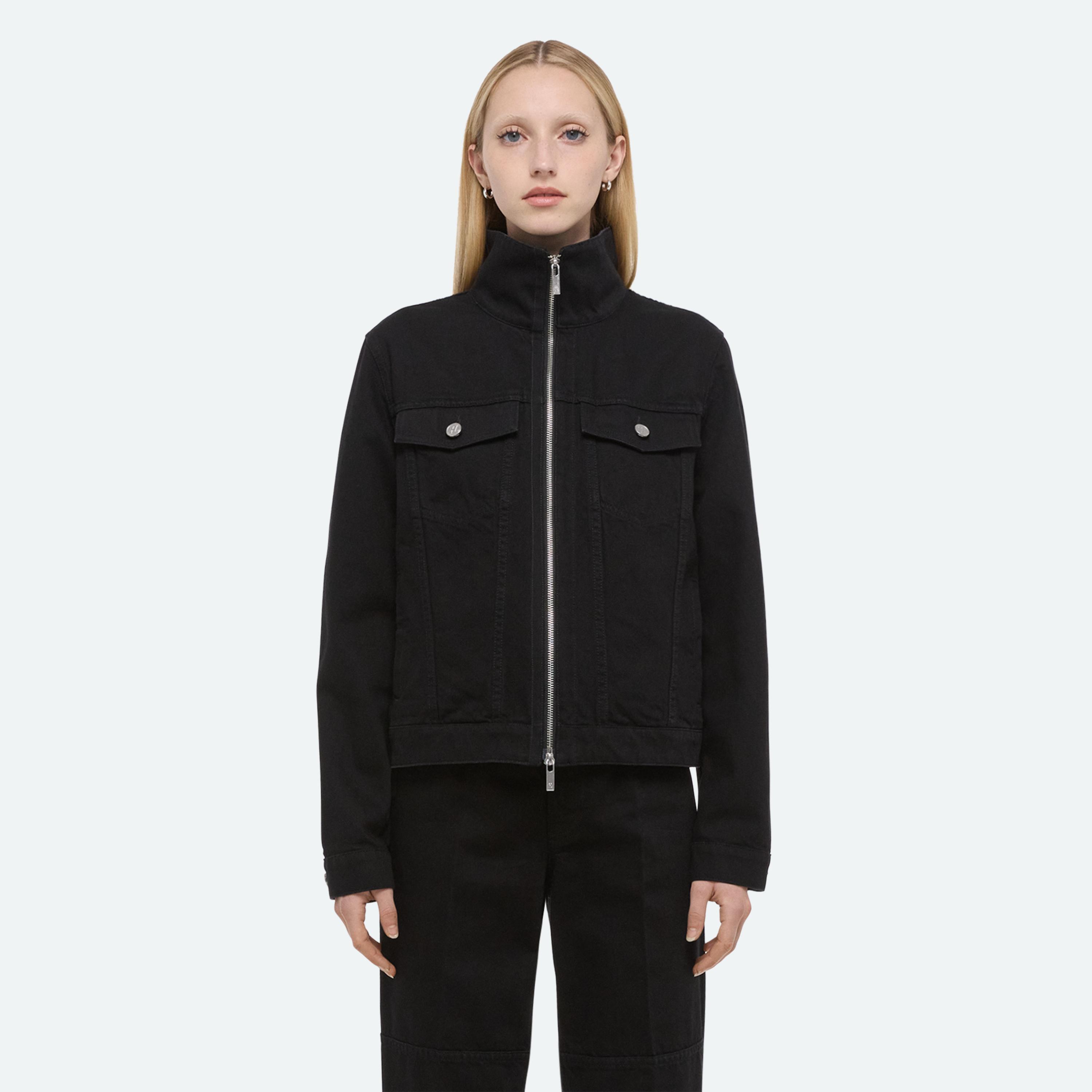 Denim jacket with zip front. Features a funnel neck and classic trucker details. Matches the Carpenter Mini Skirt.