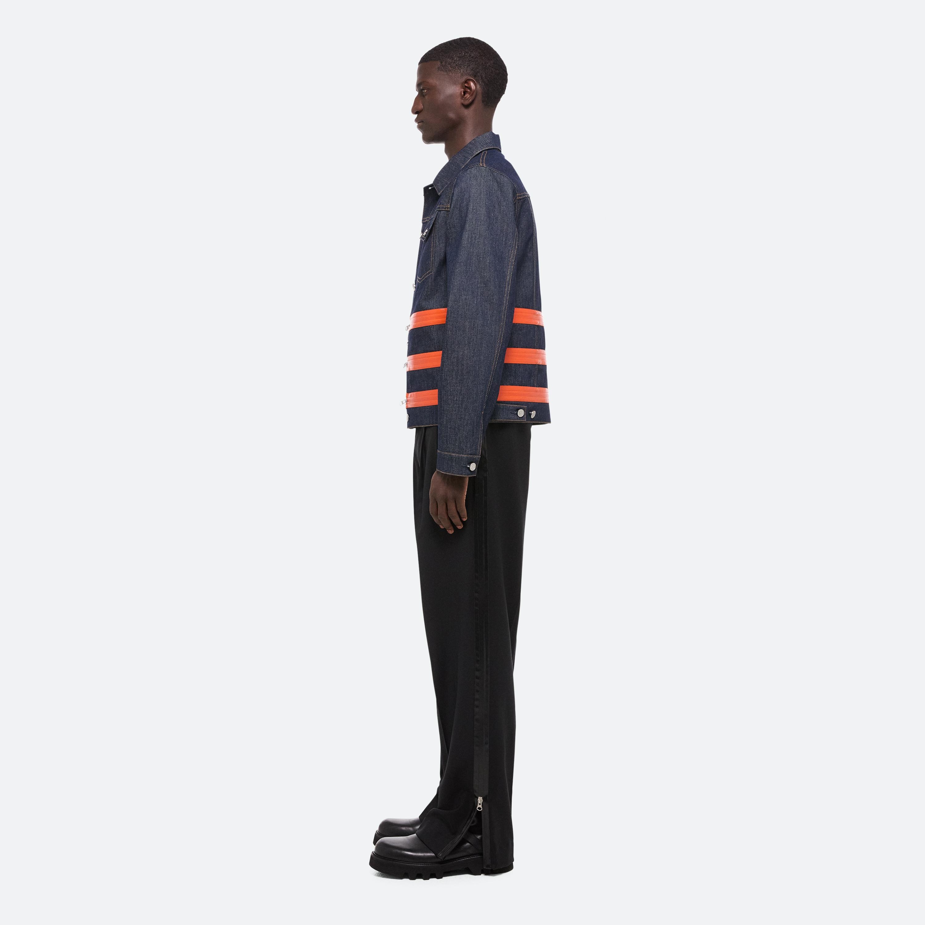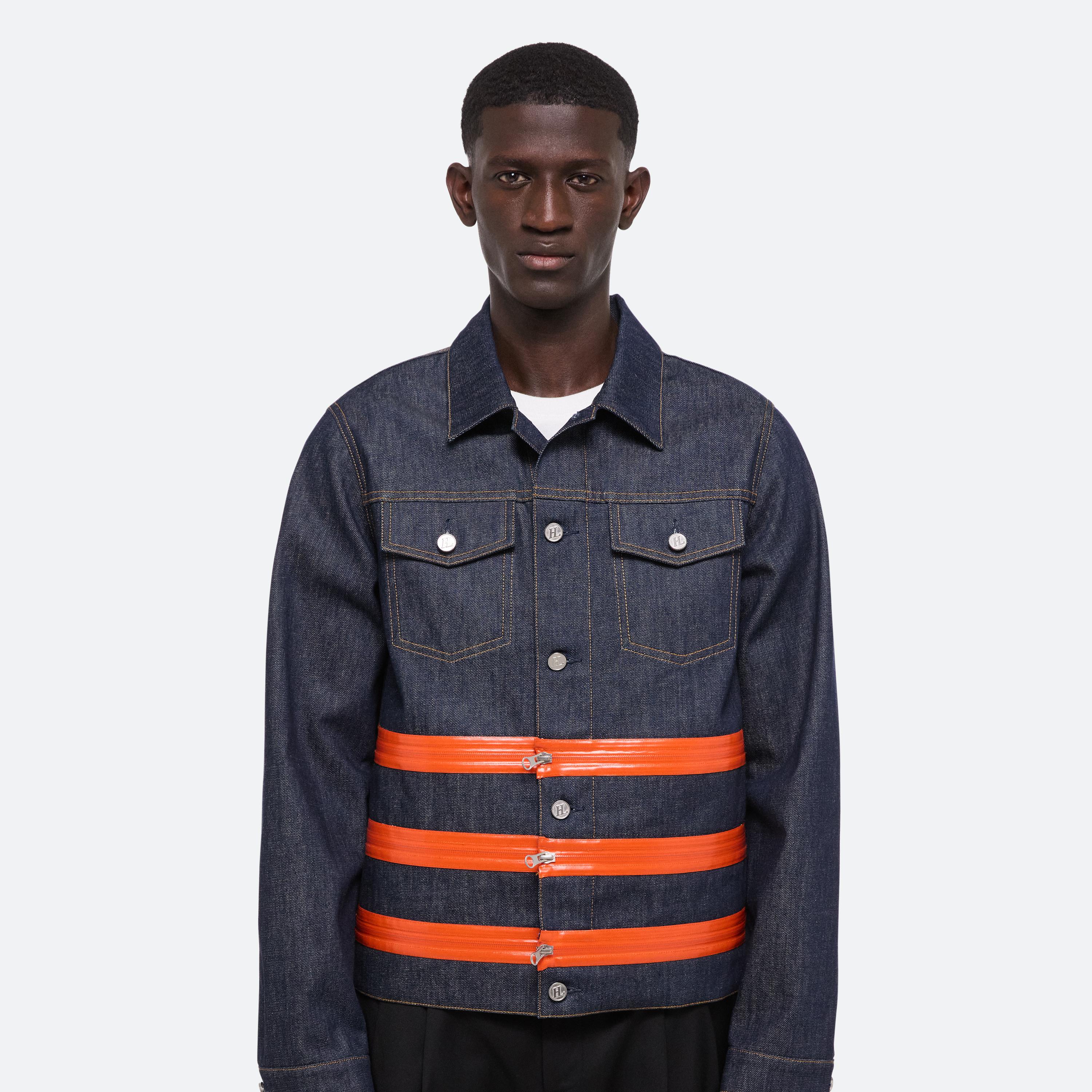 Denim jacket in a raw indigo rinse. Orange aquaseal zippers reimagine an archival detail as a transformative one, opening to control the length of the jacket and create a personalized look.