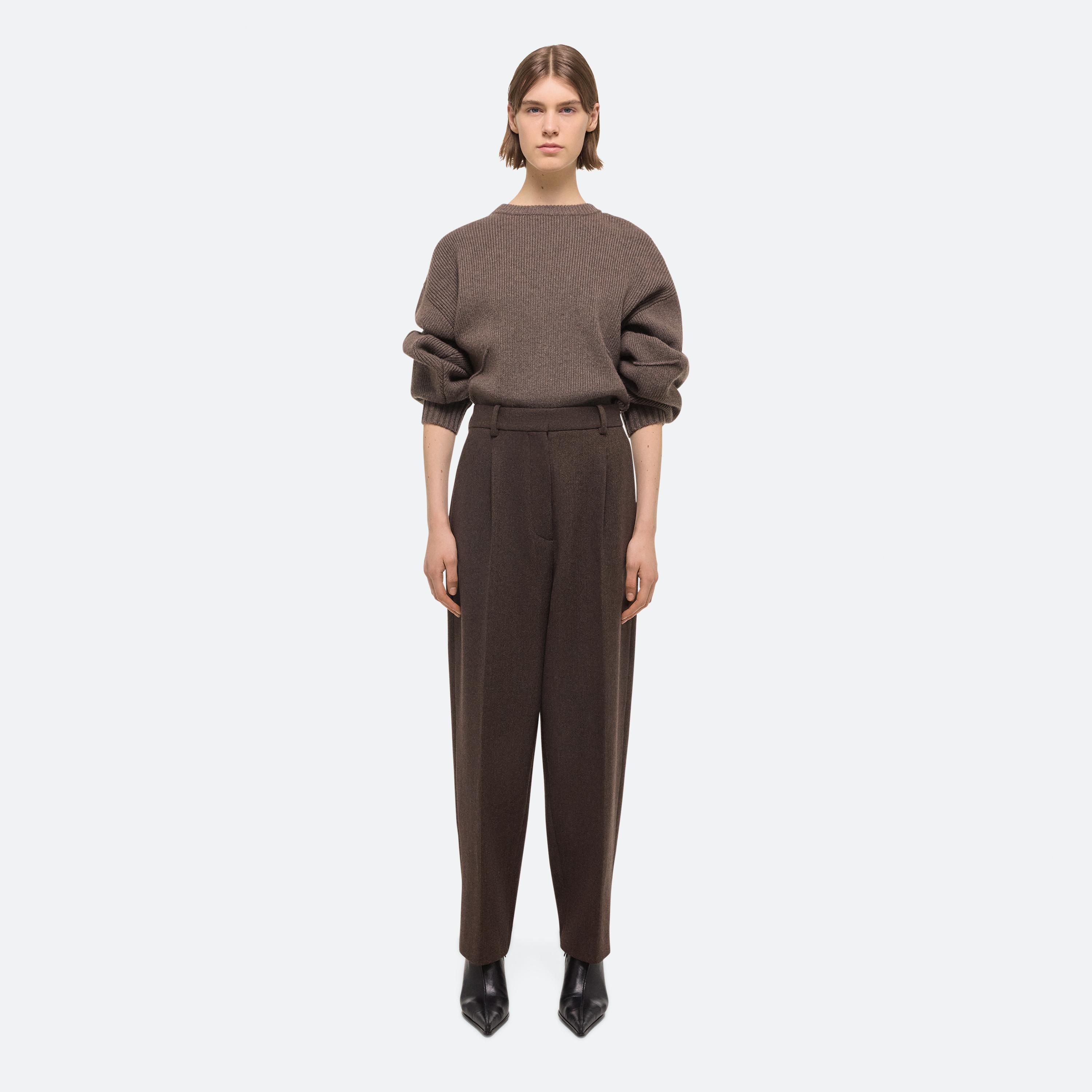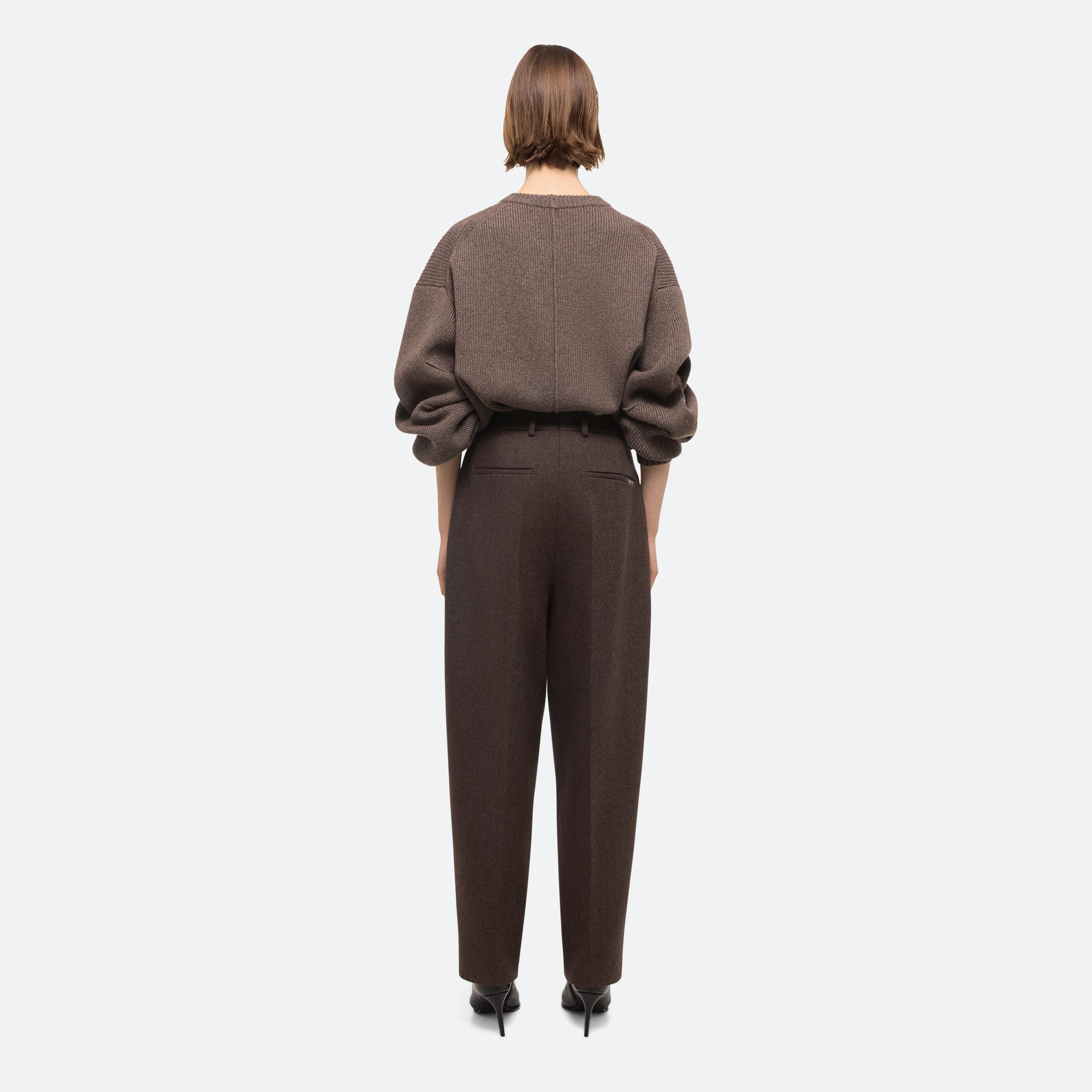 High-waisted trousers in a soft wool twill. Front pleats and a relaxed rise create a fuller leg that tapers at the ankle for a slight carrot shape.